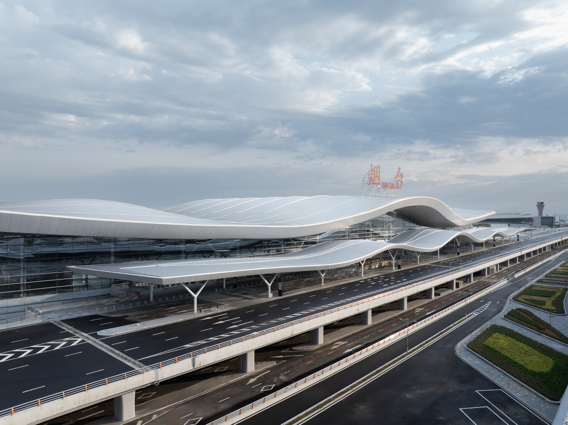 from the nearby Kunyu Mountain and Yantai’s coastal landscape to create a dynamic silhouette over the departure hall. A