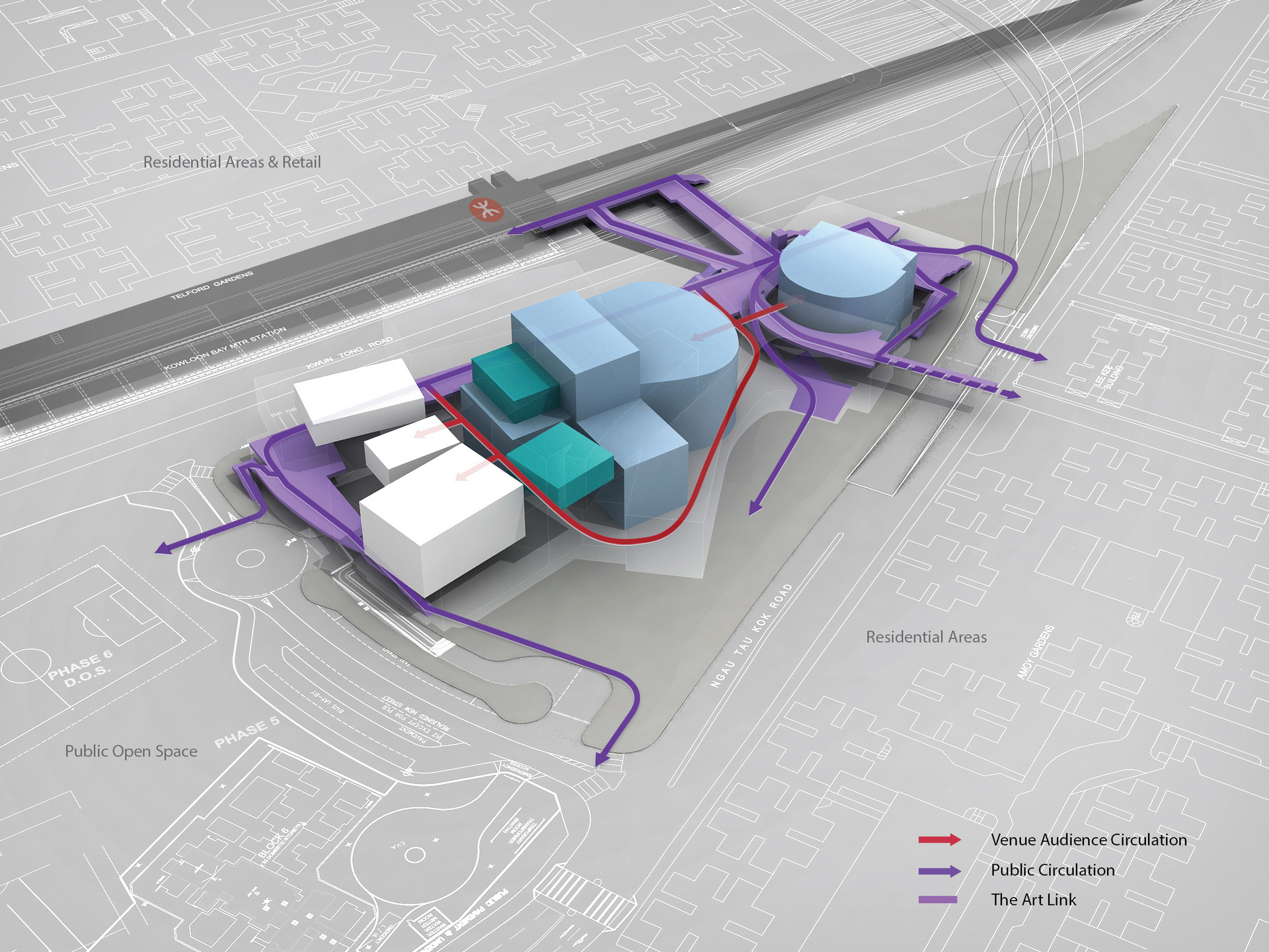 The building also serve as an “Urban Connector”. It is highly permeable, connecting seamlessly with the transportation nodes, forming an elevated pedestrian link – the “Art-link”. By intentionally bringing daily commuters through the Centre via a public route that intertwines but does not conflict with the activities of event users, the EKCC cultivates a culturally immersive environment that encourages interactions and encounters. The EKCC seamlessly infuse art and culture into the community.