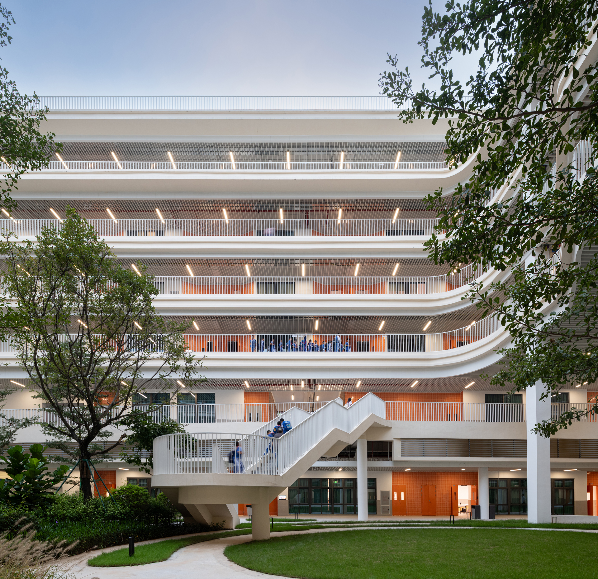 The central teaching axis interconnects multifunctional spaces for learning, socialization, sports, and recreation, threaded by layered circulation paths that enhance accessibility across floors and age groups. This framework intentionally blurs the boundary between classrooms and communal areas.