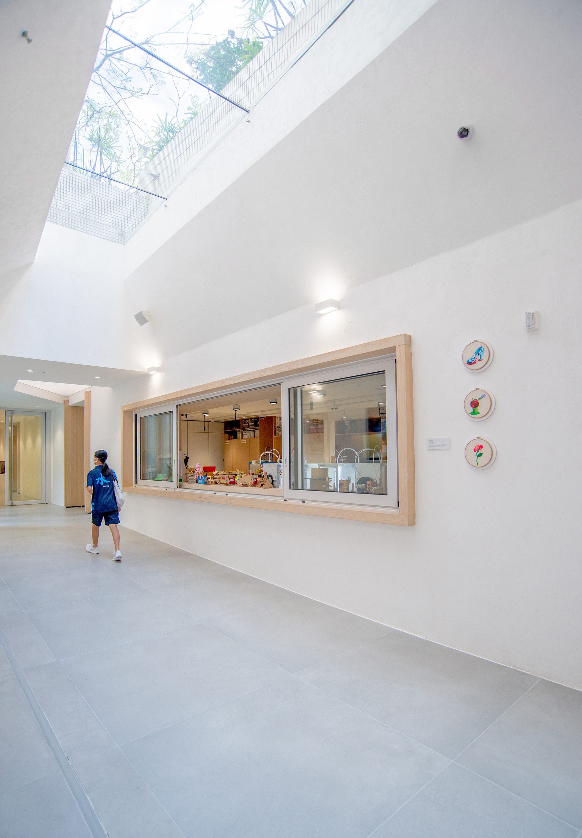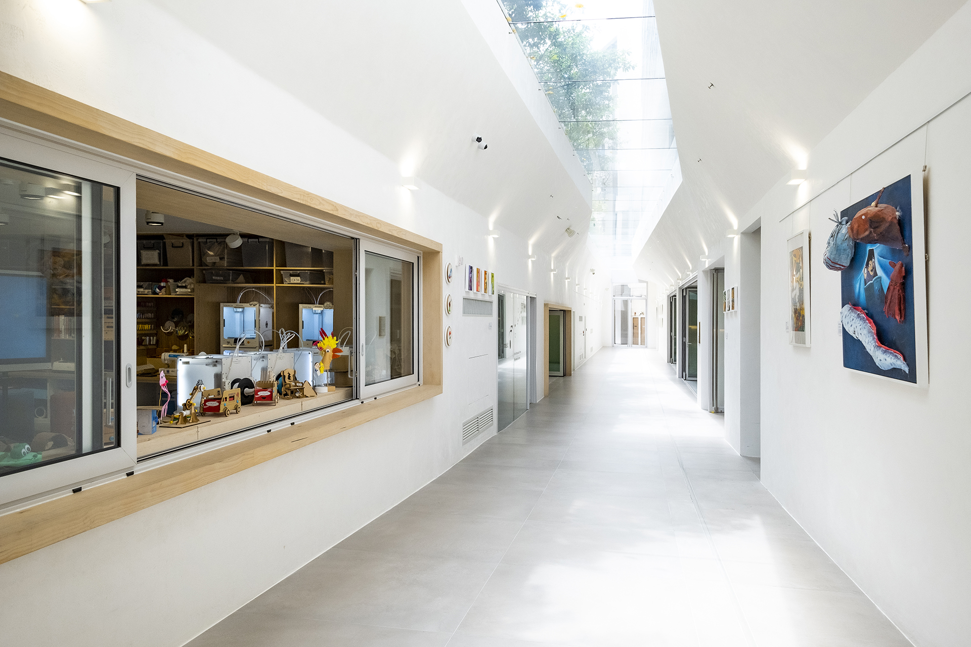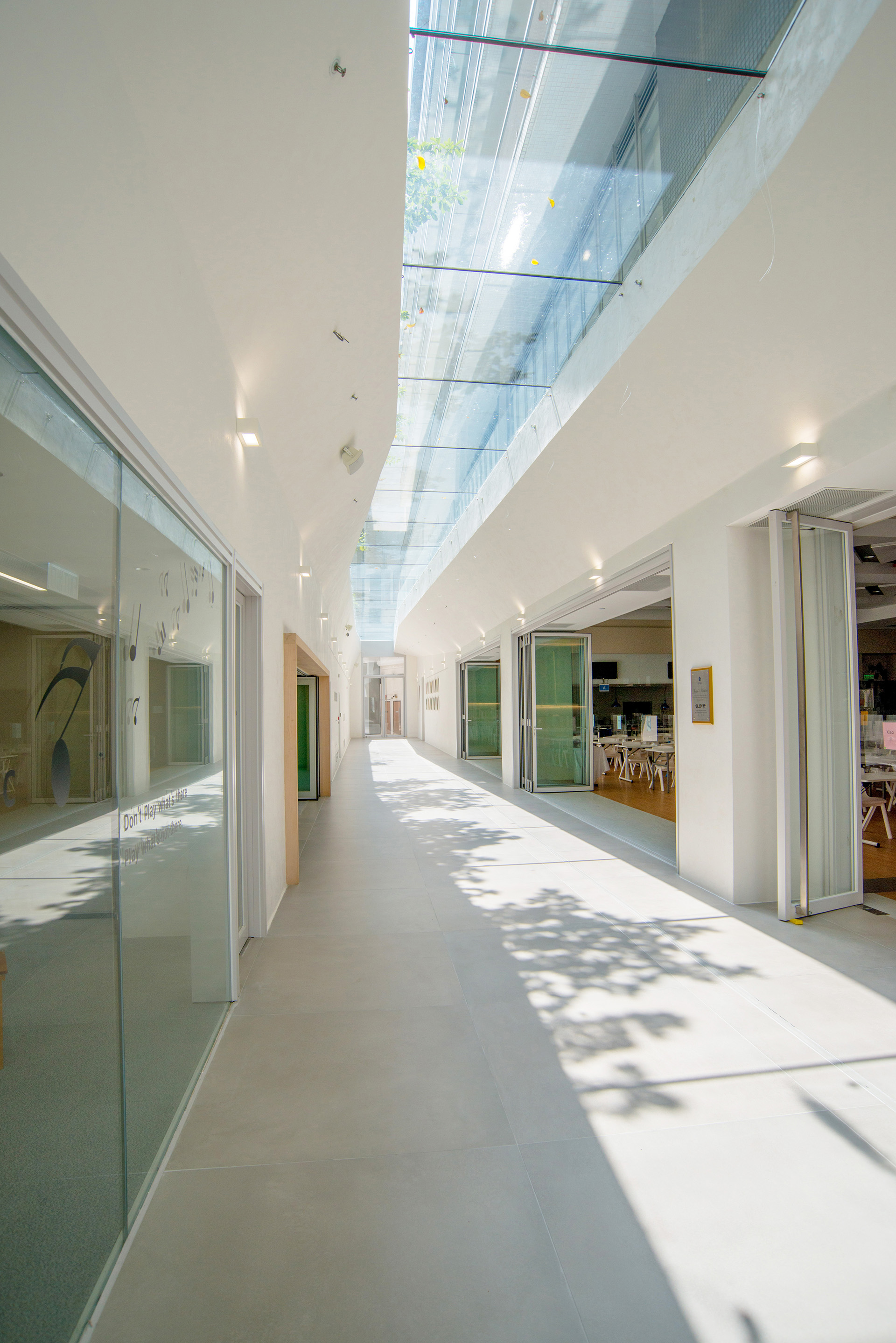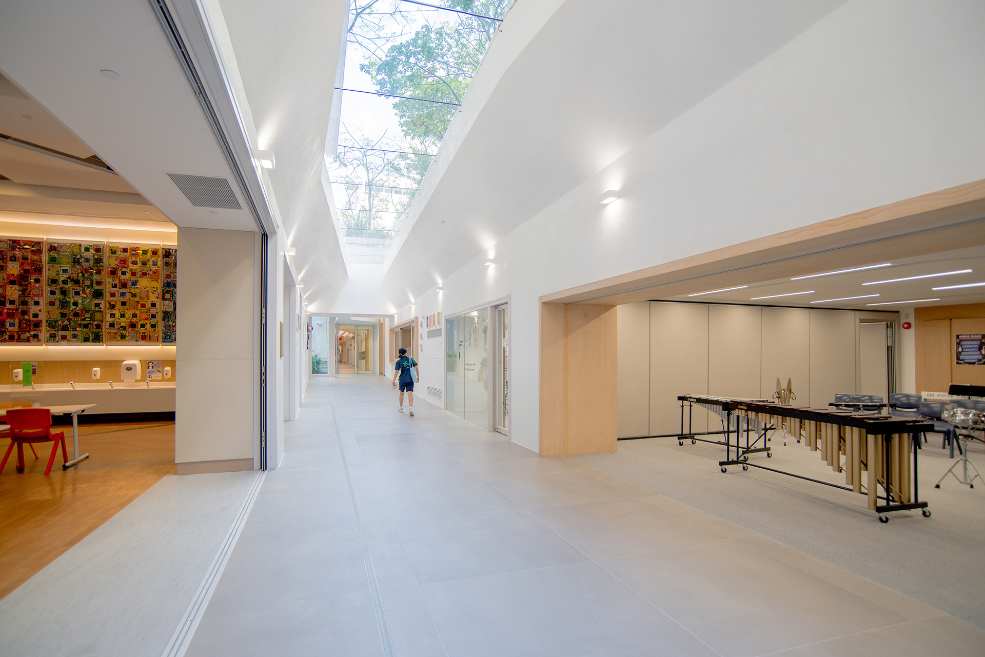 The semi-outdoor main spine is now an enclosed Gallery showcasing the school's vibrant life and student artwork. A zigzag skylight dissolves the linear language of the corridor, casting shadows as the sun's rays pour in. Transparency and sky connection define the design. The structure filters light through a pure form, creating an ethereal sense of space.