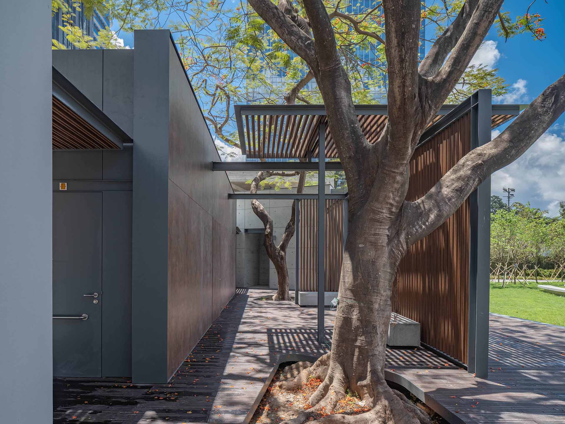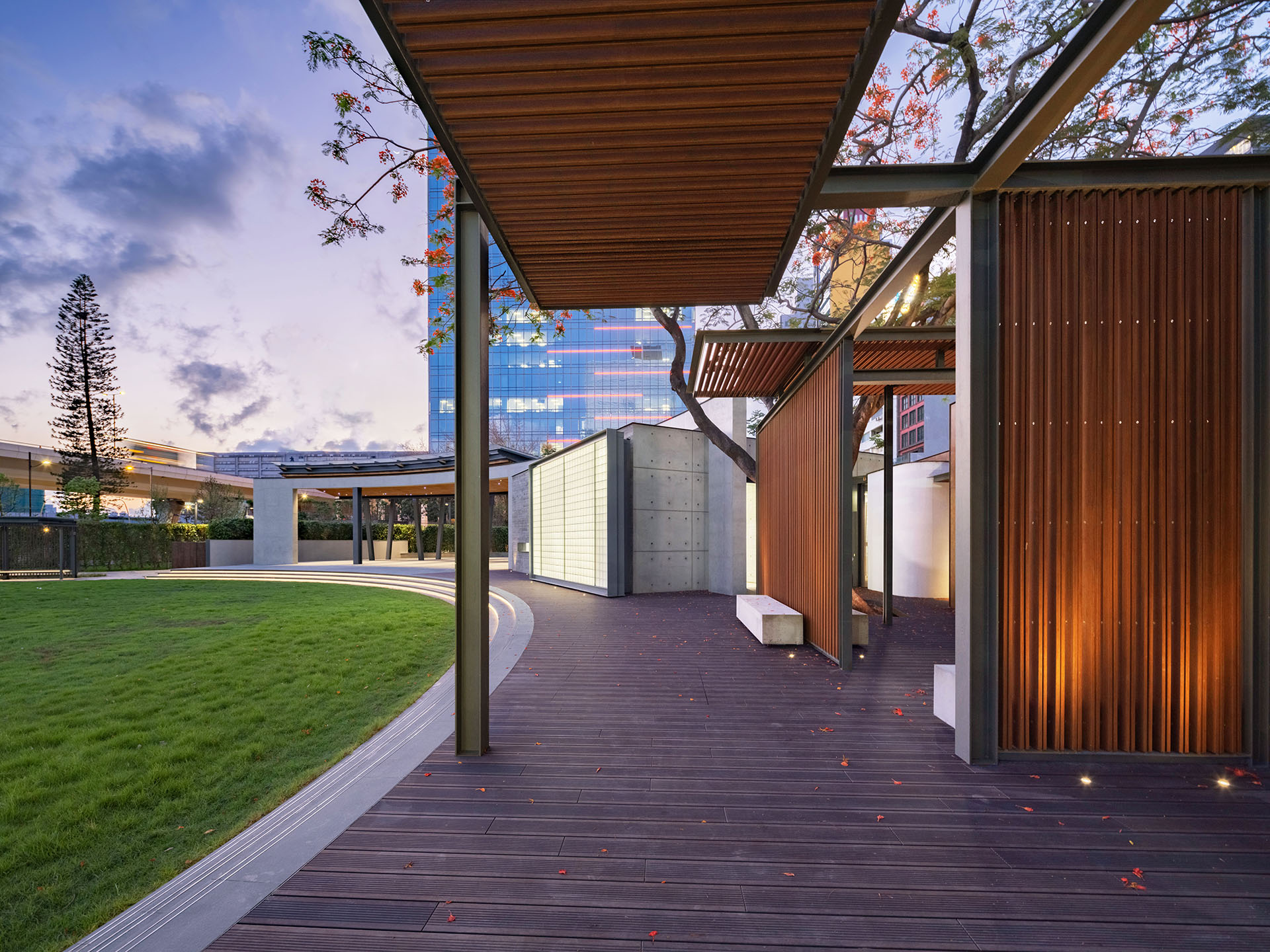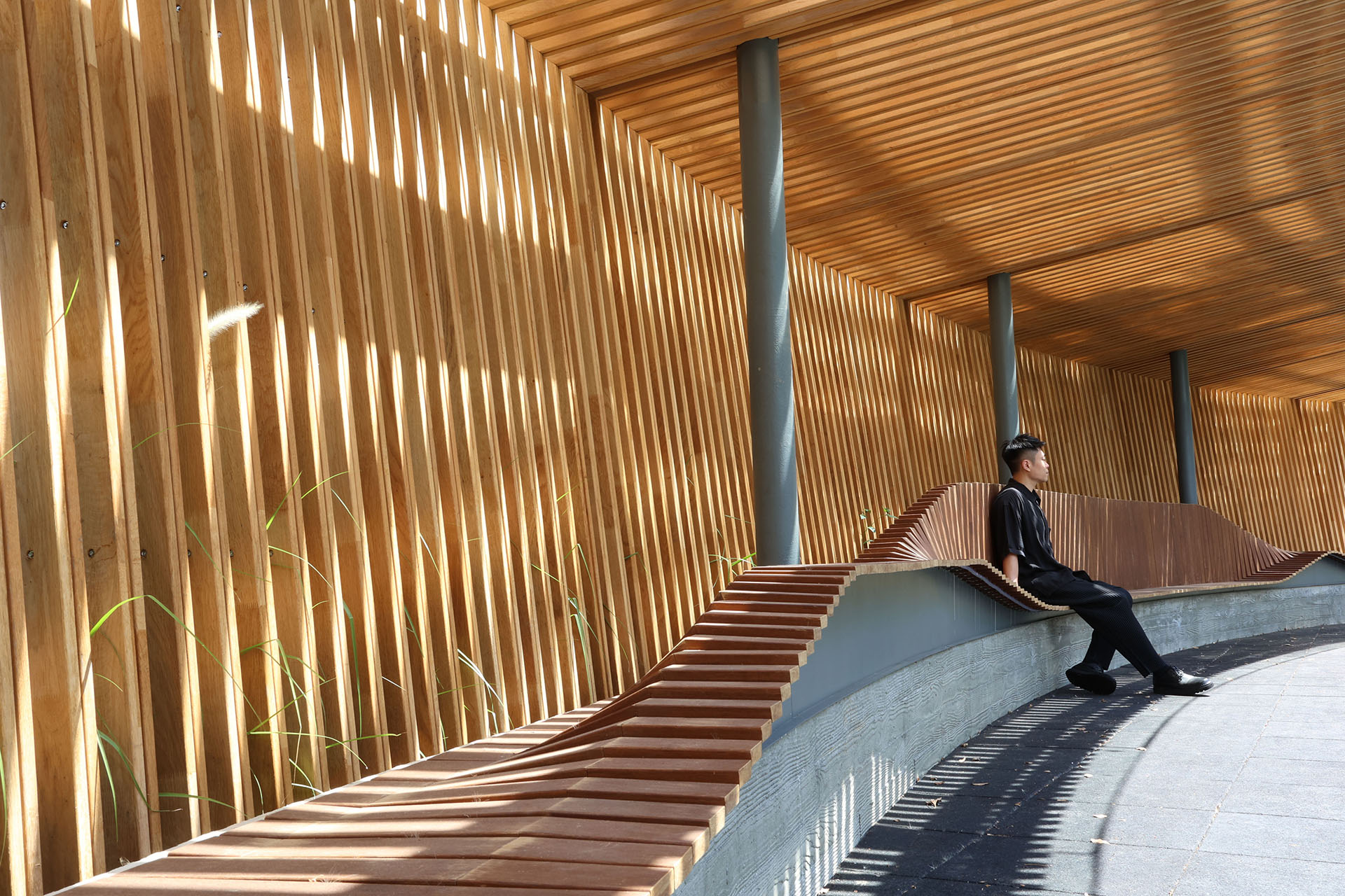 At the main stage of the circular lawn, which acts as the heart of the green urban foyer, a green oasis is created to bridge the very dense industrial urban district to the waterfront. The design comprises clusters of service blocks, timber shelters, layers of timber trellis and frames along the walkway, which interlaces with nature and landscape, as an embodiment of the central lawn. The mature existing trees were preserved, accounting for well over half of trees on site, and some of the woods, cut off from the felled trees, were adopted for park furniture fabrication.