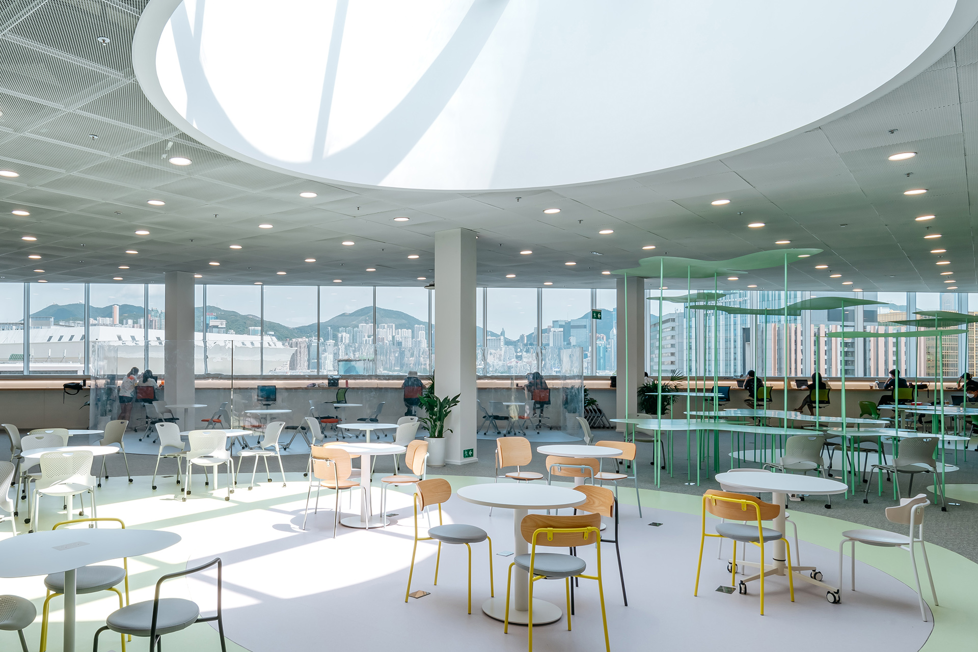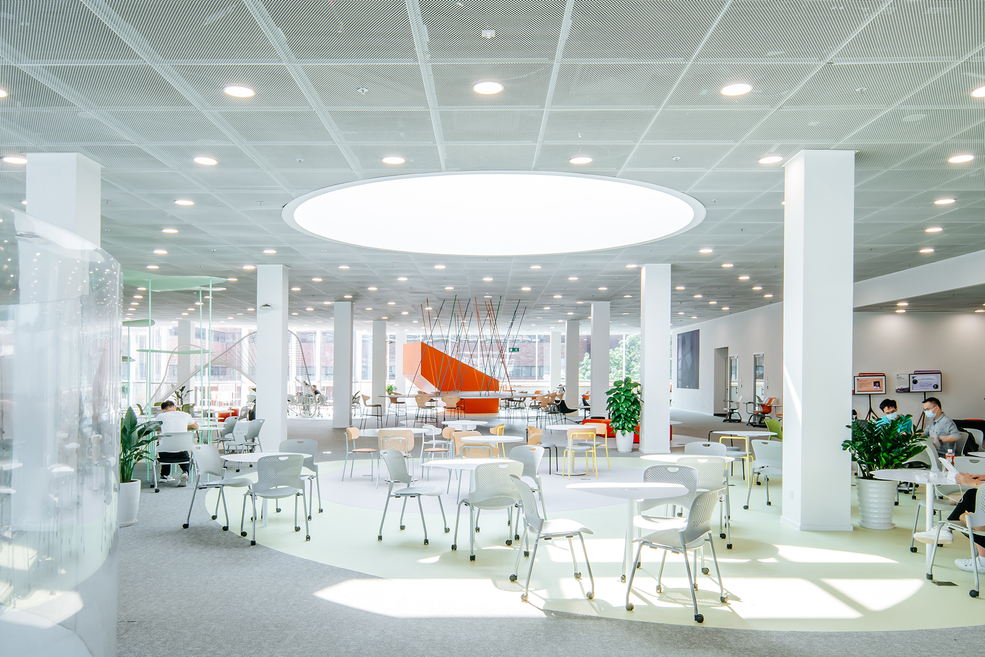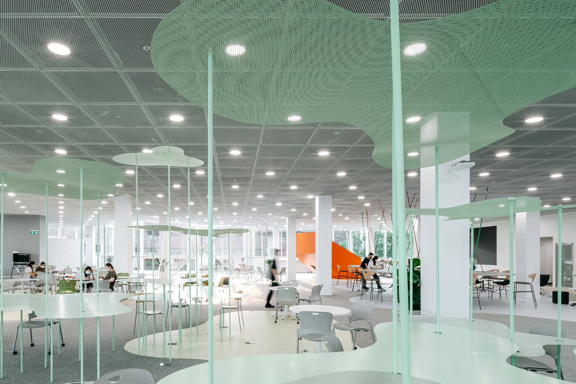 The flexible layout is engaged through a series of pavilions for specific programs. Each pavilion, such as the floating riser or the 20-meter-long table suspended from the ceiling in perfect load equilibrium, is uniquely designed to accommodate a wide range of activities at different scales, from individual quiet spaces to group workspaces for gathering or collaboration. This new interior organization strategy enables students to configure their own spaces and to have a greater sense of ownership of the space.
