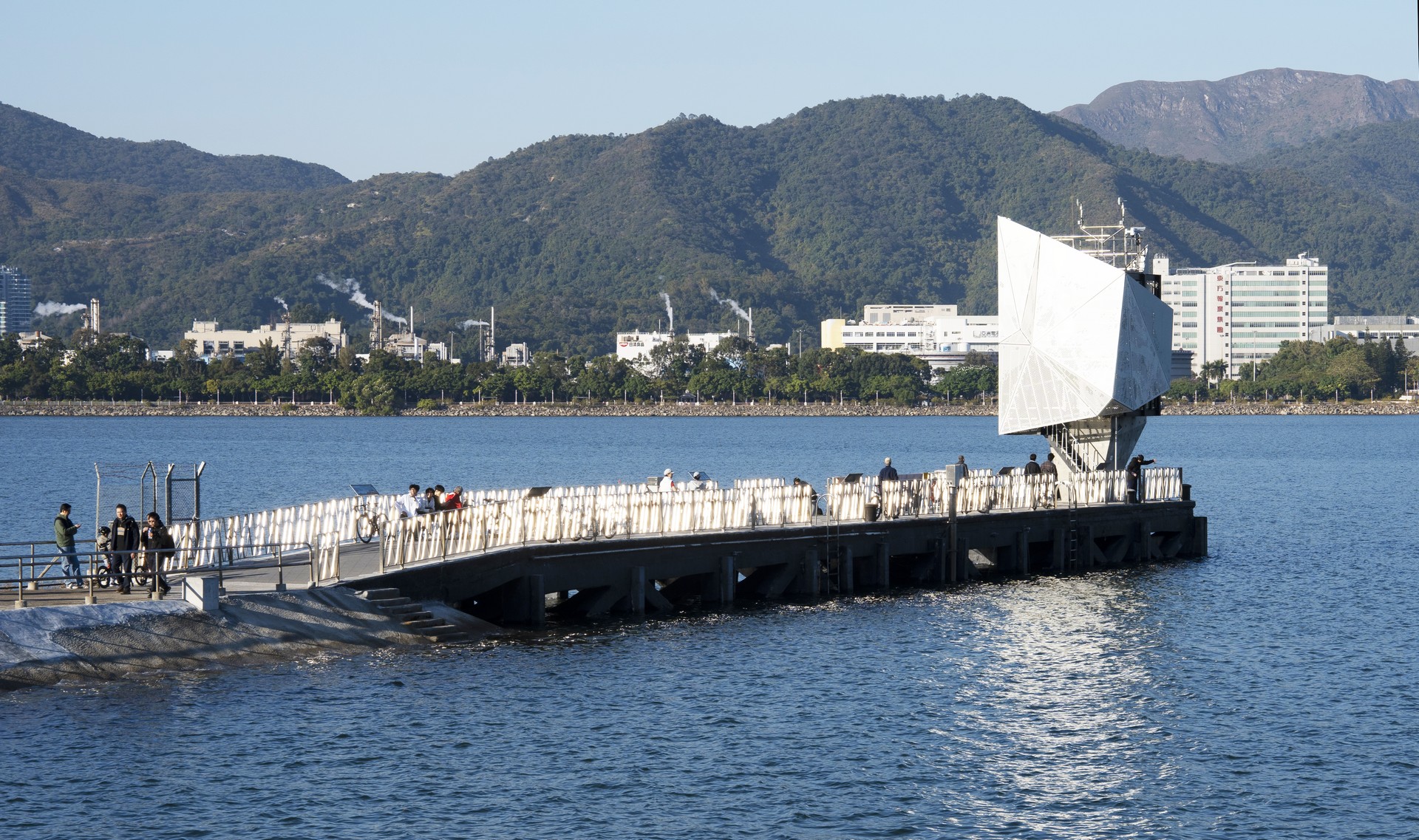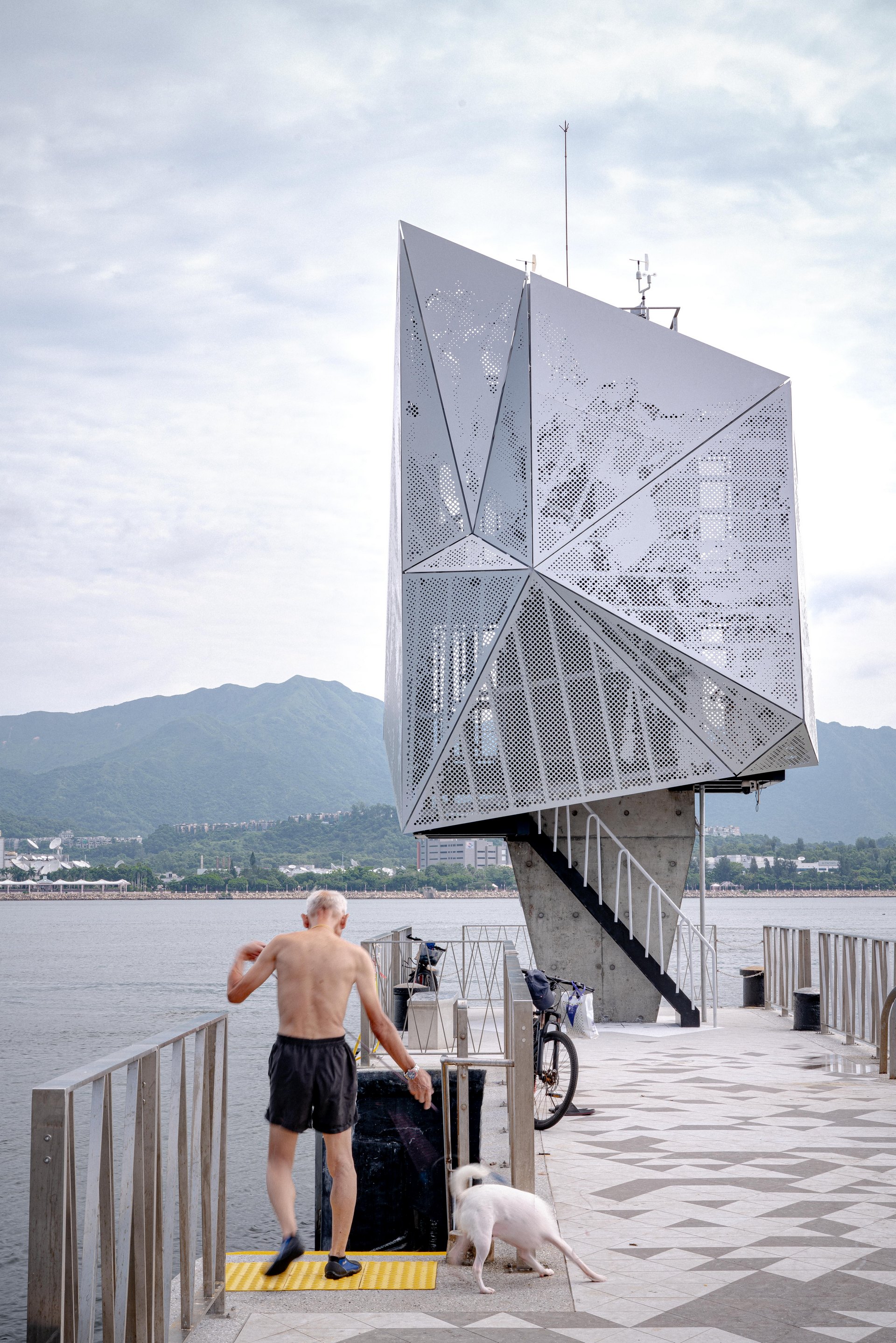 The Tai Po Kau Tide Gauge Station adopts the metaphor of an iceberg to highlight the urgency of climate change. To replace the former box-shape station situated at the end of Tai Po Kau Railway Pier, the new design drew inspiration from its coastal setting, surrounded by Pat Sin Leng and Ma On Shan ranges. The sculptural form resembles a glacier tip rising from the sea, symbolizing melting ice and rising tides due to global warming. A fair-faced concrete core anchors the structure, while a cladding system of perforated aluminum and mirrored stainless steel mimics ice crystallization and interacts with sunlight to animate the façade. An exposed stilling well, marks historical storm surges, alerting public about the past impacts. This station serves as a physical reminder of the threat of global warming, making the station both a scientific facility and a climate awareness landmark.
