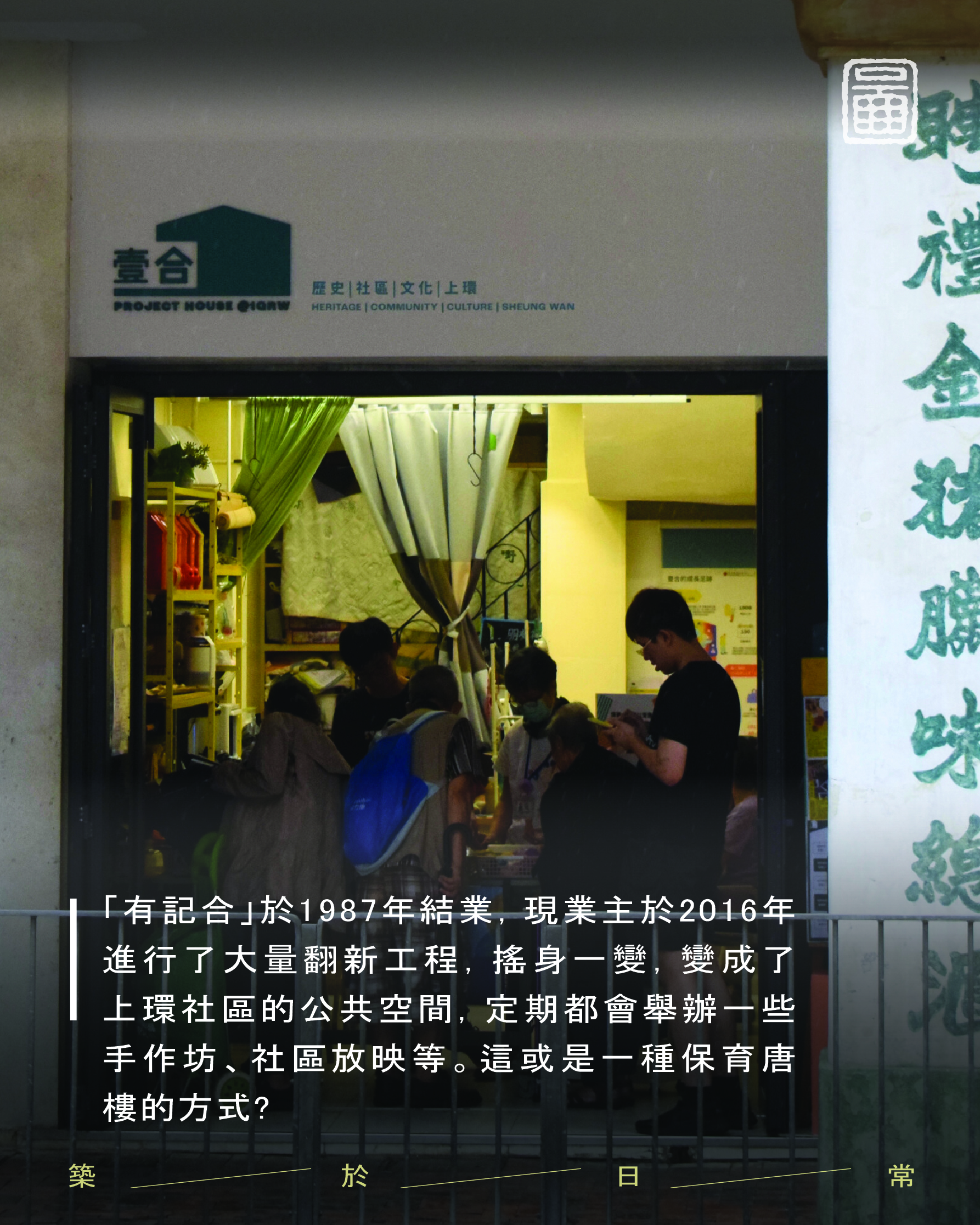 A representative example is “Number 1 Queen’s Road West,” also known as Yau Kee Hap, a second-generation tong lau built in or before 1926. In 2010, it was listed as a Grade III historic building, and is one of only seven remaining corner tong lau. Its ground floor once housed the famous Yau Kee roasted meat shop, with the owner’s family living on the upper floors, while the rooftop served as a workshop for preserved meats — a classic example of “shop below, residence above.” The shop closed in 1987, and in 2016 the building was acquired and carefully restored. Today, Yat Hap has been transformed into a community hub - Project House in Sheung Wan, operated by One Bite Design Studio, hosting regular workshops, community screenings, and cultural activities.