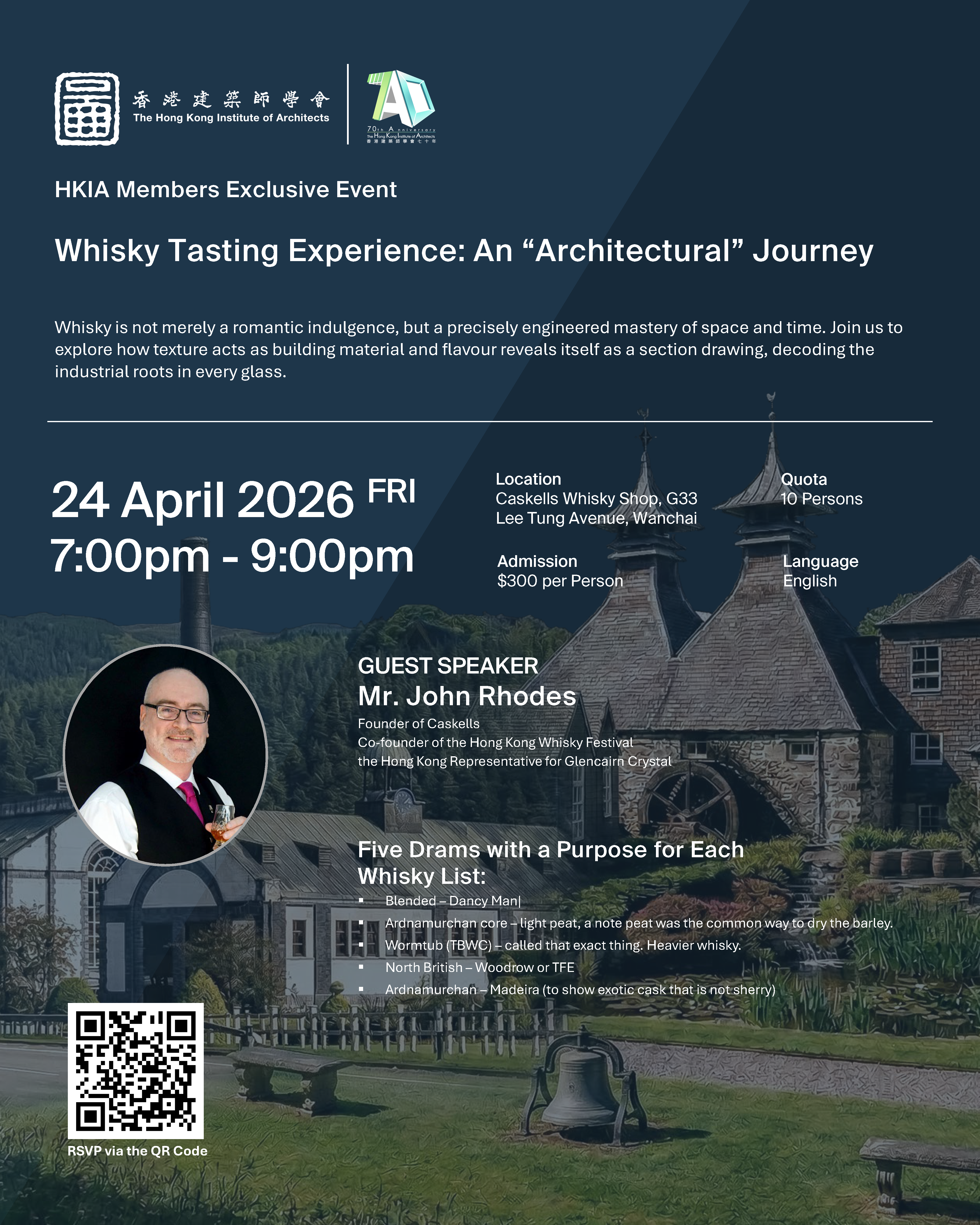 As production scaled, pagoda roofs, copper stills, condensers, and thick‑walled warehouses showcased this precise engineering. Join us for an exclusive HKIA members’ whisky tasting, where we explore how architecture and whisky intertwine through texture, structure, craftsmanship, and time.