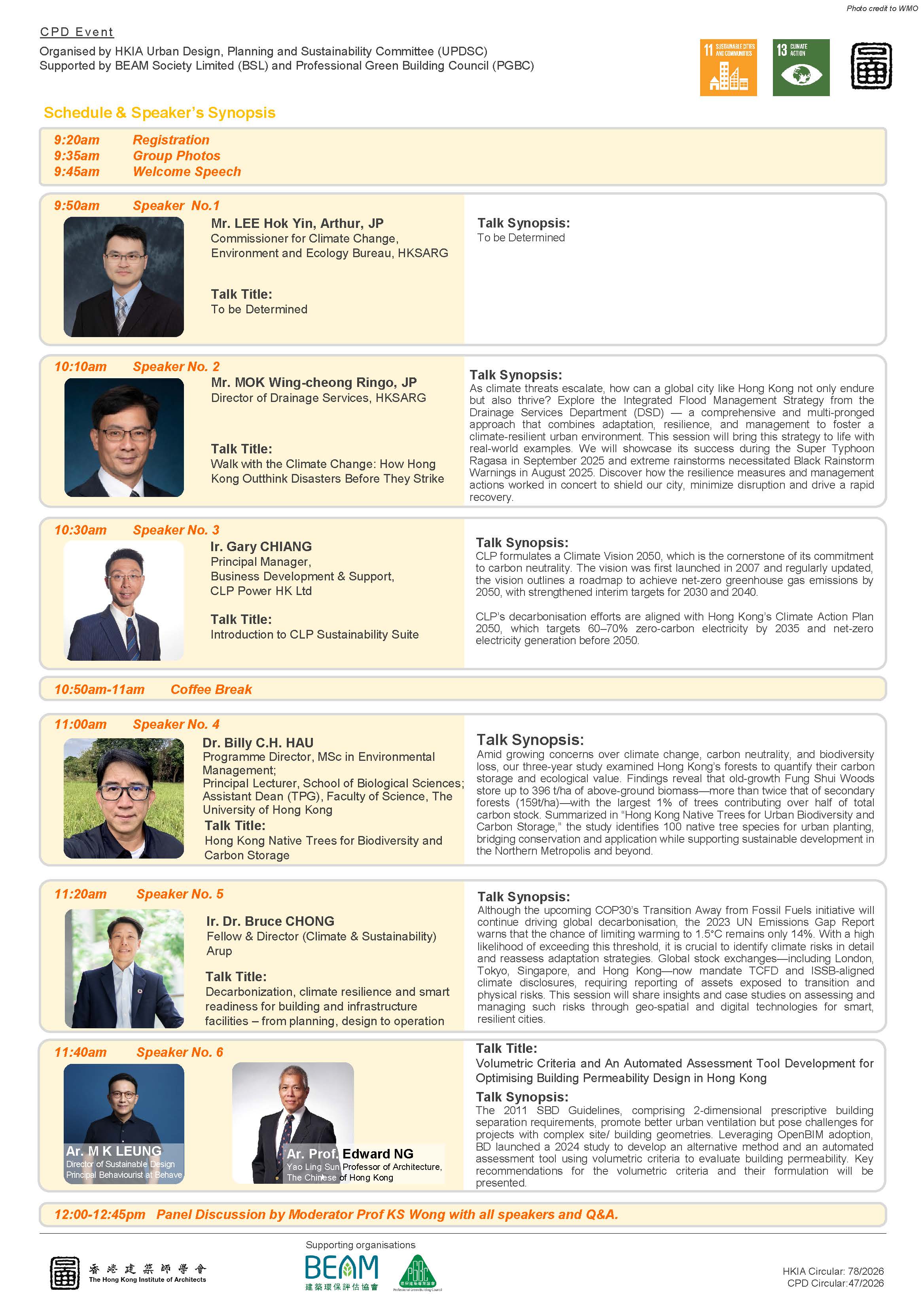 This year, we are delighted to have Climate Change Commissioner Mr. Arthur Lee to join our forum and share with us the latest action on combating climate change. The Director of Drainage Services Department will also join us to share the Integrated Flood Management Strategy — a comprehensive and multi-pronged approach that combines adaptation, resilience, and management to re-shape Hong Kong into a resilient city. For details, please see the attachment.