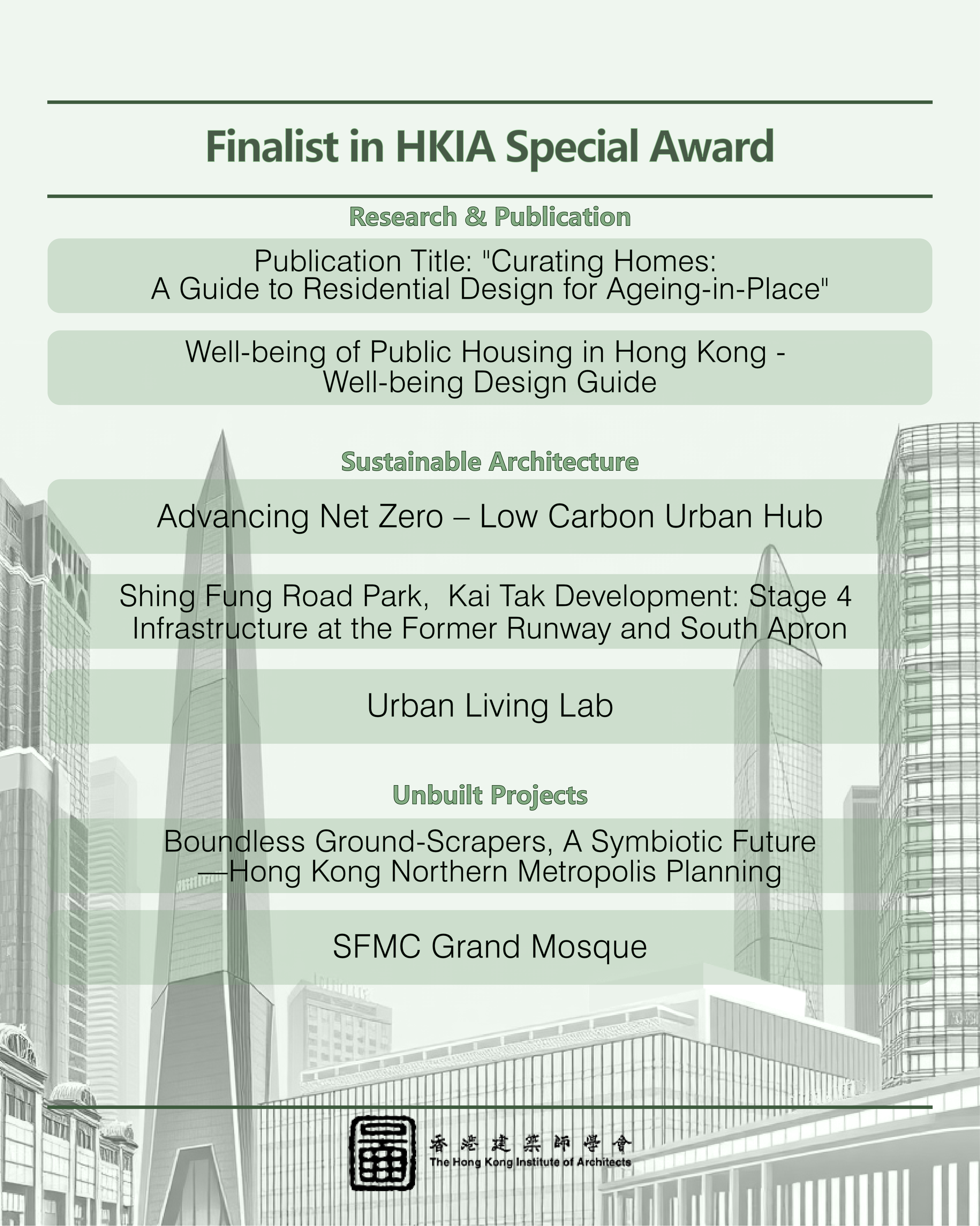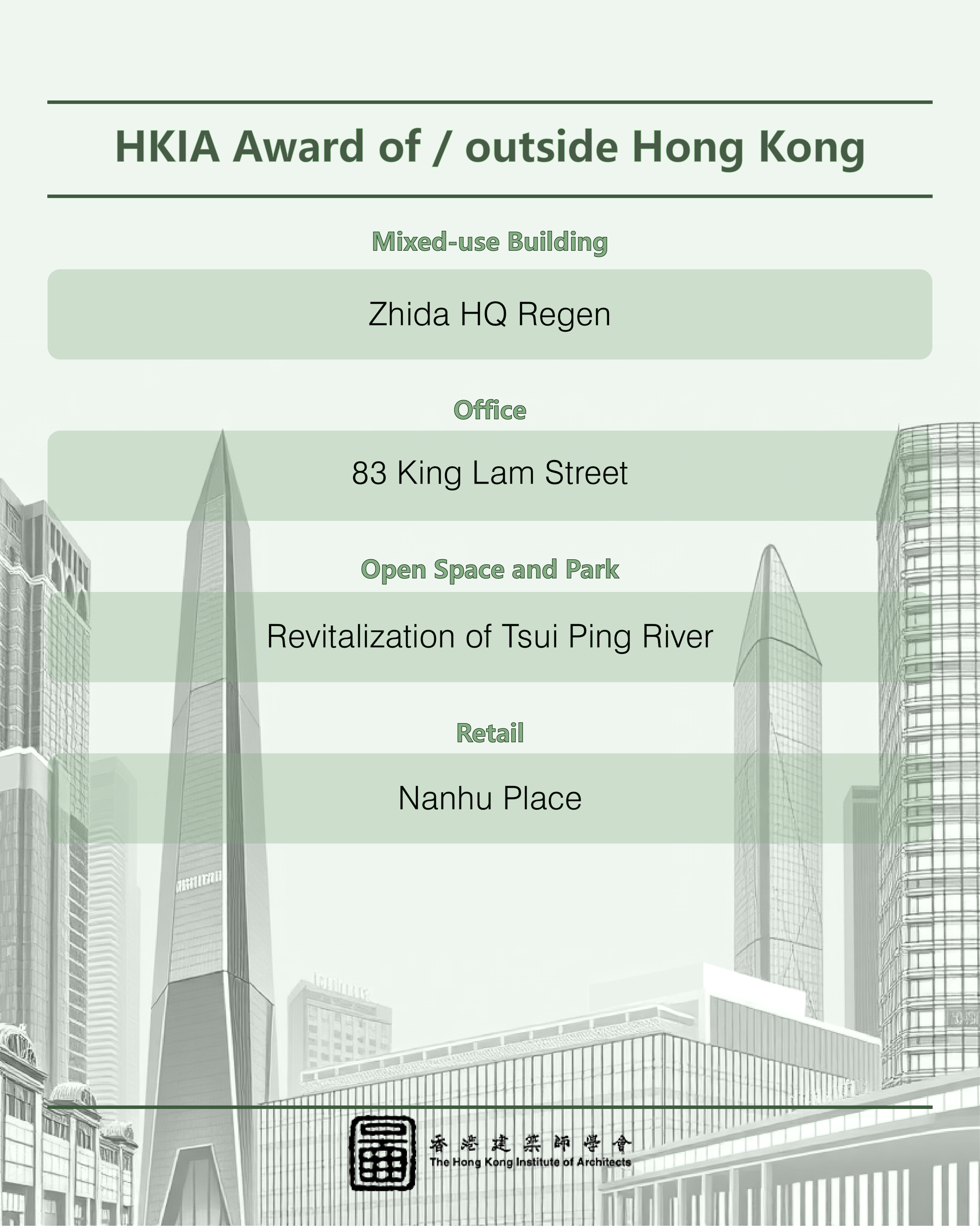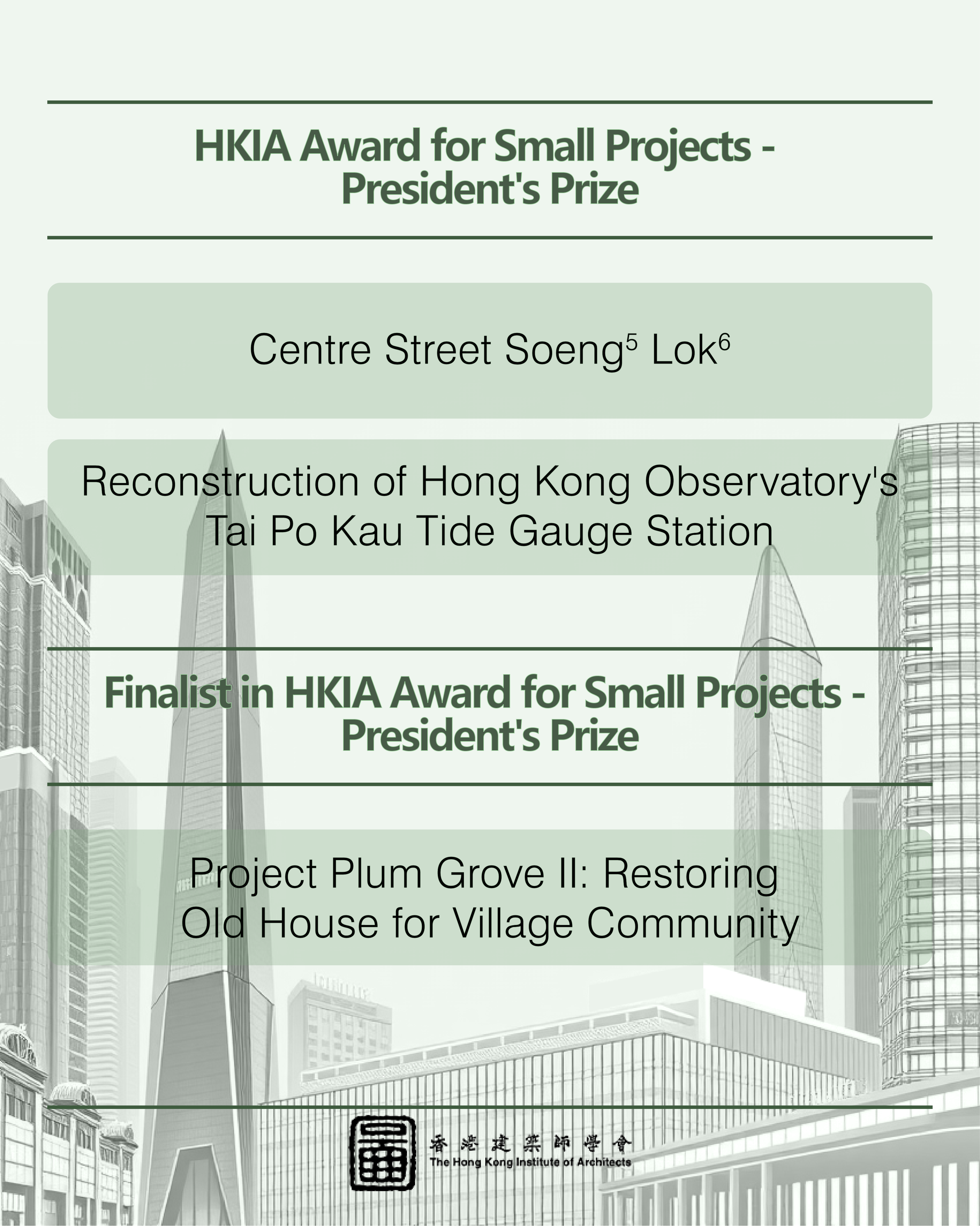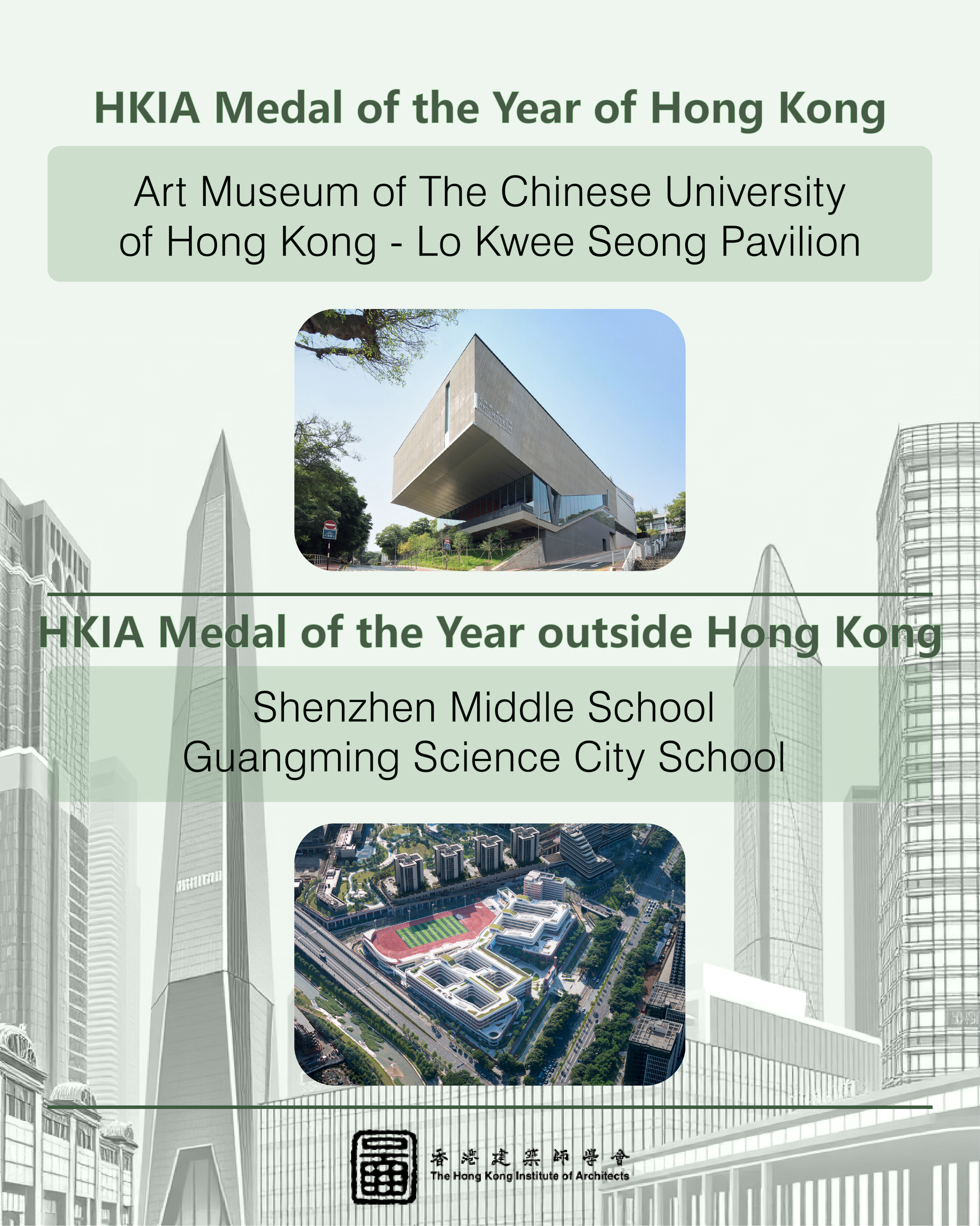 This year, we received an impressive record total of 112 nominations, setting a new benchmark in recent years. From these, 71 outstanding projects made it to the shortlist, competing in three main categories: "HKIA Medal of the Year of/outside Hong Kong," "HKIA Award for Small Projects – President’s Prize," and "HKIA Special Award."