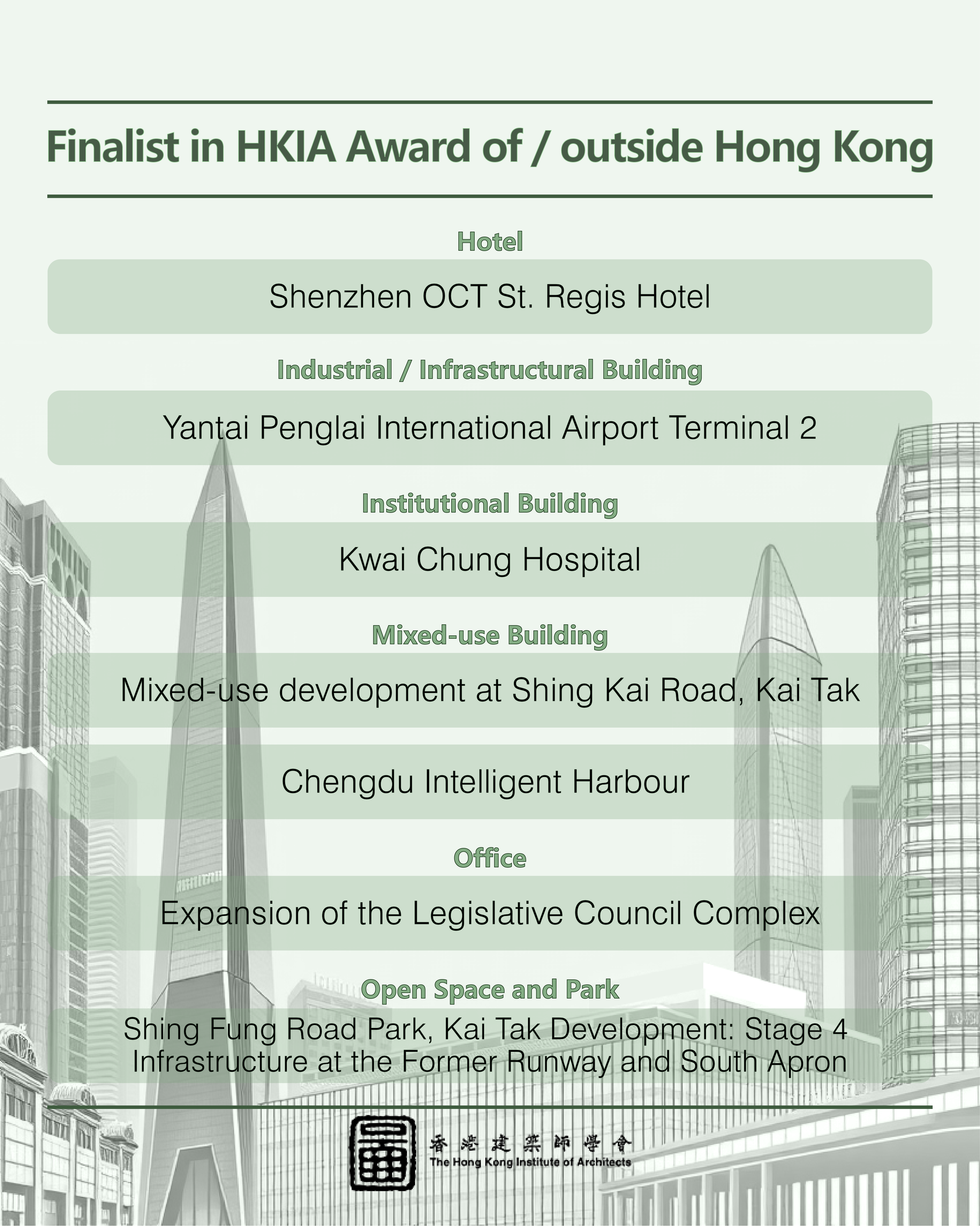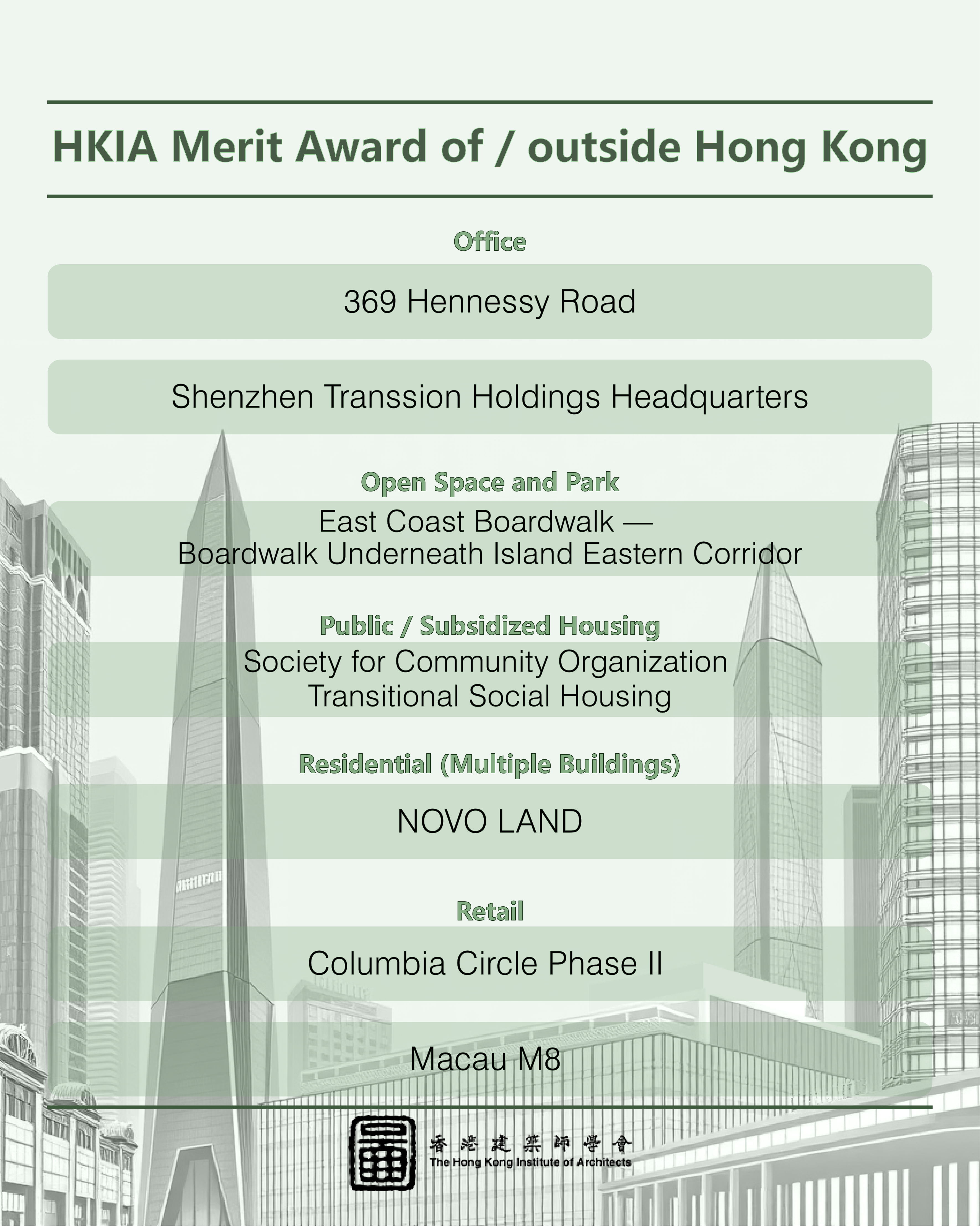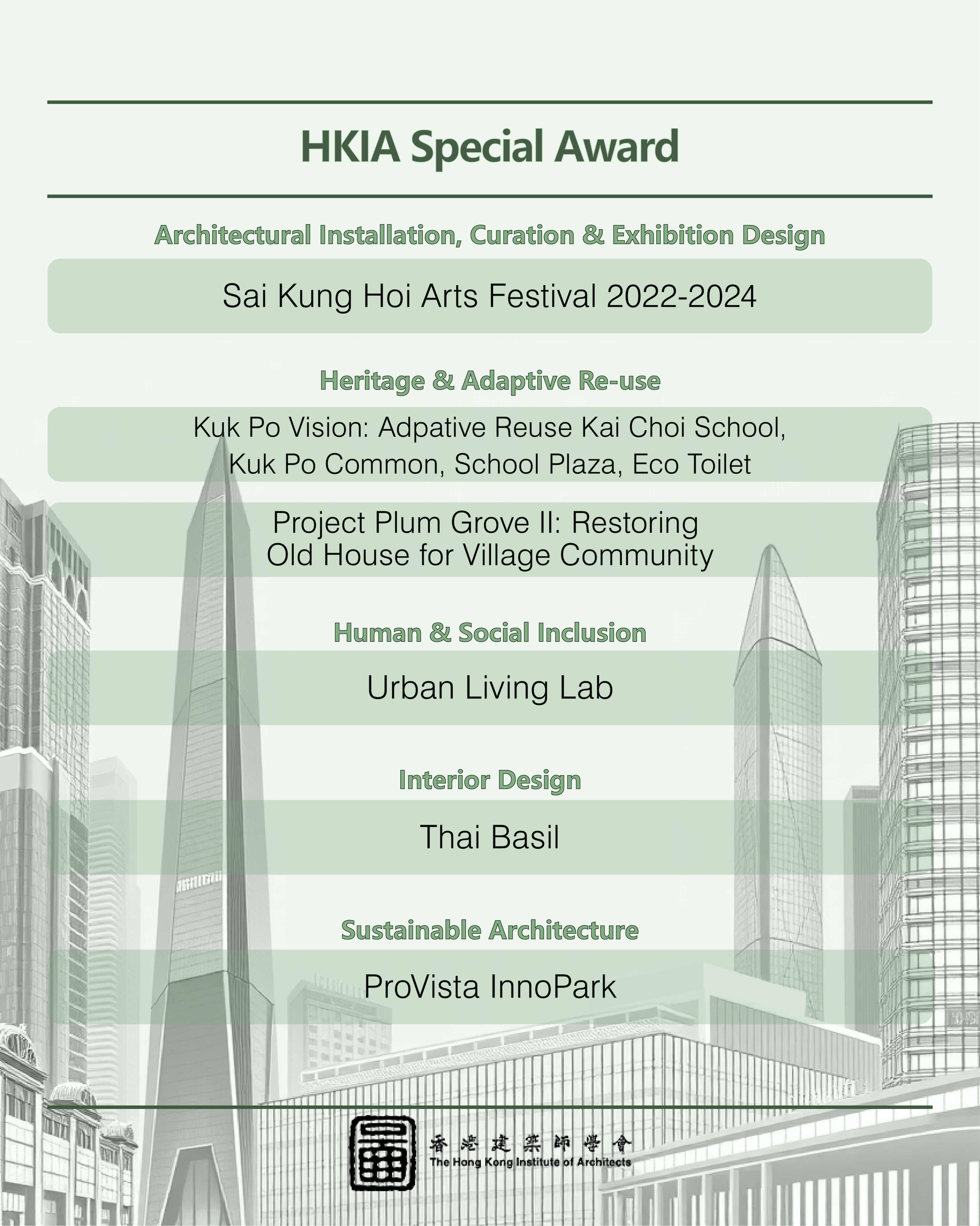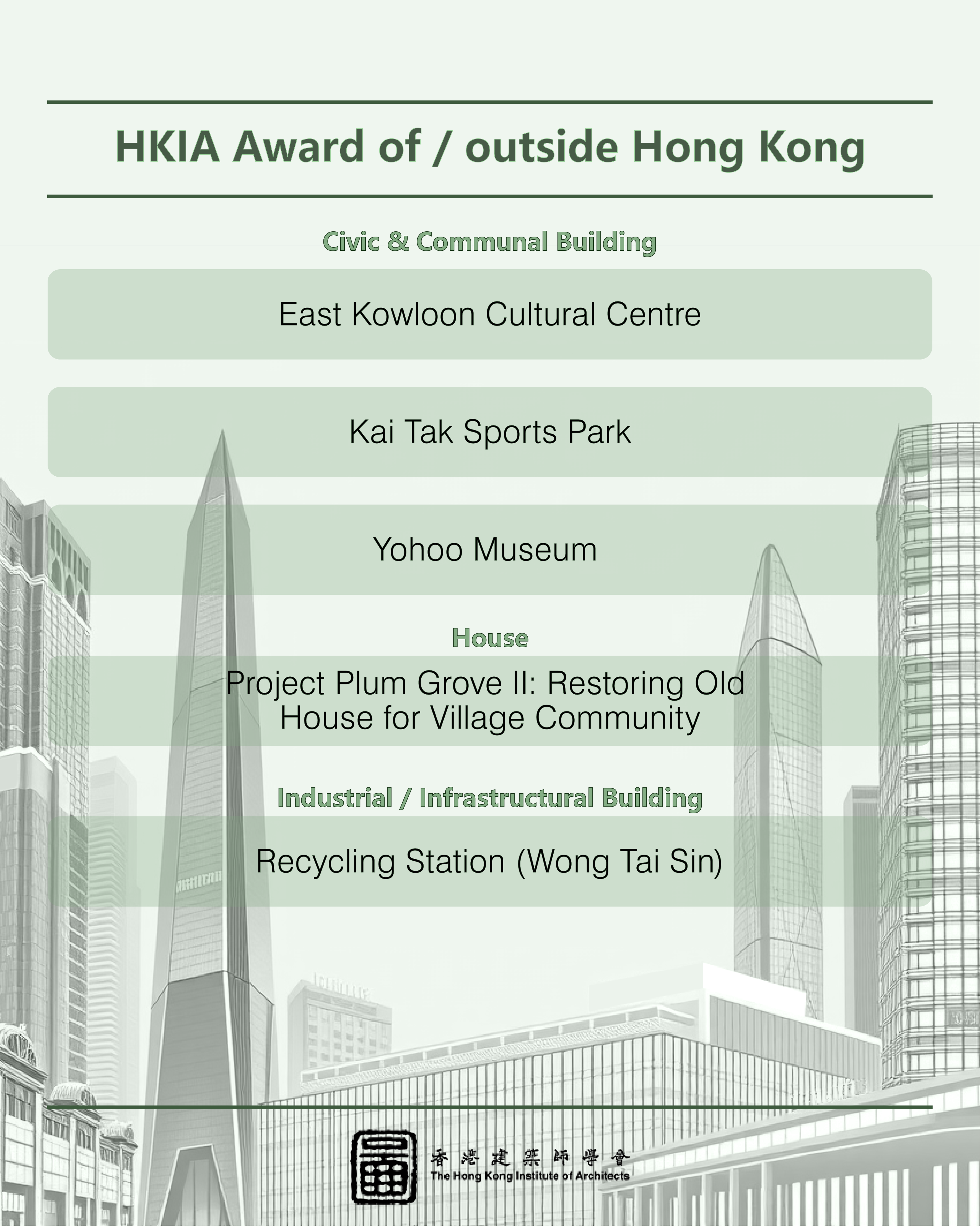 This year, we received an impressive record total of 112 nominations, setting a new benchmark in recent years. From these, 71 outstanding projects made it to the shortlist, competing in three main categories: "HKIA Medal of the Year of/outside Hong Kong," "HKIA Award for Small Projects – President’s Prize," and "HKIA Special Award."