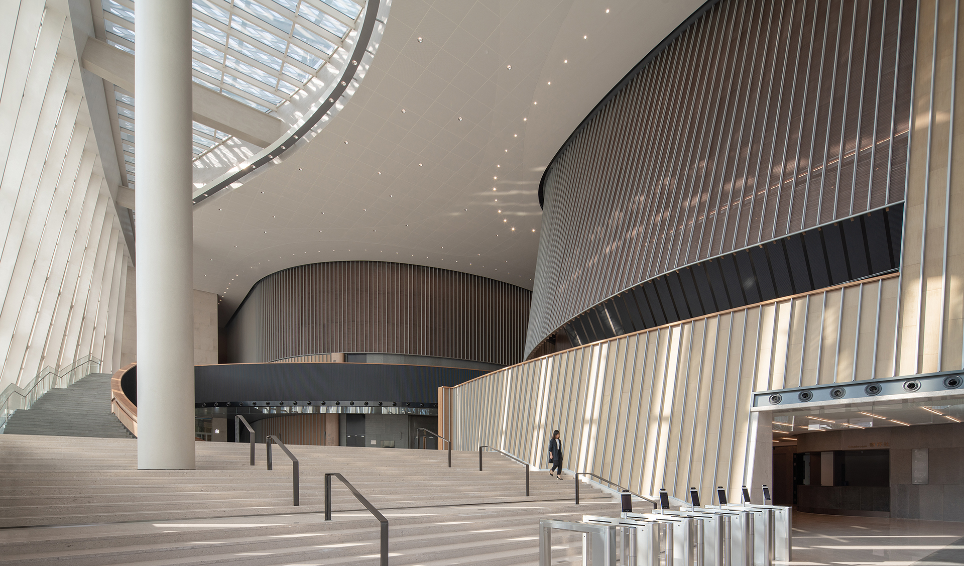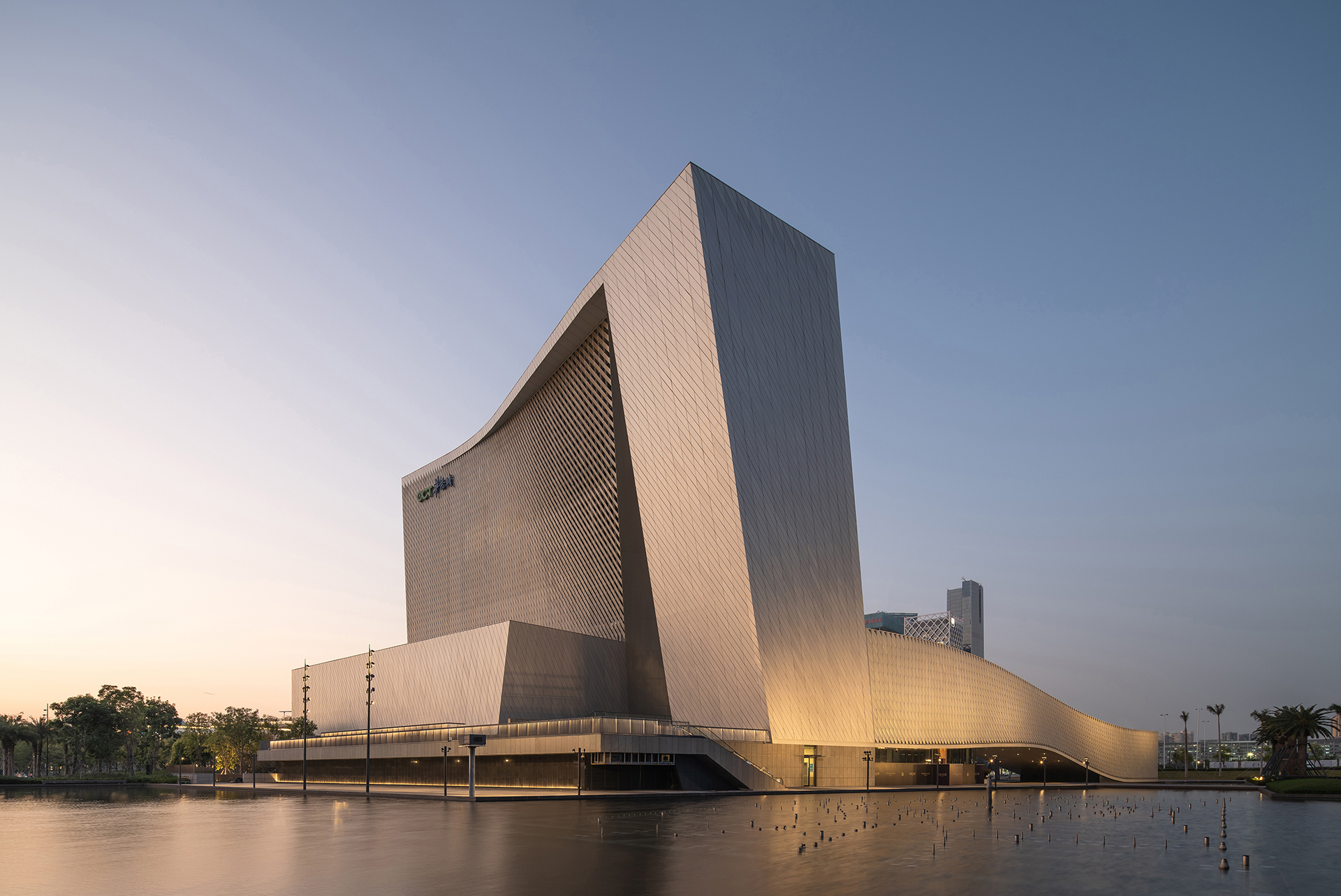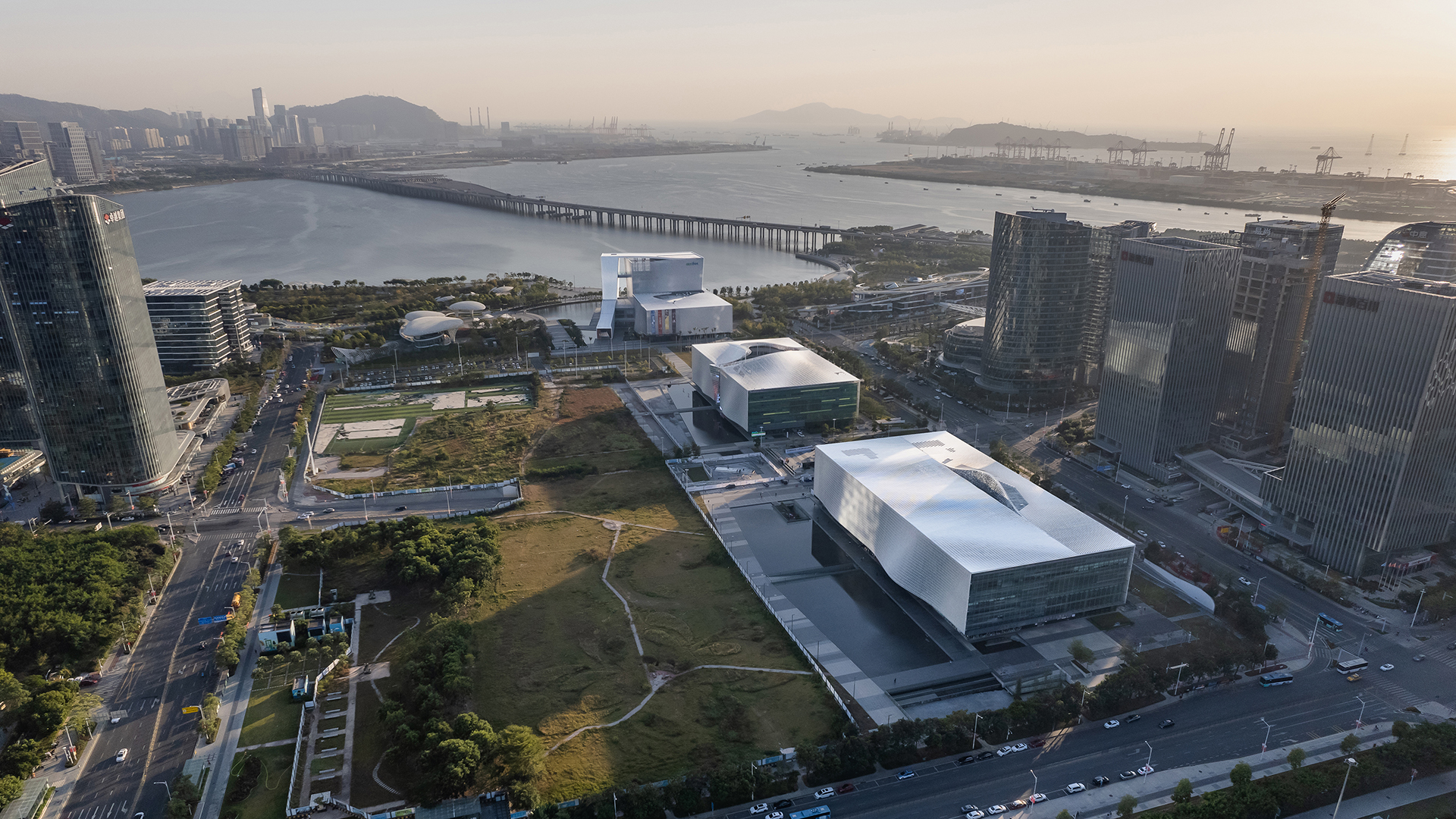 此项目三座公共文化建筑分别座落于三个独立地块上,建筑形态以最简朴的长方体出发,再根据三座建筑不同的功能空间要求及与景观的关系,塑造出具有独立个性但理念统一的形体。总规上亦务求加强三者的连系,图书馆、青少年宫及演艺中心安排在地块西陲连成一线,中间以文化平台相连,令建筑群一气呵成,成为宝安区人民文化活动的中心,也是中央绿轴临海的一个有力亮点。