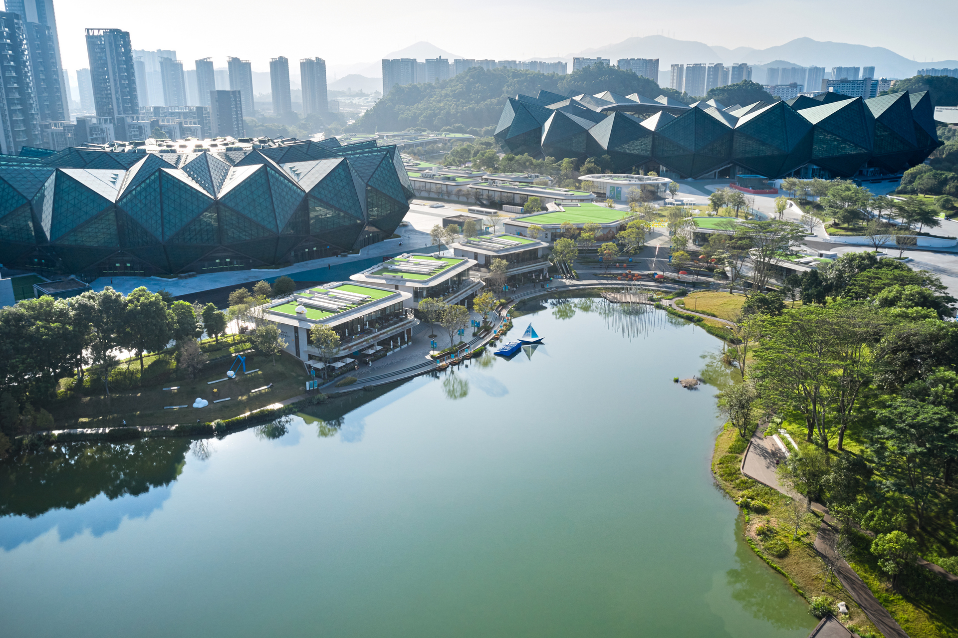 深圳大运天地项目位于龙岗区,以“大运画卷”为设计理念,融合商业街区、健身公园、城市广场、亲水长廊及生态湖景等多功能区域,打破商业与自然的界限。商业区採用“南动北静”佈局,通过中央广场过渡,结合自然景观,营造沉浸式商业氛围。项目保留原生树种,依托大运中央公园景观,打造绿色生态空间,实现商业与自然共生。