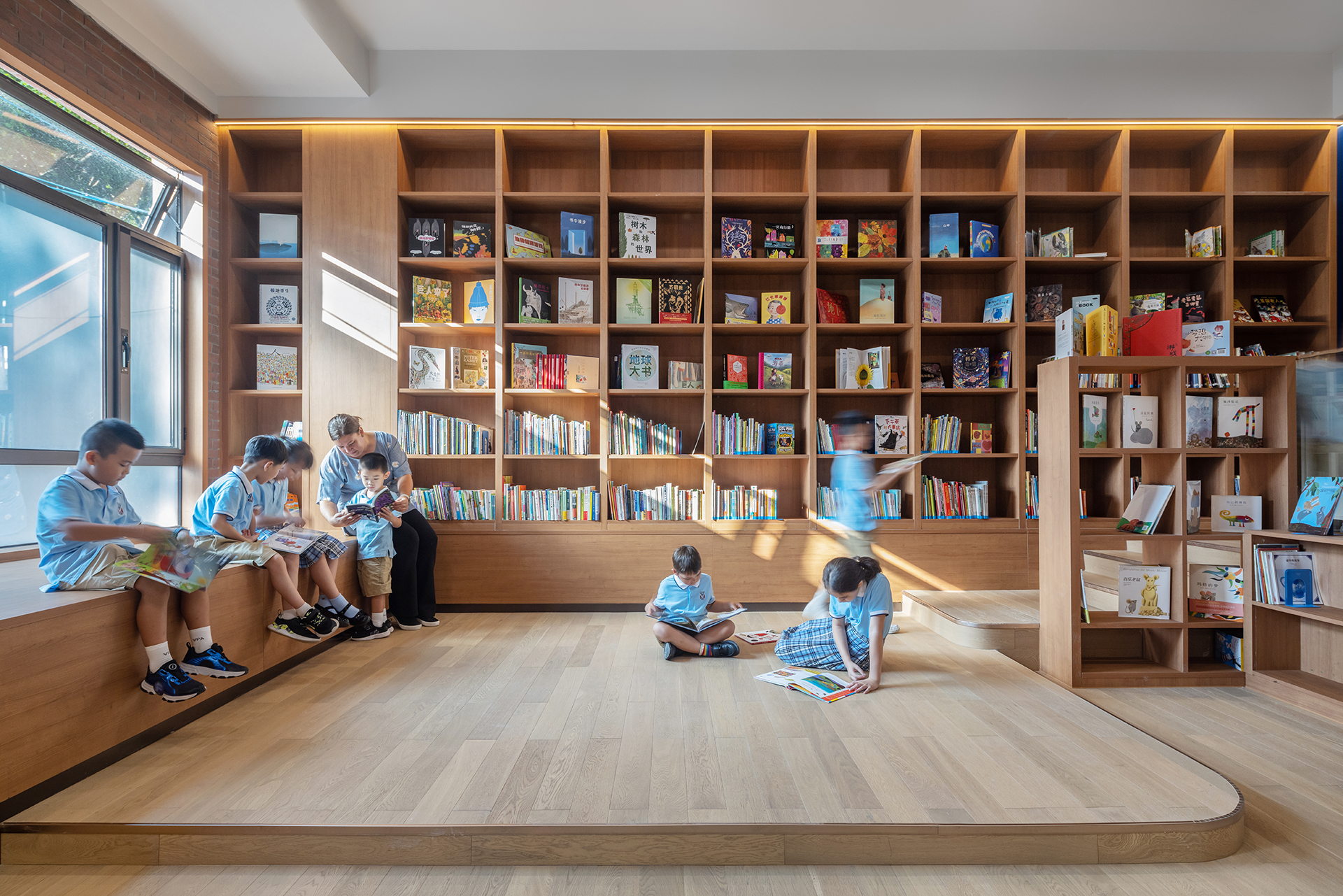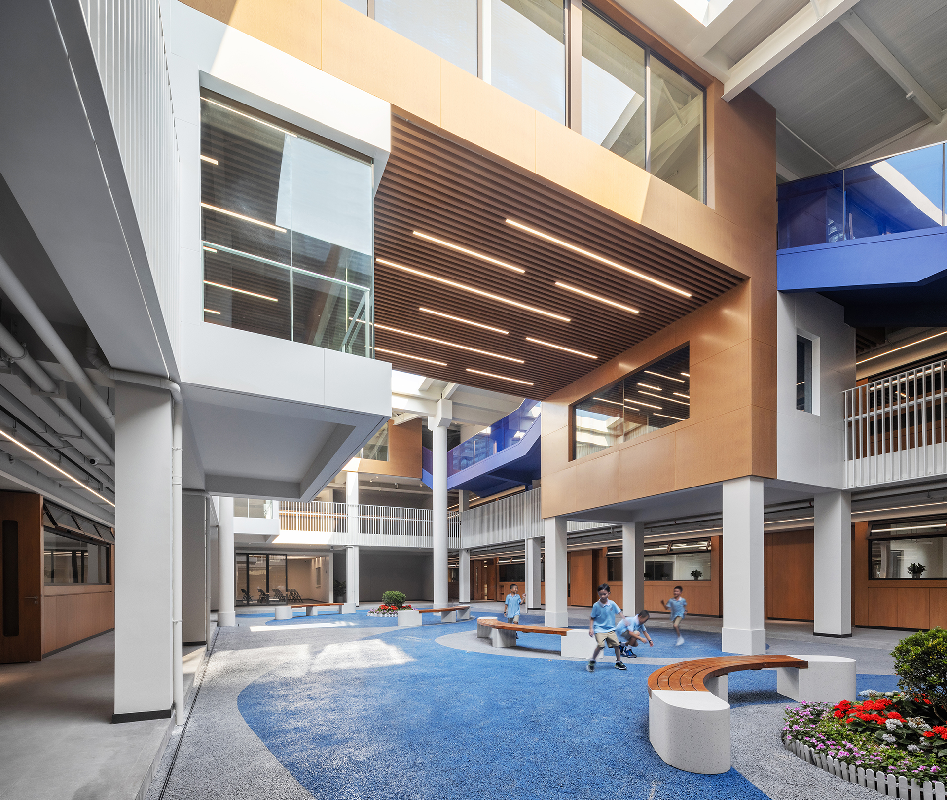 丽林维育学校是香港维多利亚教育集团择址深圳的第一所分校。地缘优势赋予场地灵动美好的基调,设计回归自然,还原空间温度,将关注放回到学生和老师身上。建筑保留坡屋顶的优美形体,在垂直关系与组织单元上创造了一条“蓝色山廊”贯穿所有室内活动,串联沙龙讲座、大台阶和中庭景观三大区域,并整体发挥尺度优势组织阅读、演讲、学习、娱乐和交流等单元。新校园启发学生对自我的认知、促进群体社交与协作、建立与自然的无缝链接。