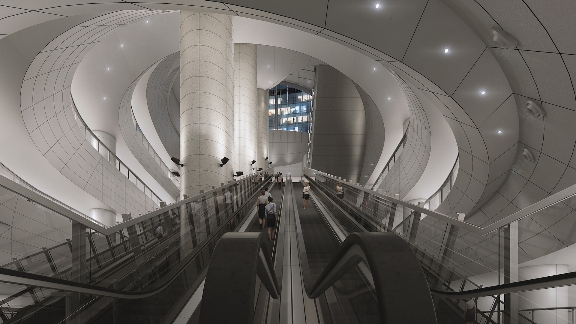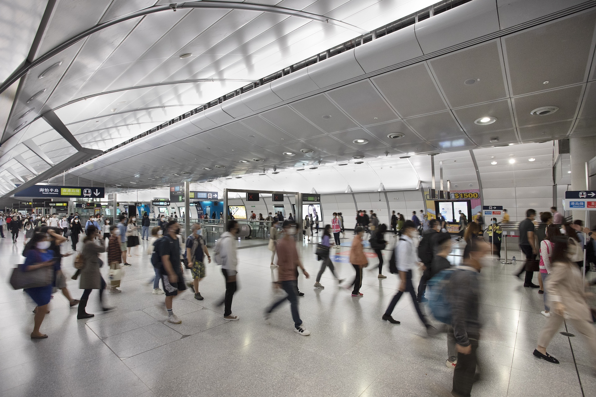 金钟站扩建项目连接四条铁路綫,项目极具挑战性,团队需确保站点规划丶生命安全丶核心工程顺利完成,同时避免影响现有铁路运营及乘客体验。 港铁与奥雅纳秉承以人为本的概念,实现30米高的地下中庭设计,以巨型天窗引入自然光,为乘客提供主要移动及换綫通道,提升乘客舒适度,并以高效垂直运输方式应对金钟站的乘客流量。