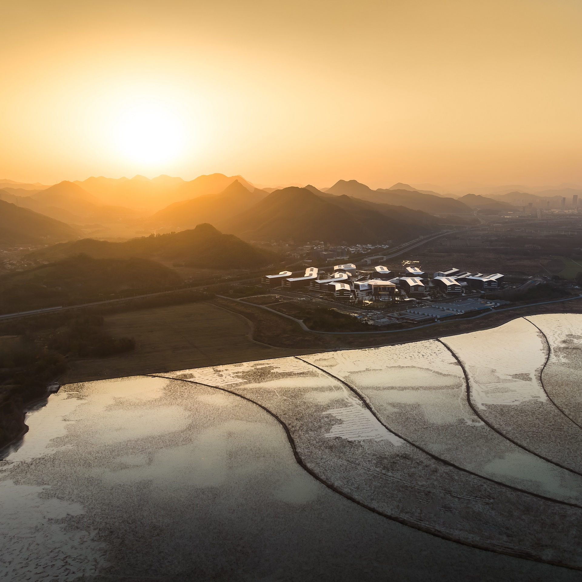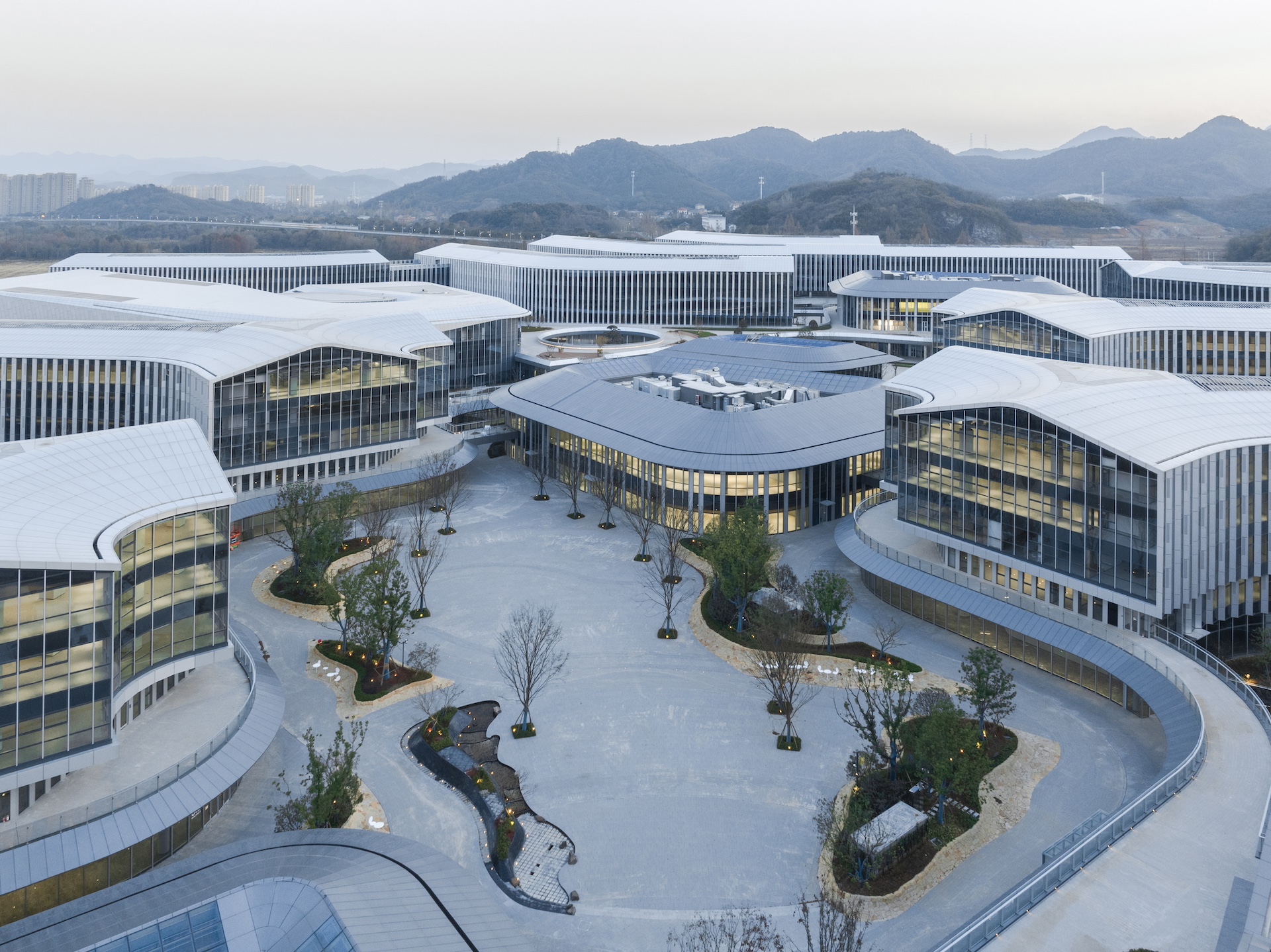 阿里巴巴南湖未来科学园位于杭州南湖风景区“两山夹一谷”的核心区域。南湖自东汉年代开始蓄水,距今已有1851年历史。总图布局呈叶片的脉络形状生长,将建筑与环境中的山水融为一体,构成了整幅美丽的画卷,移步异景的庭院景观,无意中引领行人的路线。