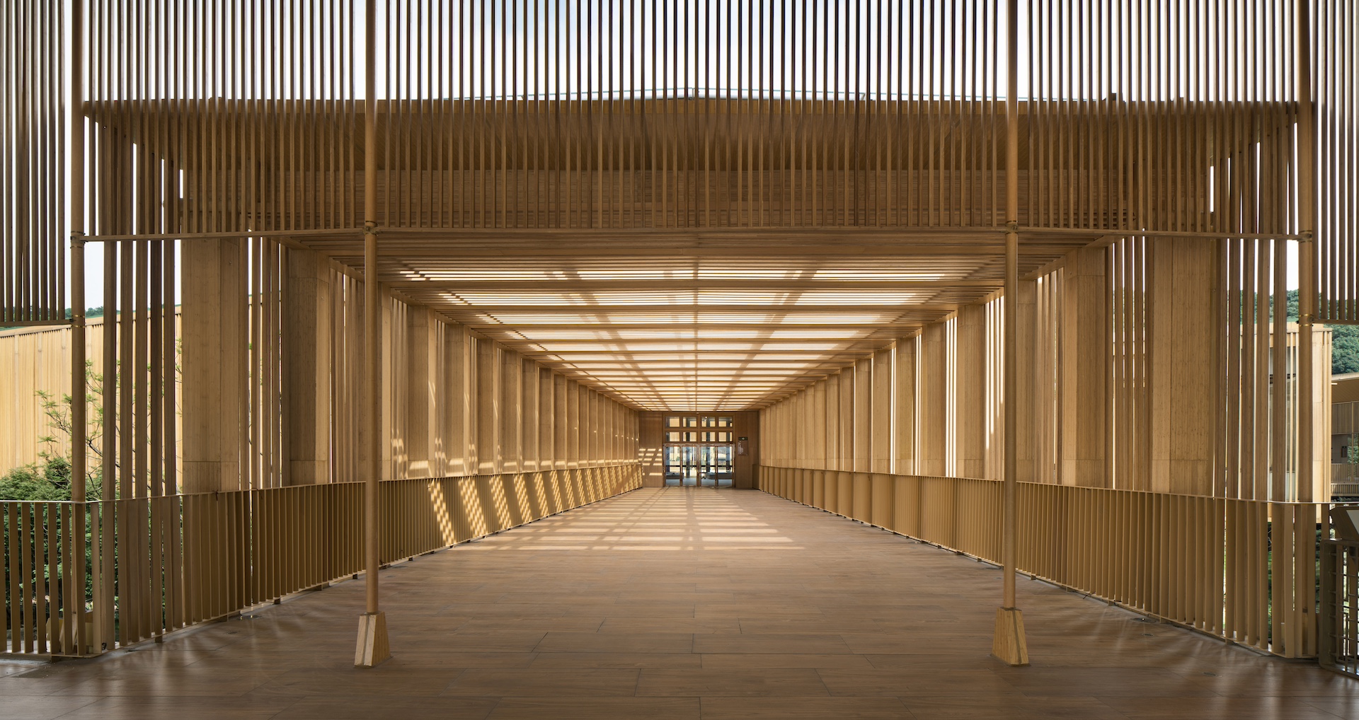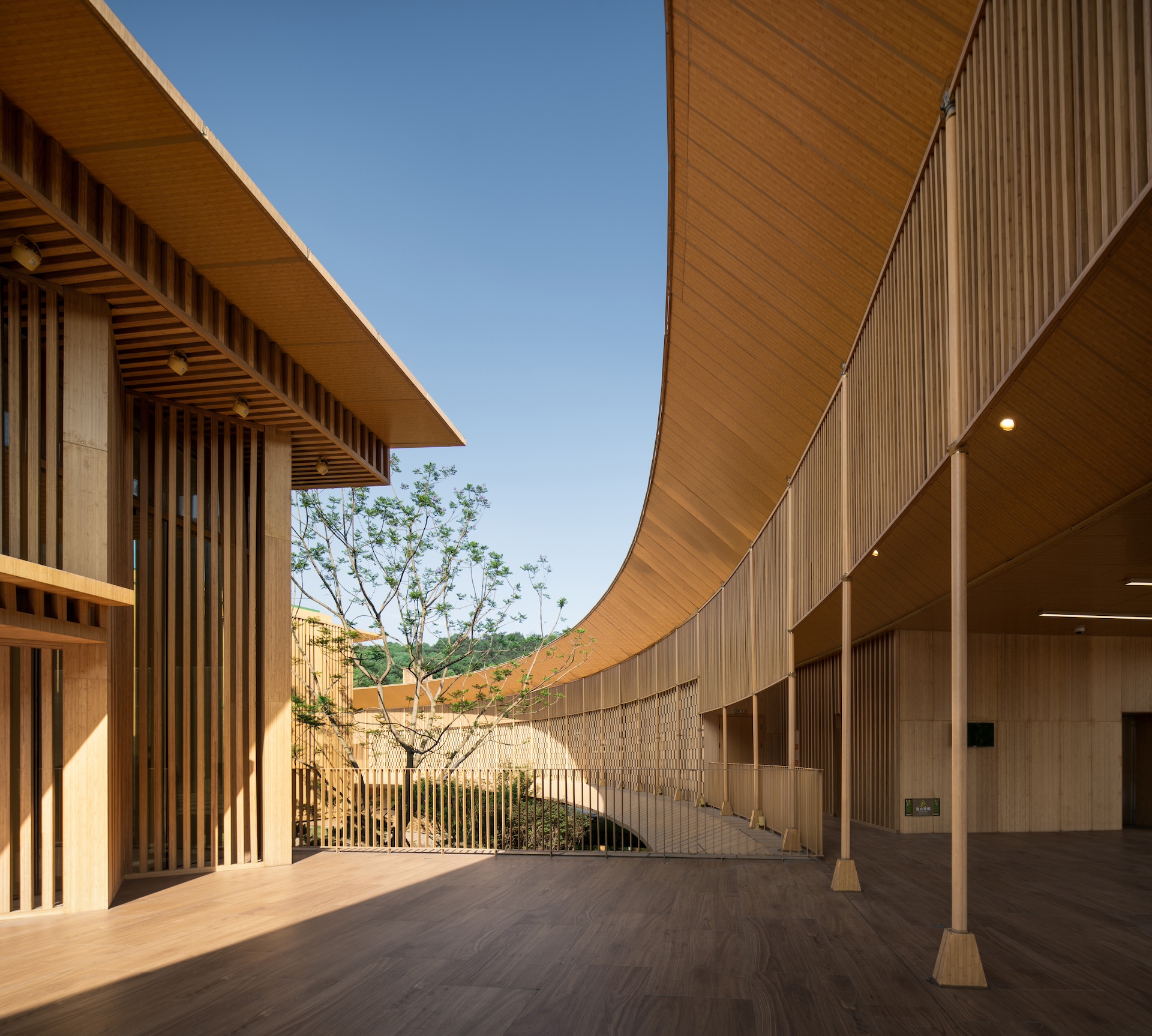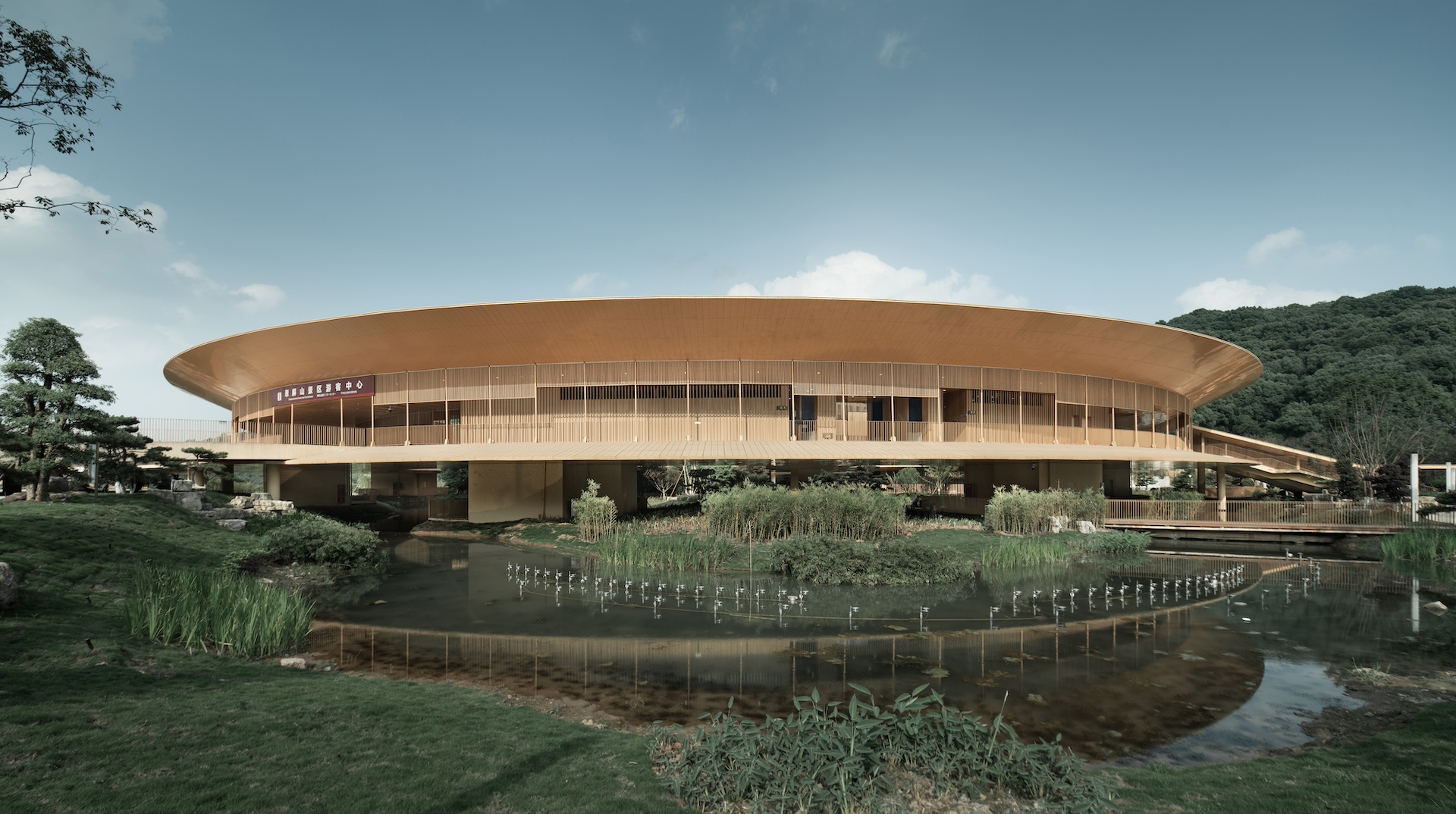 翠屏山景区游客接待中心为2020年国家 4A 级旅游景区配套工程,为游客提供信息咨询丶讲解教育休息餐饮等服务功能,为翠屏山佛道丶哪咤文化展示窗口,助力当地旅游发展。项目回应特定环境地貌,实现场所风物保护与再塑及地域文化传承。以经典圆形转译景区佛道文化丶以三个圆环连接基地与山体标高丶以景观廊桥轻触基地生态本底。