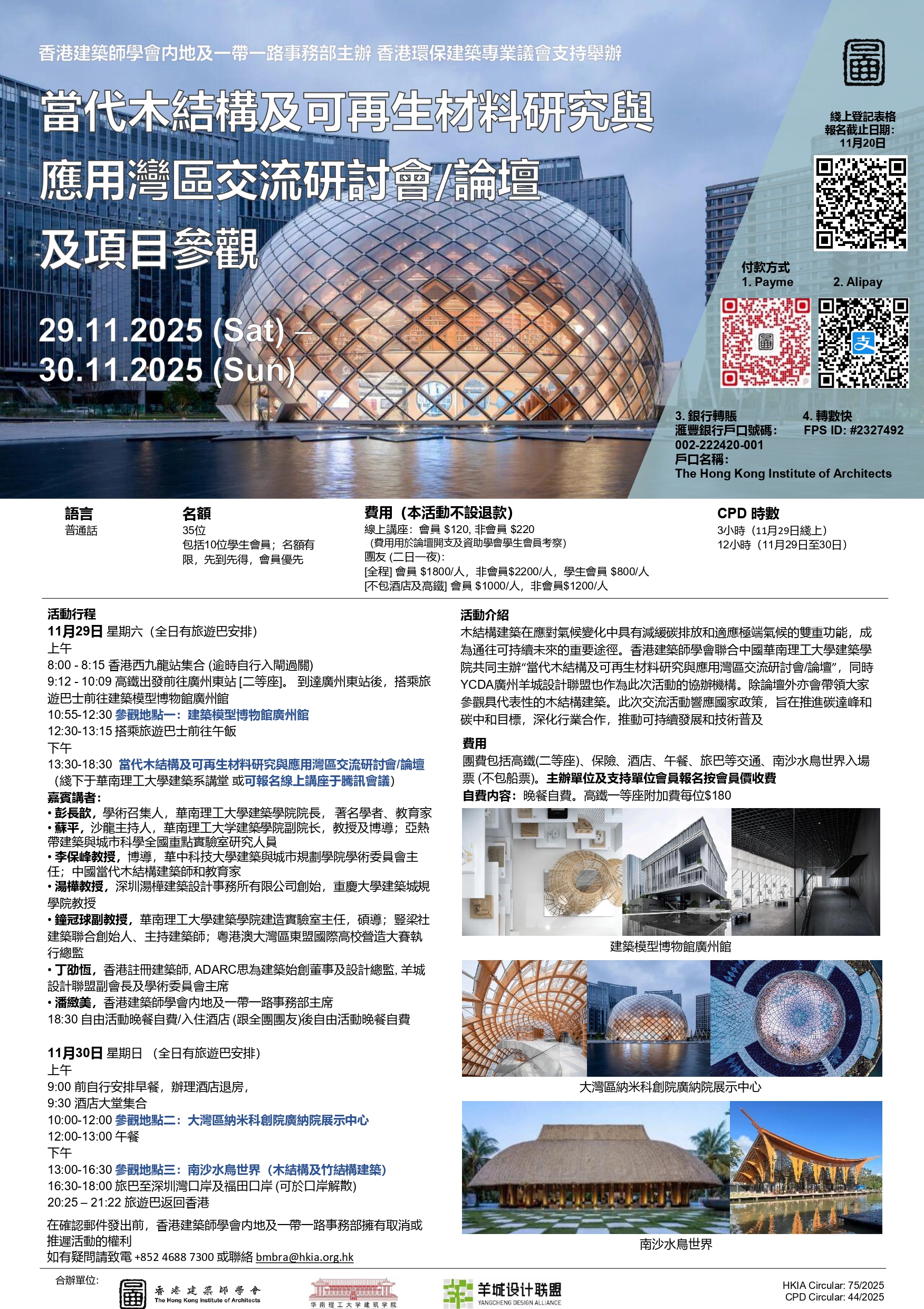 香港建筑师学会内地及一带一路事务部将联合华南理工大学建筑学院及羊城设计联盟会于2025年11月29日(星期六)至11月30日(星期日)举办 当代木结构及可再生材料研究与应用湾区交流研讨会/论坛 及项目参观活动。详情如下: