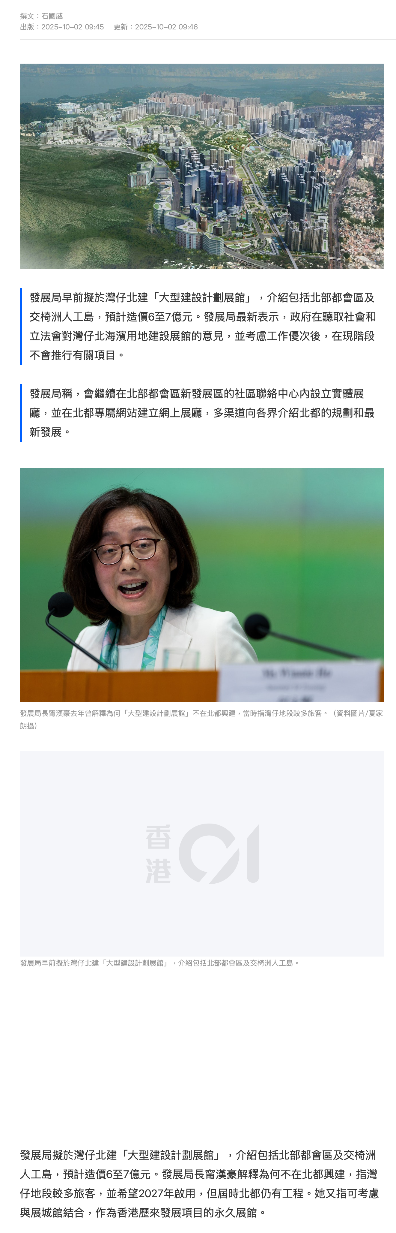 北都展馆叫停|原拟湾仔起展馆介绍北都 发展局:现阶段不会推行 香港01 港闻