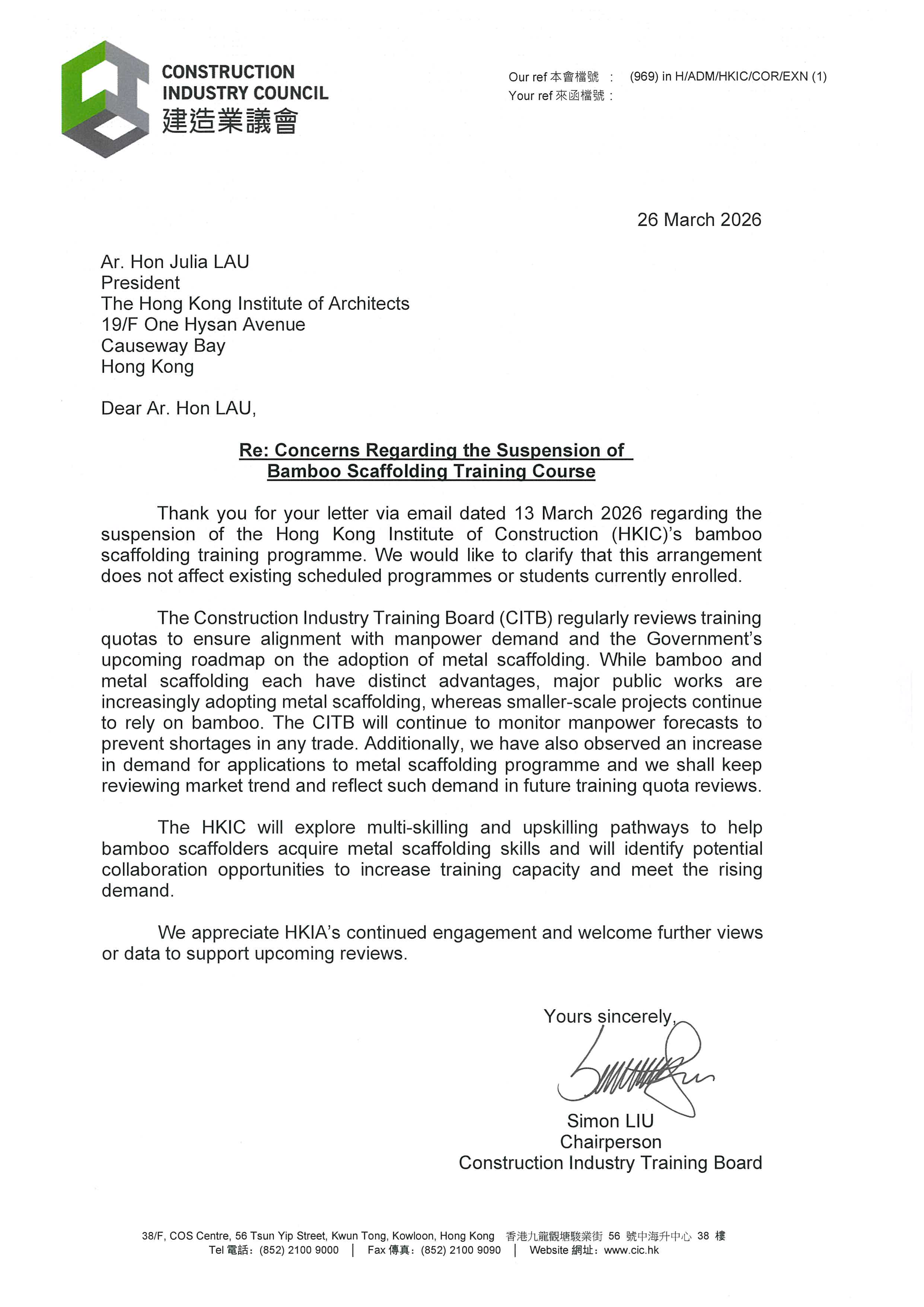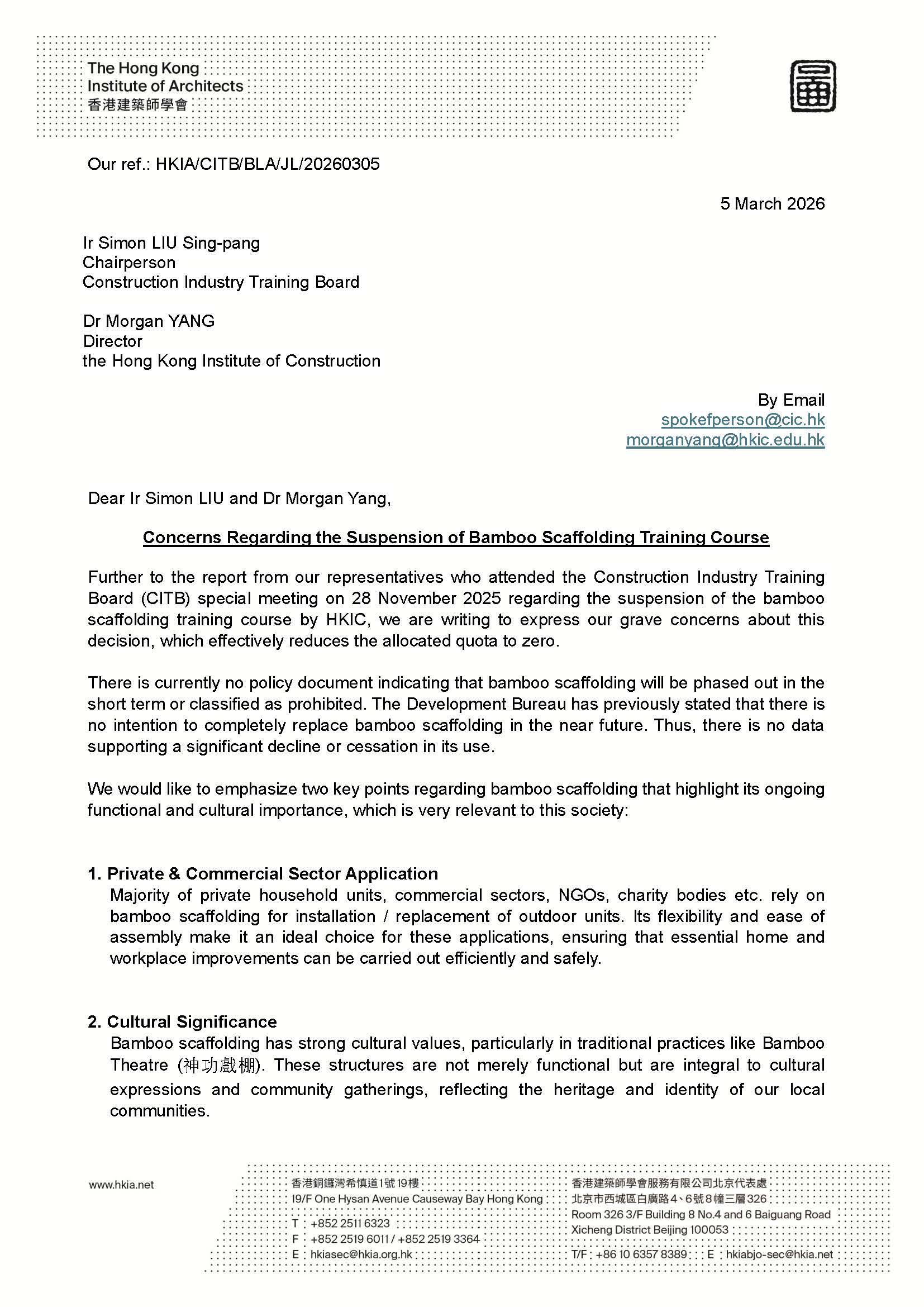 HKIA's Concerns Regarding the Suspension of Bamboo Scaffolding Training Course (and Construction Industry Training Board’s response letter)