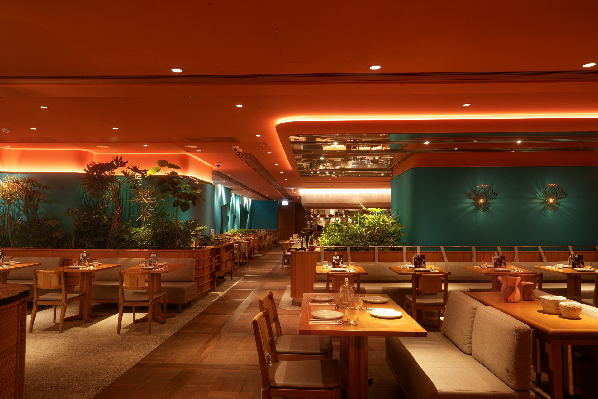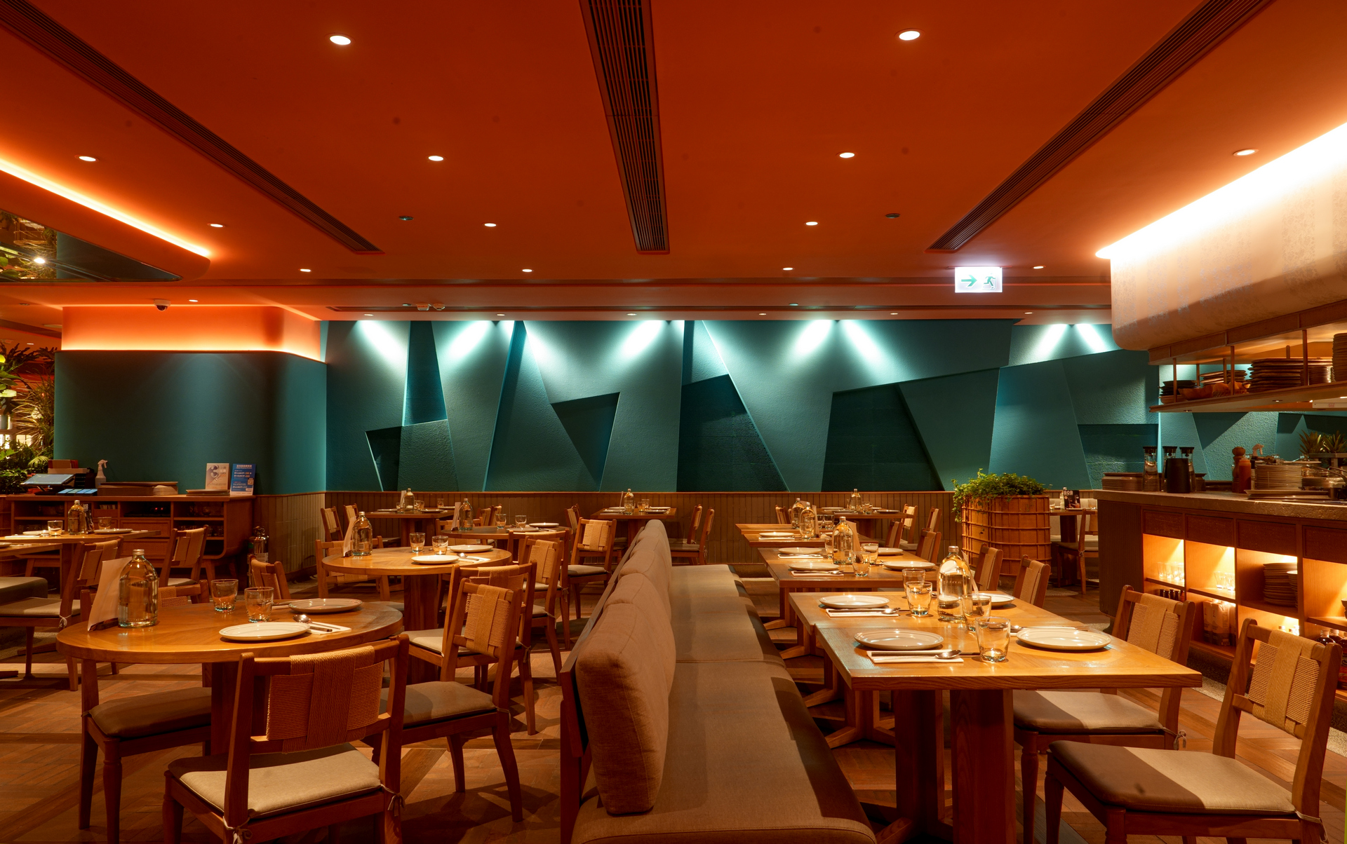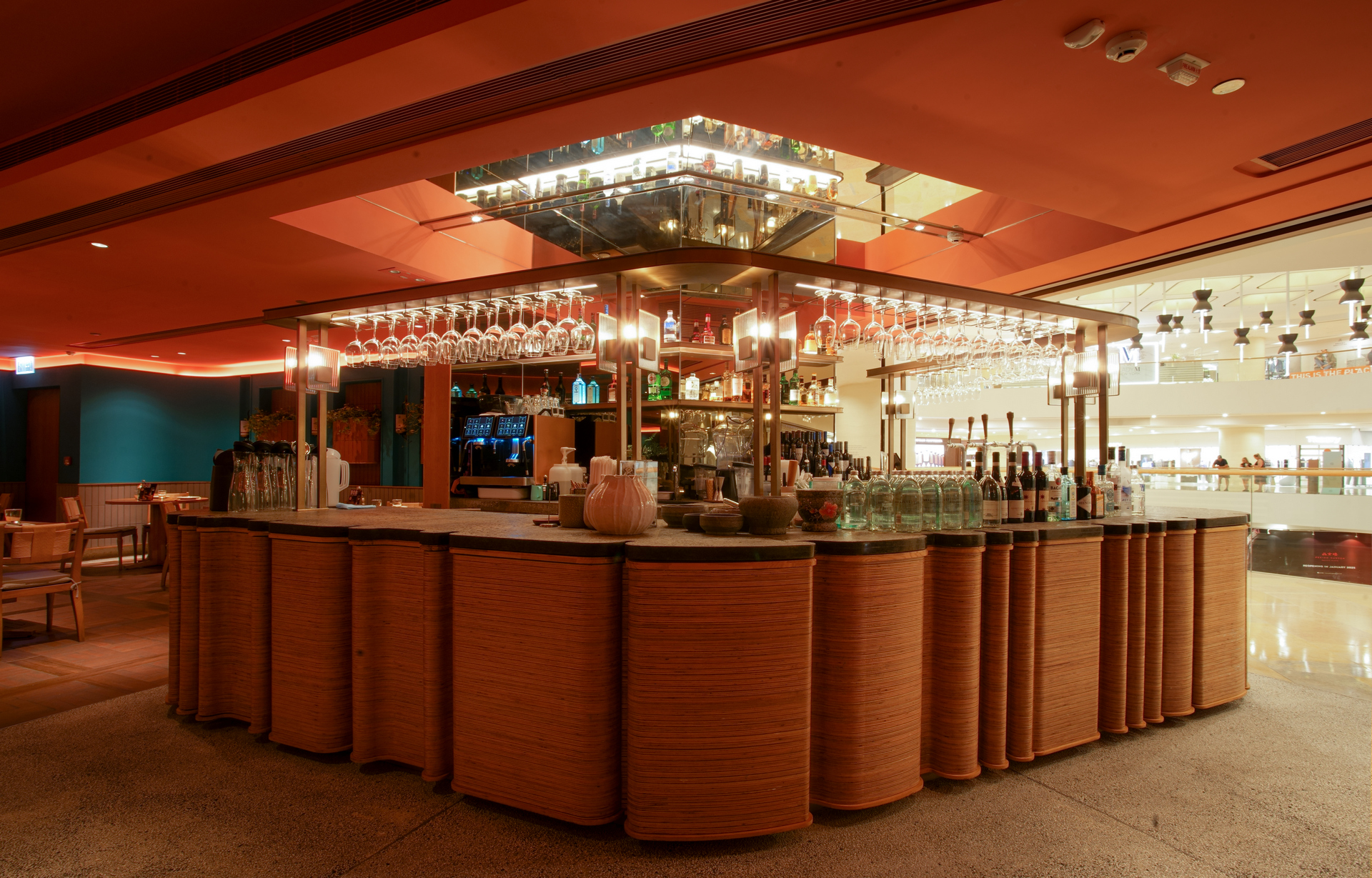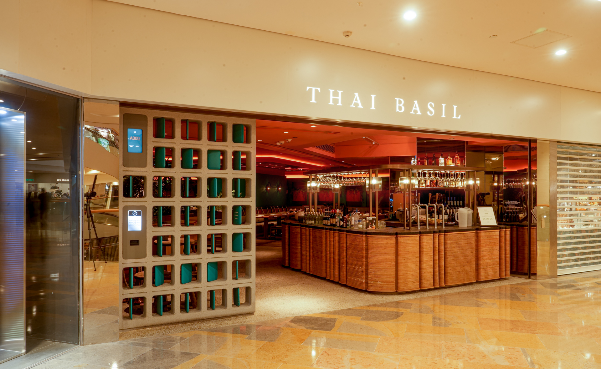 Thai Basil 坐落於香港太古廣場綜合大樓內,半開放式的立面在商場空間和餐飲區之間營造出流暢的銜接,增強了餐廳的溫馨活力。寬敞的圓形吧台成為焦點,進一步烘托出溫馨的氛圍。弧形木質吧台的設計靈感源自東南亞有機建築,與鏡面背景牆和天花板形成鮮明對比,溫暖的琥珀色木紋更增添了一絲溫馨私密的氛圍。