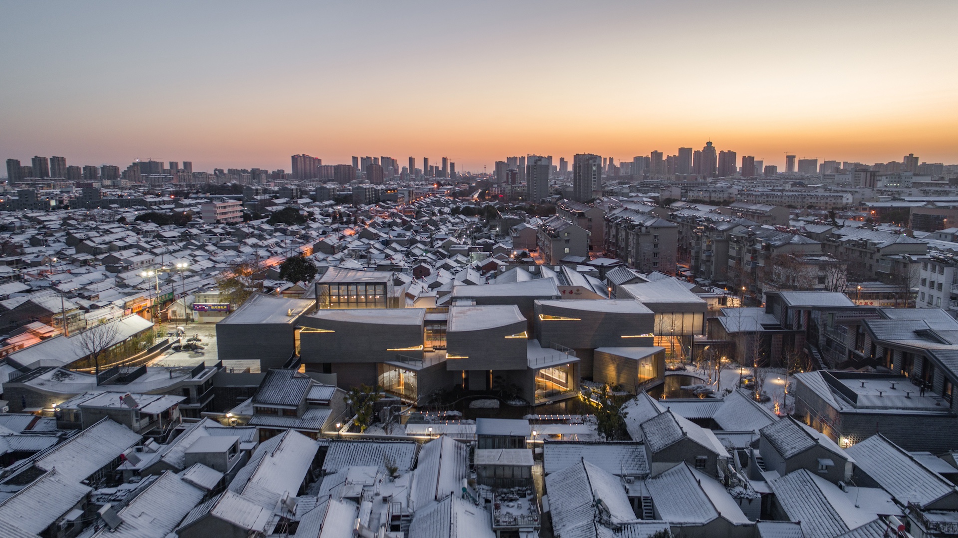 文化街區的概念,從場所精神中重構新的空間體系和文化內容,讓街區更新與再生,“錨固”城市肌理,讓設計融入市井生活。 紀念館建築造型采用了“置櫝藏珠”的概念,紀念館作為文化街區主體,總體風格古樸大方現代簡約,遠看就像七摞掀開的書稿,仿佛對應著汪老先生擅長的小說、散文、戲劇、詩歌、書信、雜著、談藝等七類文學體裁。