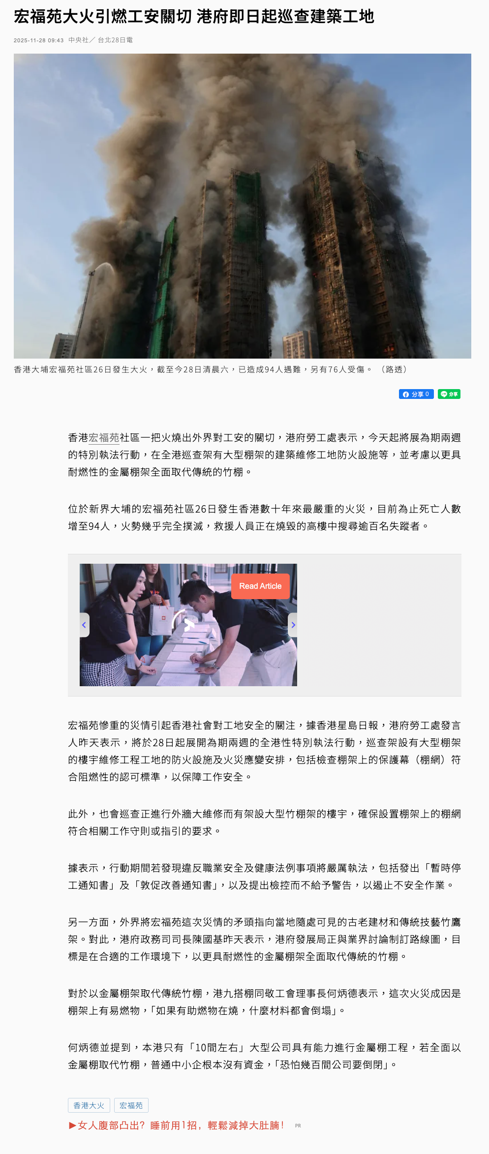 宏福苑大火引燃工安關切 港府即日起巡查建築工地