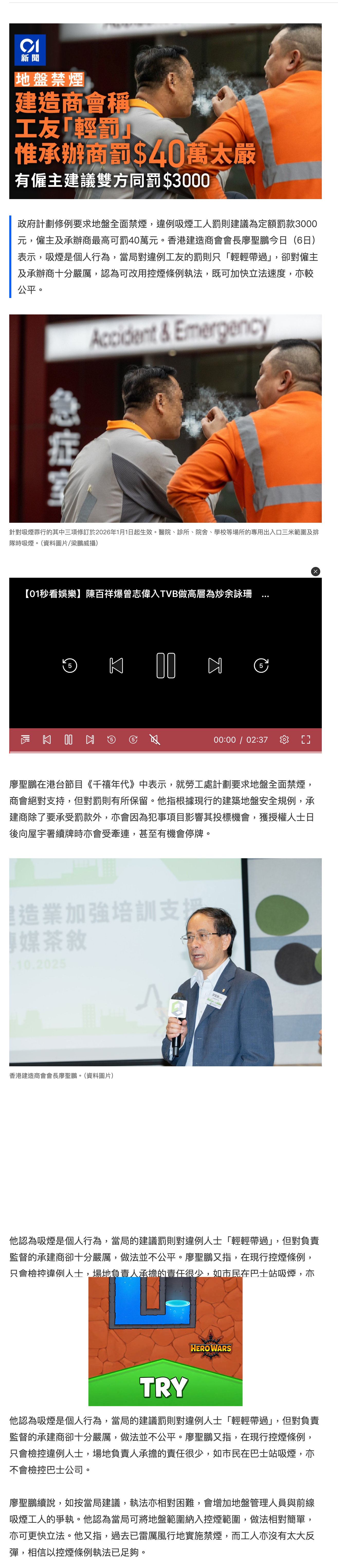 地盤禁煙|建造商會稱工友「輕罰」僱主卻罰40萬太嚴 倡用控煙例