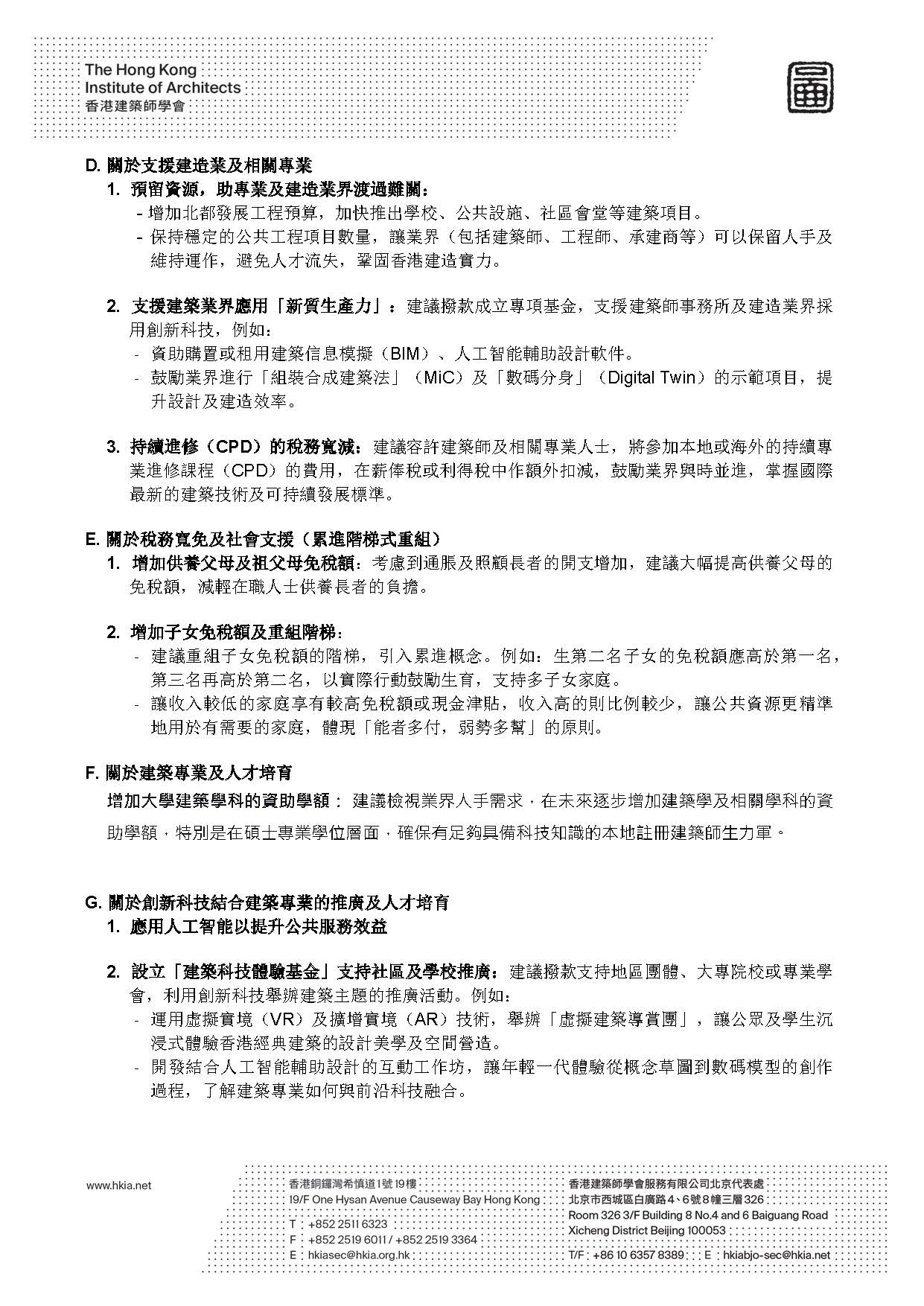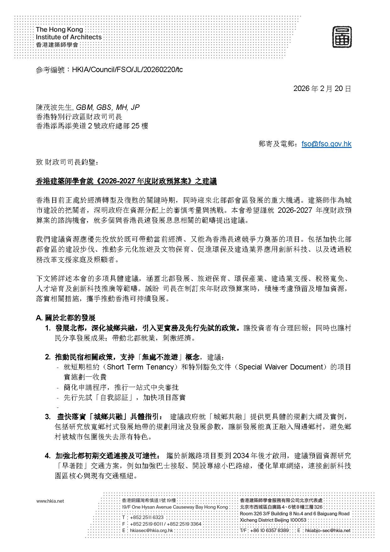 香港建築師學會就《2026至27年度財政預算案》的建議