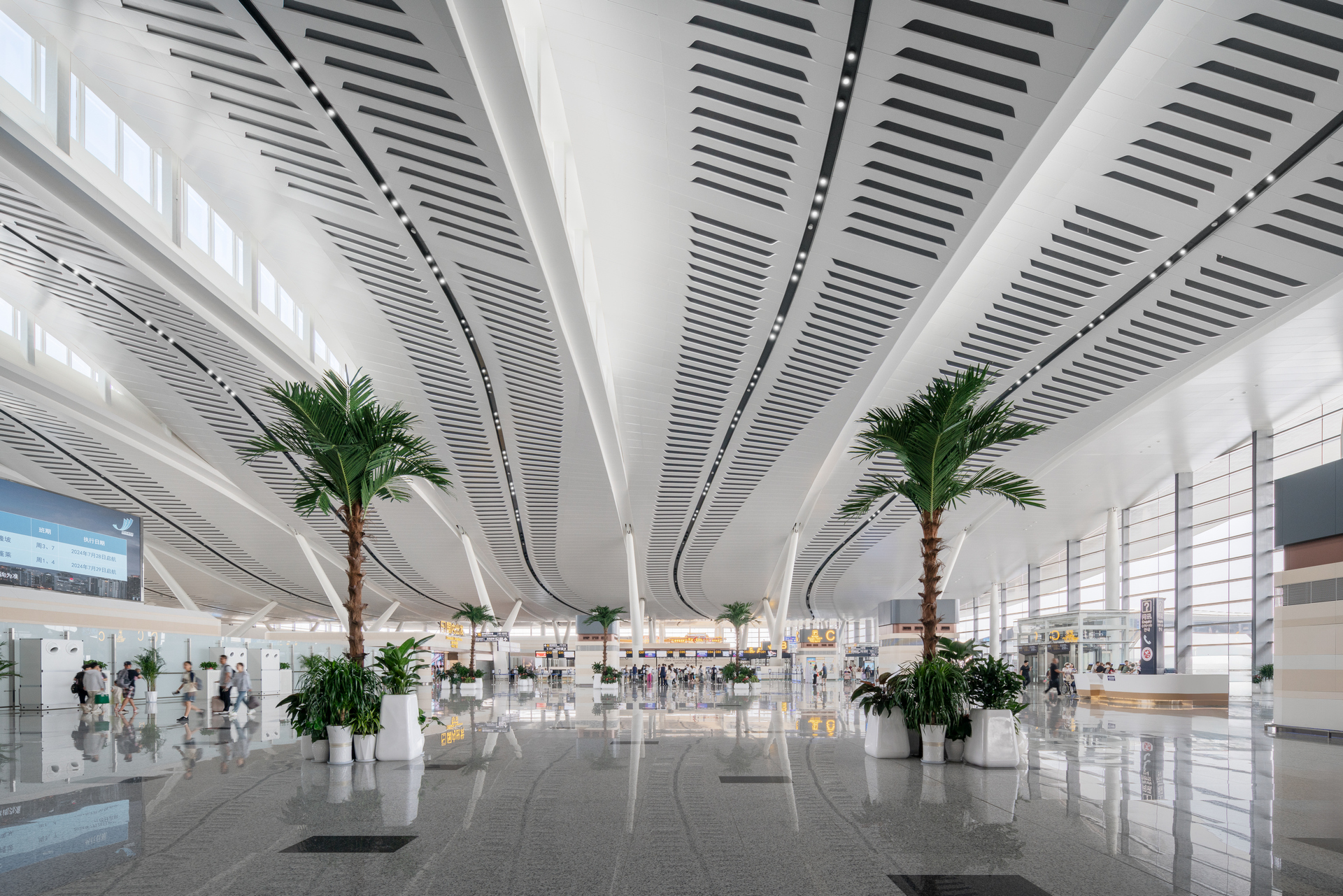 from the nearby Kunyu Mountain and Yantai’s coastal landscape to create a dynamic silhouette over the departure hall. A