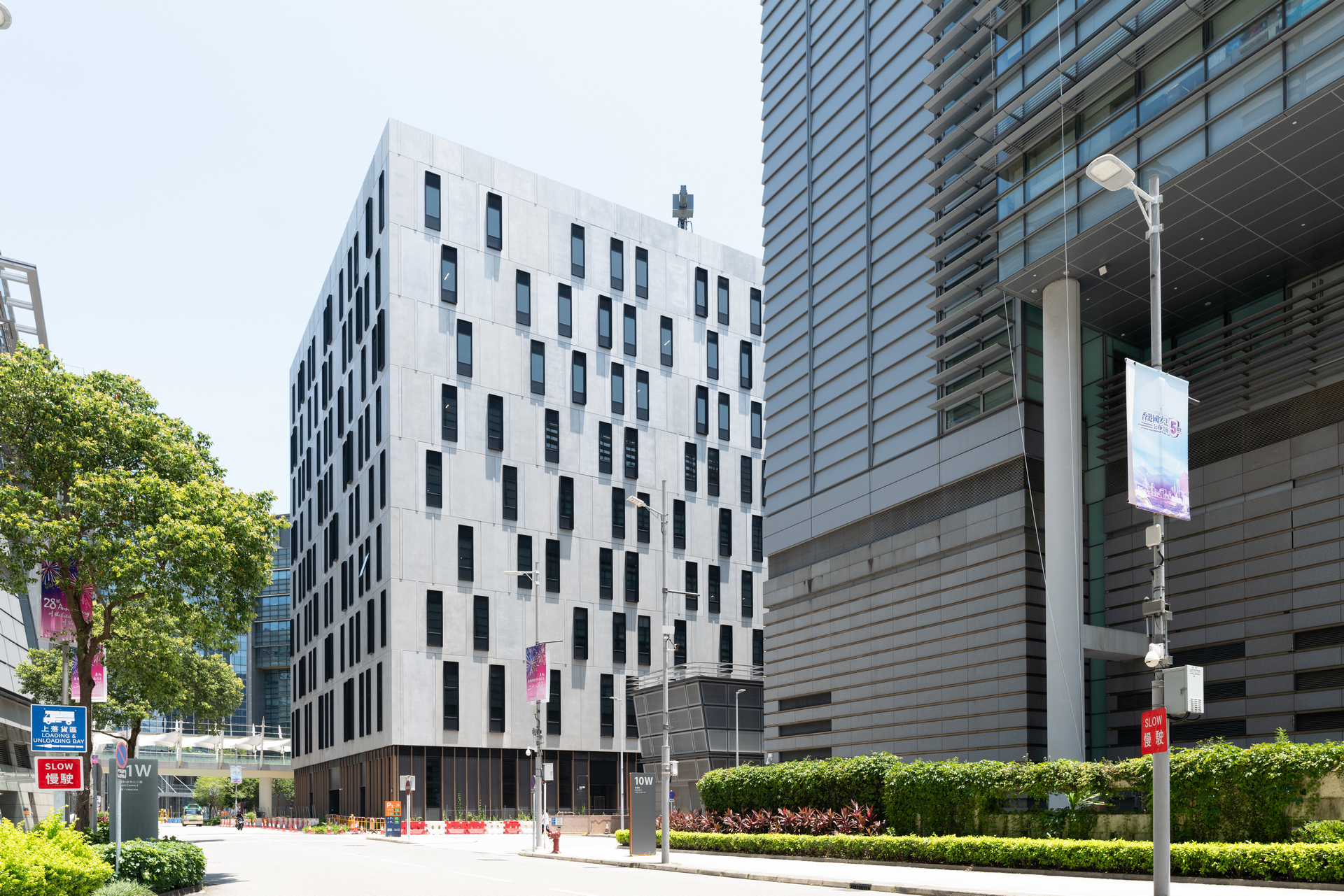 The building’s distinctive concrete façade contrasts with yet complements the surrounding glass curtain wall architecture of HKSTP. Early solar shading and heat gain studies helped drive the design to lower embodied carbon, while the concrete panels are prefabricated, lessening material waste and improving construction efficiency. The concrete itself is also enhanced with sustainable ground granulated blast furnace slag, reducing cement use. The integration of sustainable design and efficient building practices reinforces the building’s commitment to both environmental responsibility and user-centric performance.