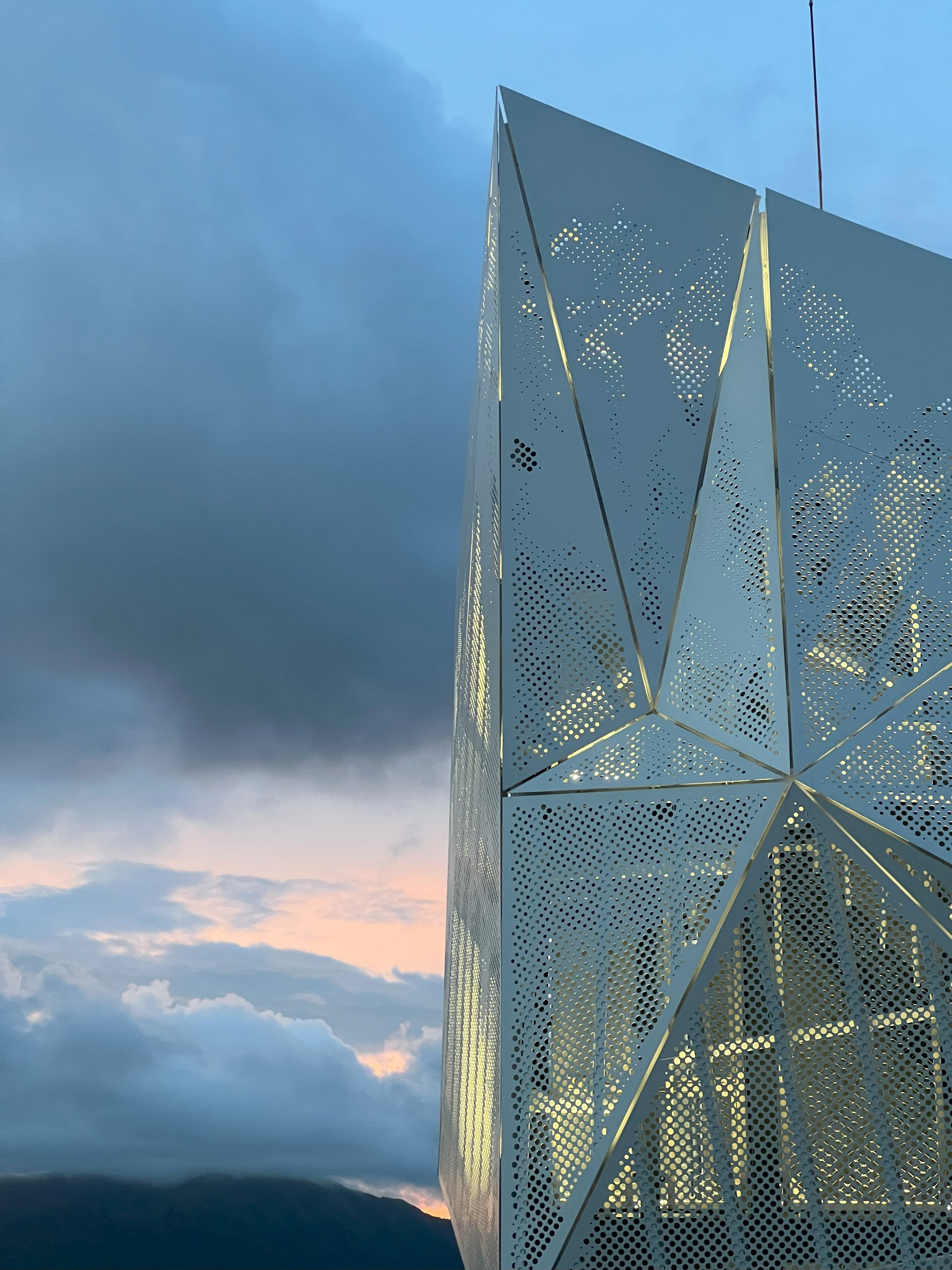 The Tai Po Kau Tide Gauge Station adopts the metaphor of an iceberg to highlight the urgency of climate change. To replace the former box-shape station situated at the end of Tai Po Kau Railway Pier, the new design drew inspiration from its coastal setting, surrounded by Pat Sin Leng and Ma On Shan ranges. The sculptural form resembles a glacier tip rising from the sea, symbolizing melting ice and rising tides due to global warming. A fair-faced concrete core anchors the structure, while a cladding system of perforated aluminum and mirrored stainless steel mimics ice crystallization and interacts with sunlight to animate the façade. An exposed stilling well, marks historical storm surges, alerting public about the past impacts. This station serves as a physical reminder of the threat of global warming, making the station both a scientific facility and a climate awareness landmark.