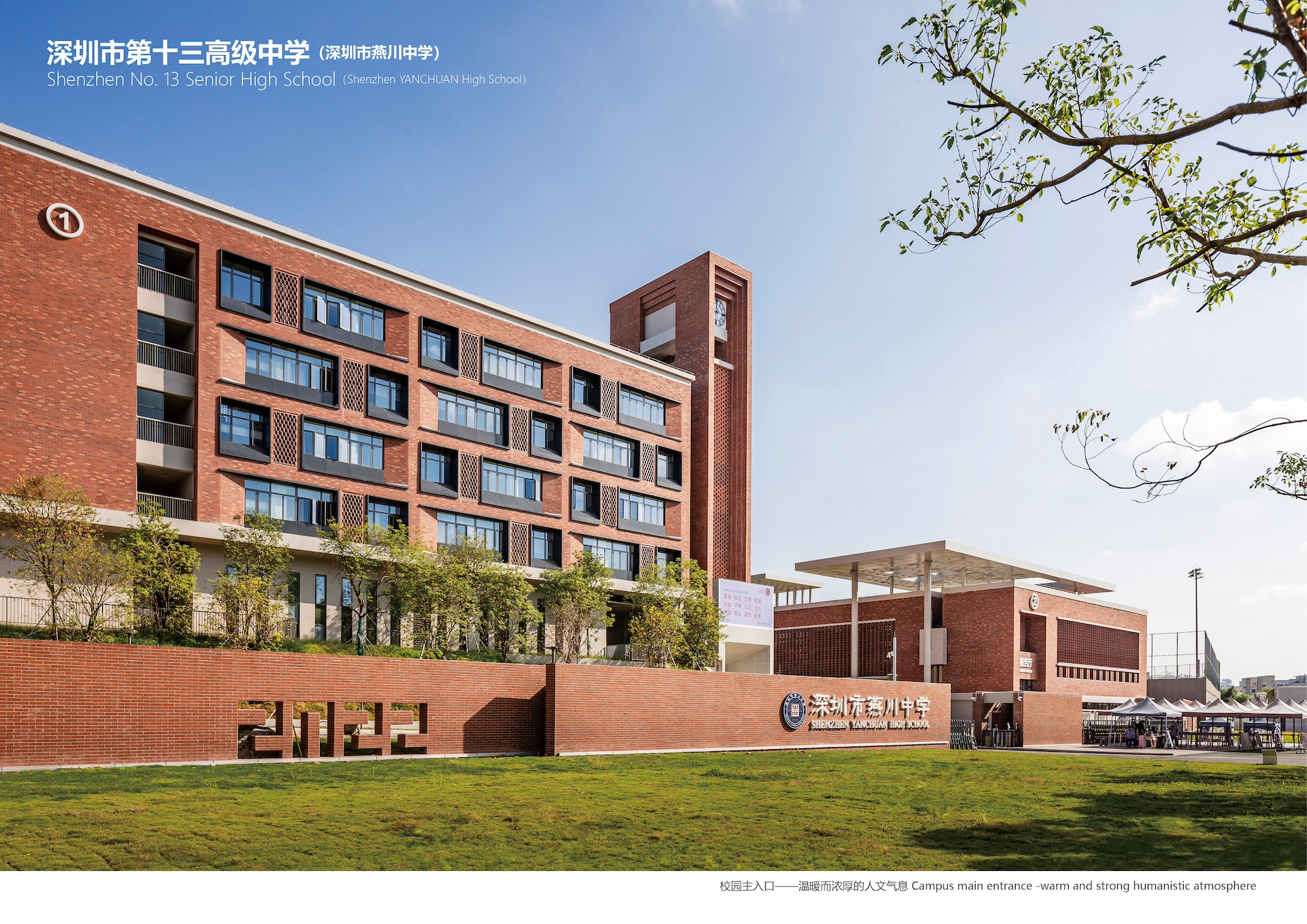 Shenzhen No. 13 Senior High School is located in Yanchuan Community, Yanluo Street, Bao'an District, with a land area of 87,085.29 square meters and a total construction area of 110,000 square meters. The campus buildings mainly include a comprehensive teaching building, lecture hall, library, gymnasium, canteen, STEAM center, student dormitories and teacher dormitories, etc. It is a boarding high school with 60 classes and can accommodate 3,000 places.
