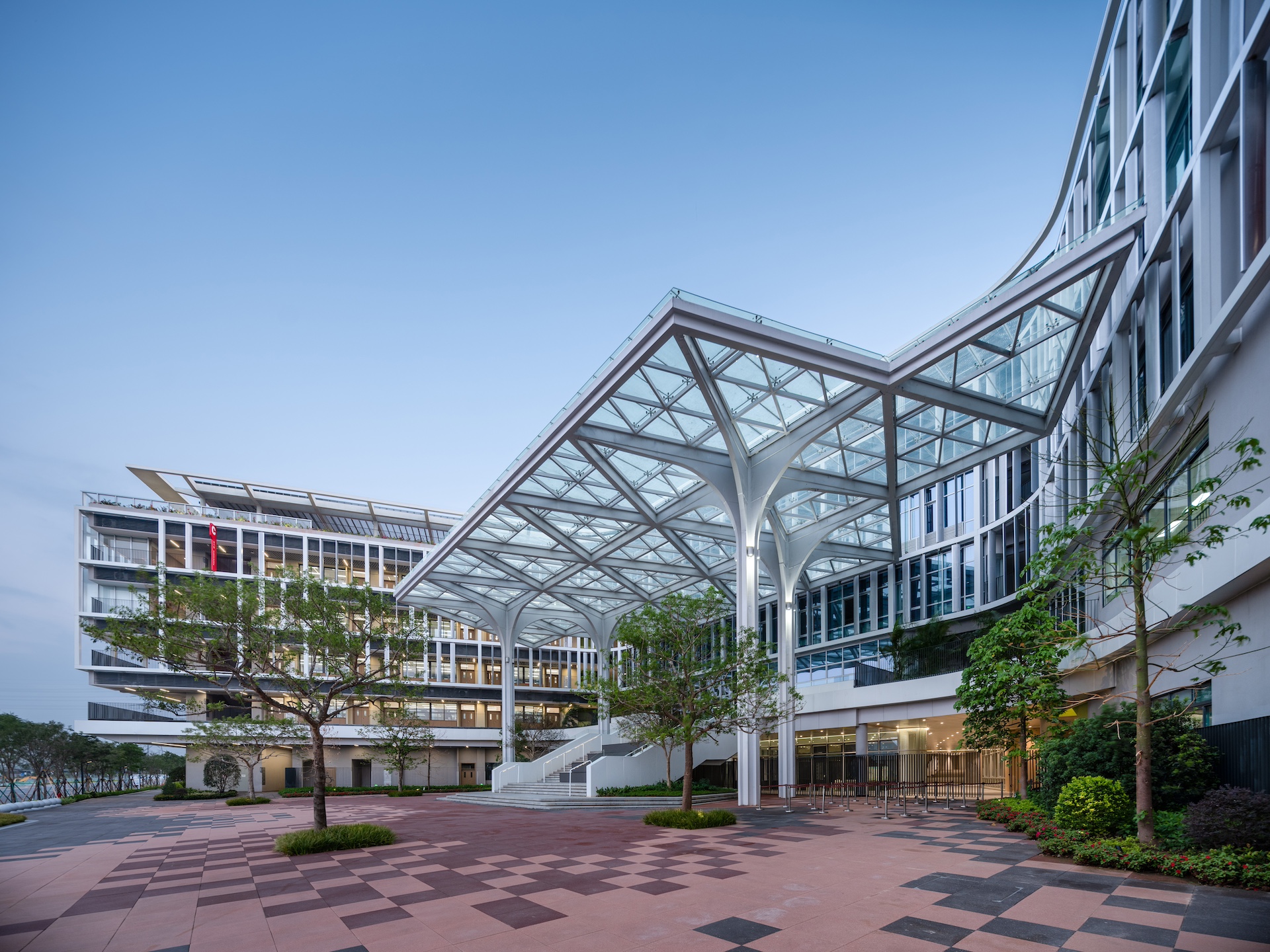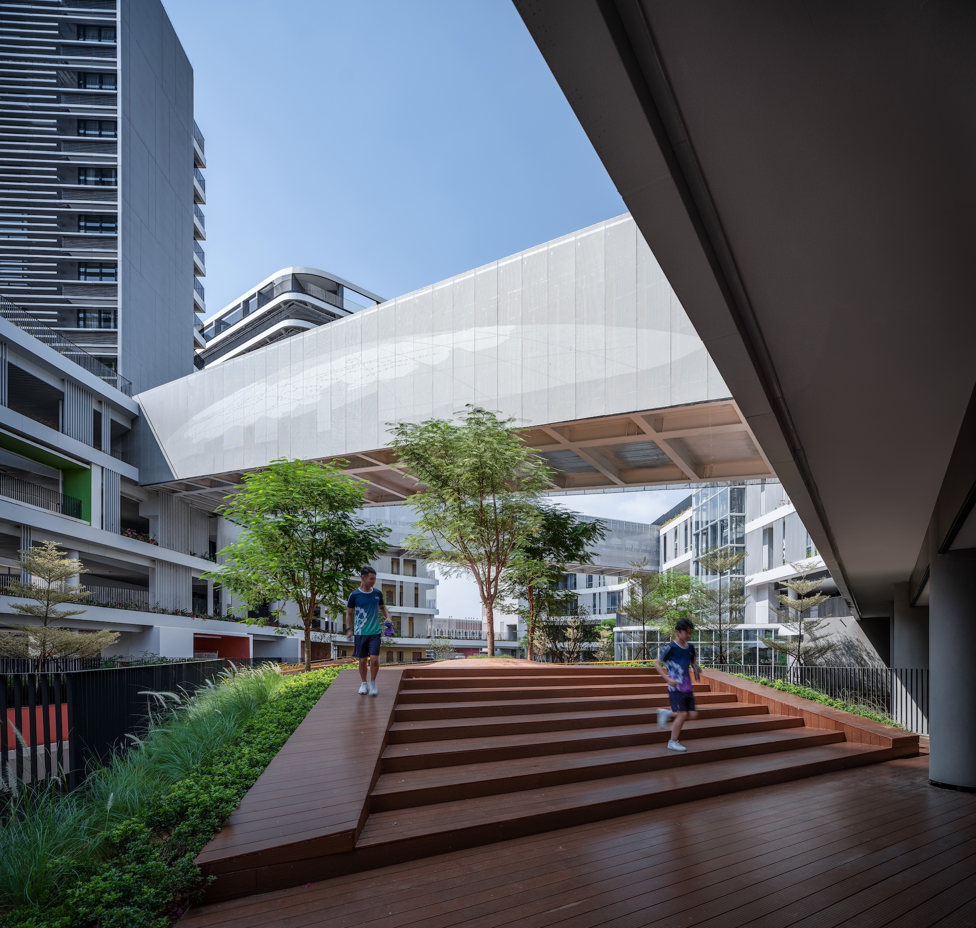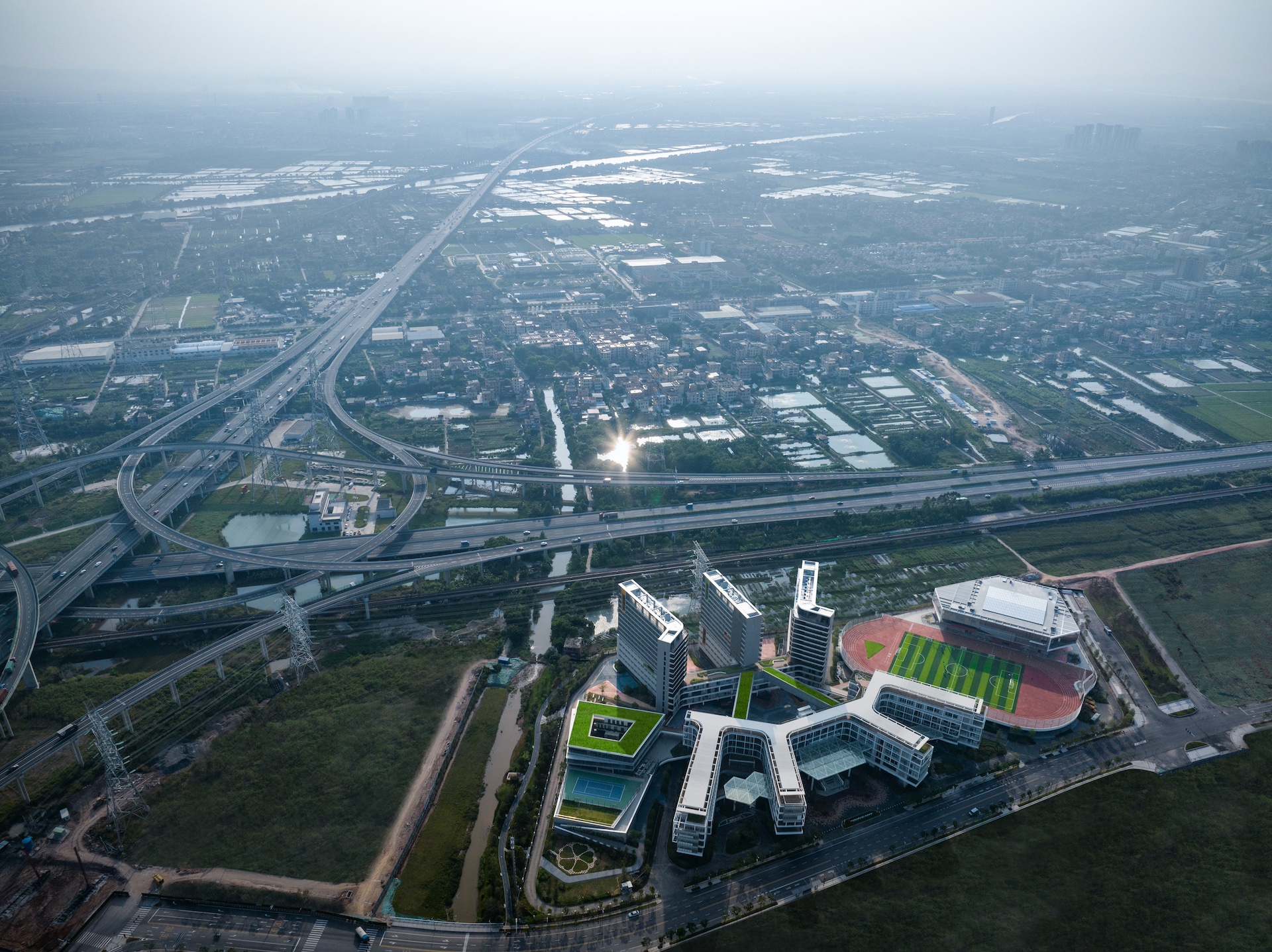 Covering approximately 93 acres with a total construction area of 76,000 square metres, the Minxin School project was a collaborative effort led by Academician He Jingtang, a member of the Chinese Academy of Engineering .The project, being the first inclusive school for Hong Kong residents’ children in the Chinese Mainland, adopts the educational philosophy of "Roots in Hong Kong, Heart for China, Global Outlook, and Broad-minded Thinking". The design follows principles such as "secondary ground level", "centripetal enclosure", "branch-like growth", and "three-dimensional landscaping". These architectural concepts resonate with the school's philosophy of unity and connection. The project successfully strikes a balance between high-density construction, high-quality spatial design, and a high-grade environment.