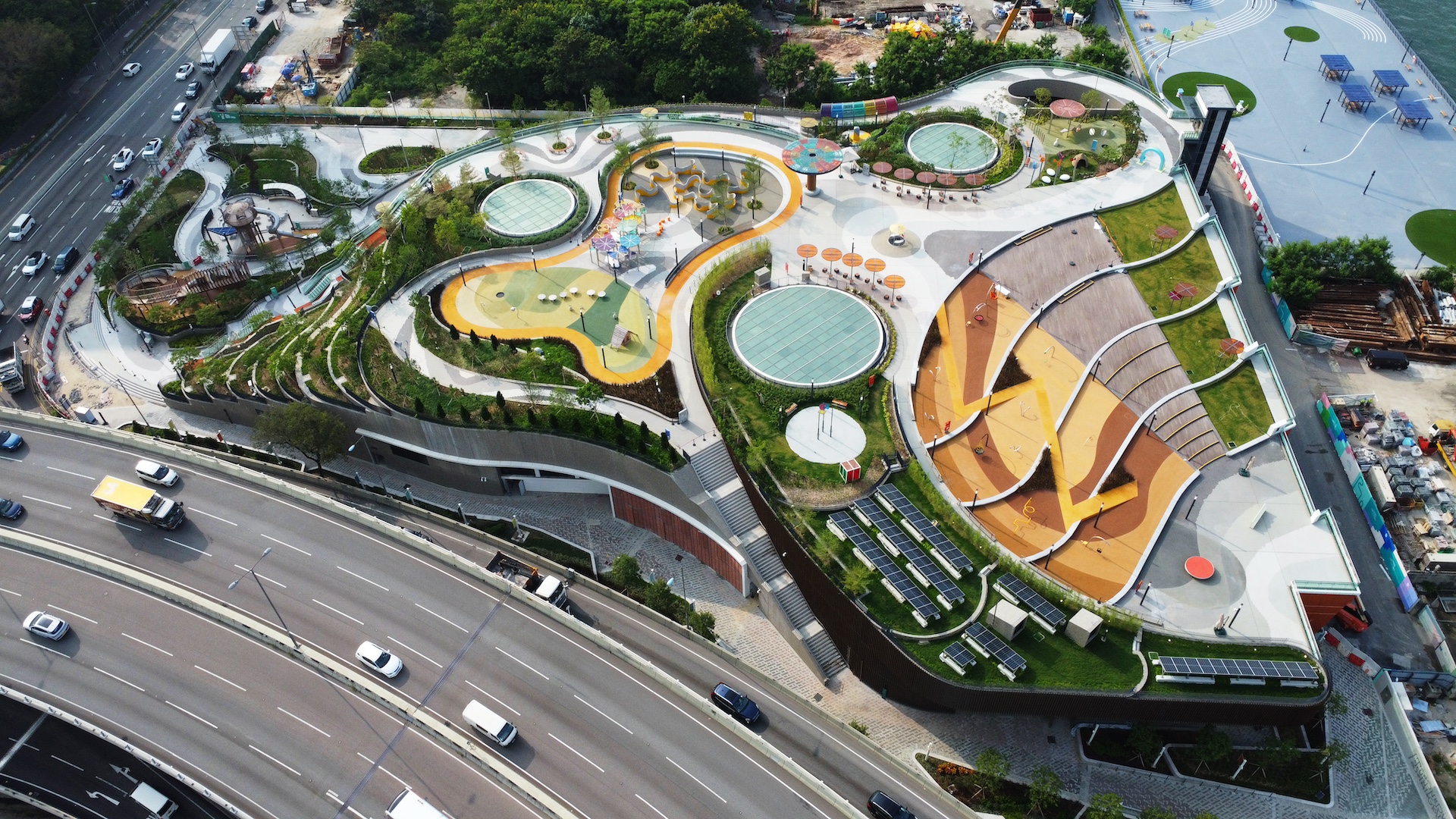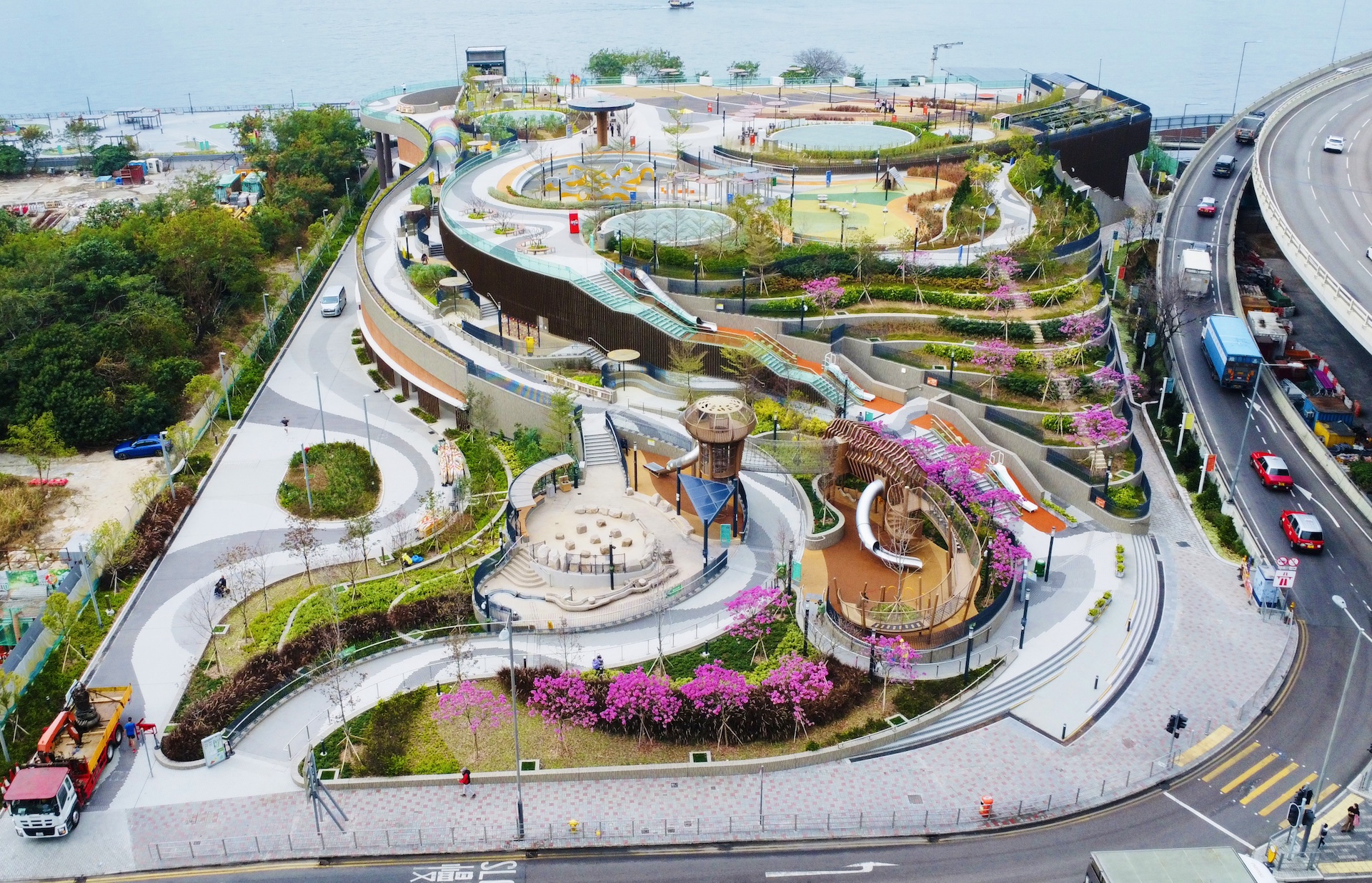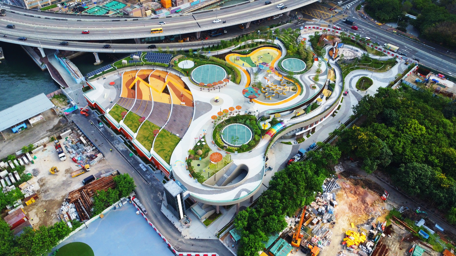 The Cha Kwo Ling Promenade is a shining example of sustainability and innovation in urban development. This 1.8-hectare waterfront space integrates the “single site, multiple use” concept by transforming the roof of the Kwun Tong Sewage Pumping Station into a vibrant landscaped deck. The Landscaped deck, known as the “Pump Park,” features over 60 play facilities, including a popular water play area, catering to all age groups with different ability.
