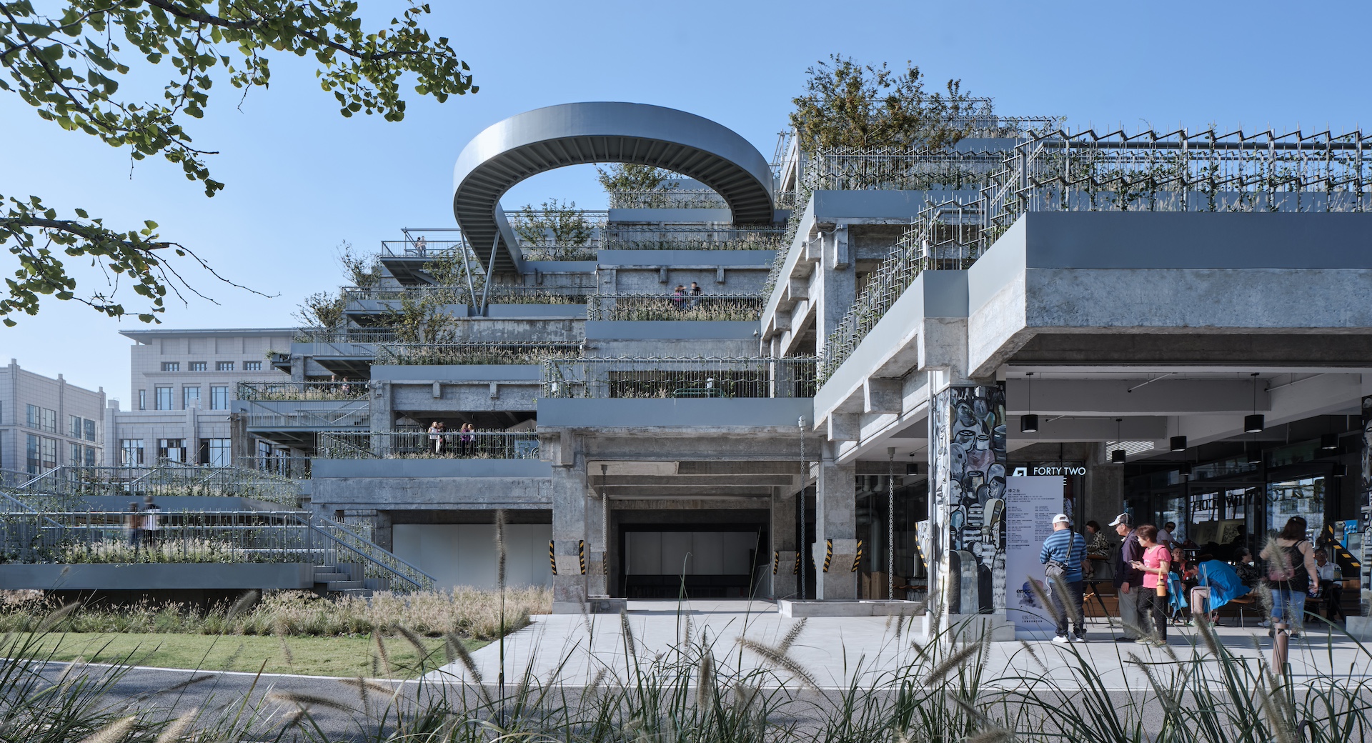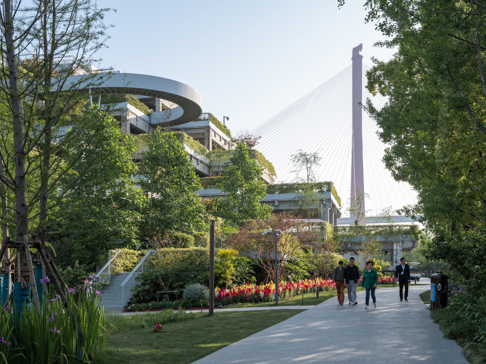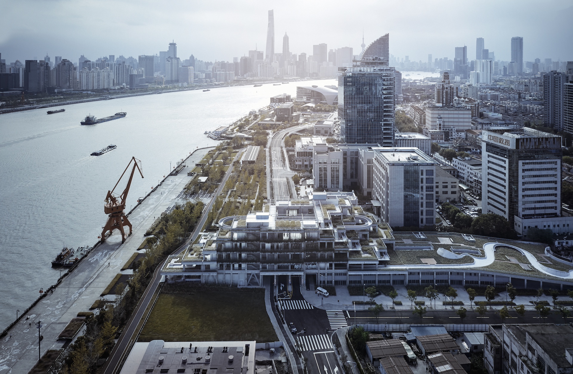 Situated in the waterfront public space of Huangpu River, Green Hill is a complex consisted of City Park, Shared Exhibition Halls, Women and Children's Activity Center and various public service spaces. The former warehouse of Shanghai Tobacco Co. Ltd was meant to be dismantled, but now it is covered with green plants and connects the waterfront with its urban hinterland. It breaks the barrier between the waterfront and its hinterland by setting up a slope, forming a path from the city to the waterfront. It opens up the city to the river by cutting off part of the building, reducing its oppression to the waterfront and shaping layered setback platforms. The project thus provides people with abundant experiences and unexpected opportunities.