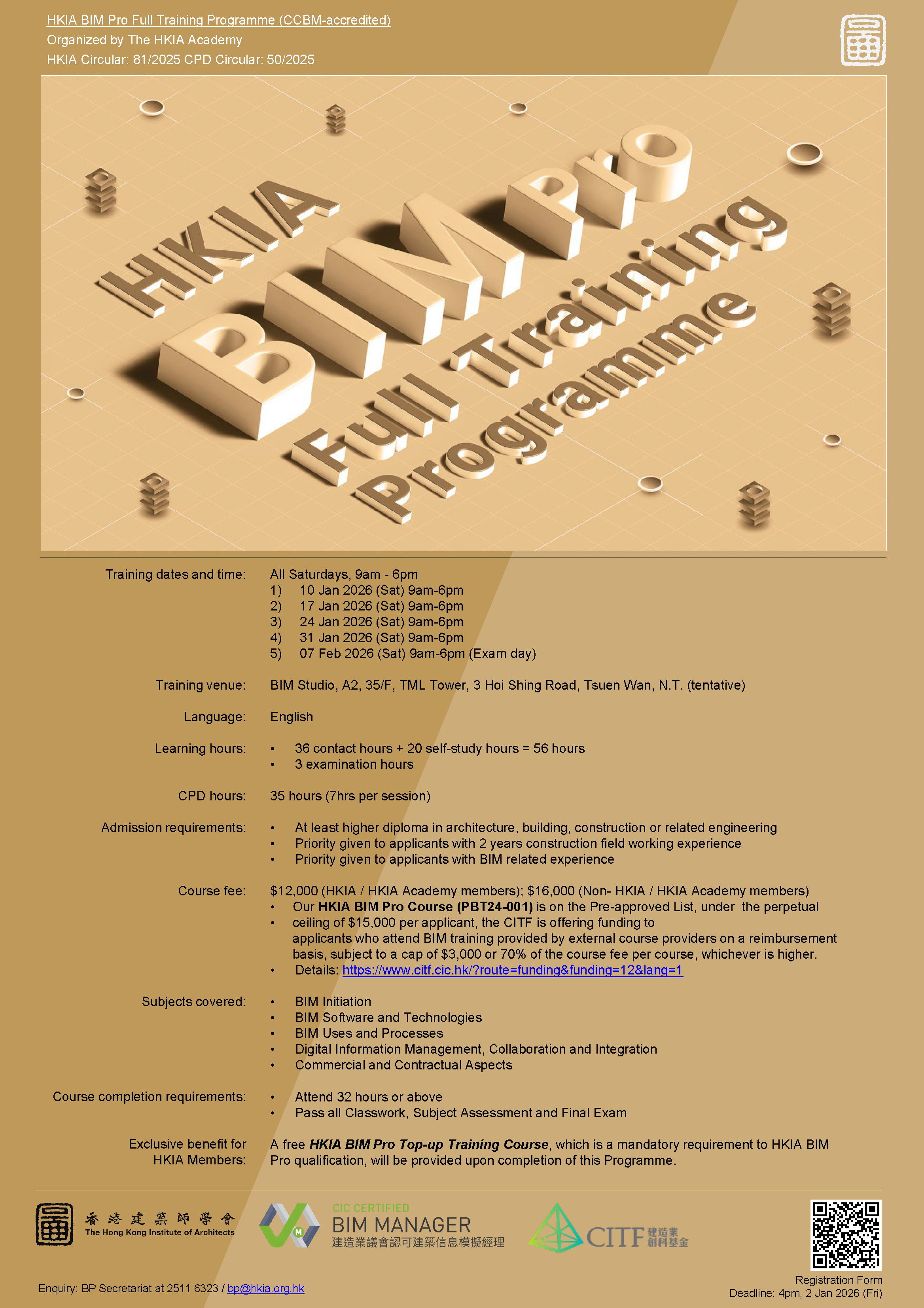 As an exclusive benefit for HKIA Members, A free BIM Pro Top-up Training Course will be provided upon completion of this Programme.
