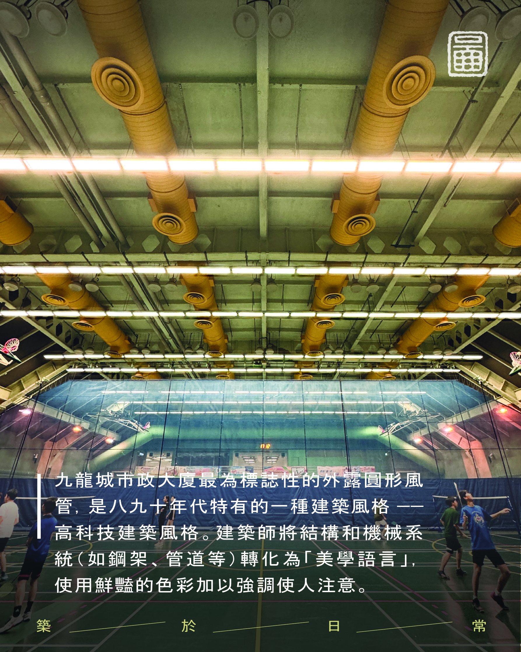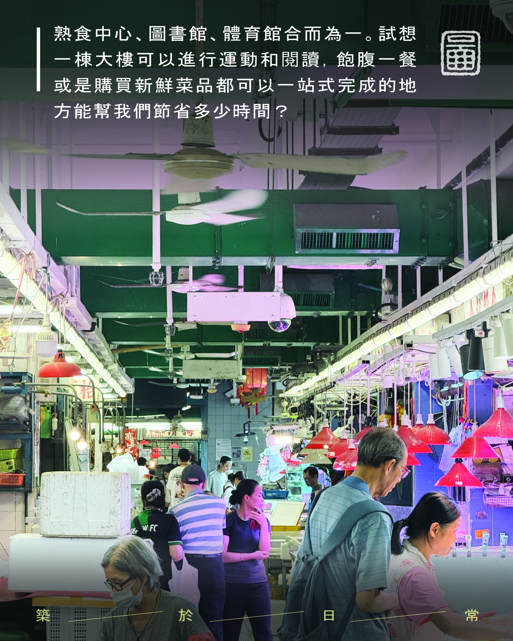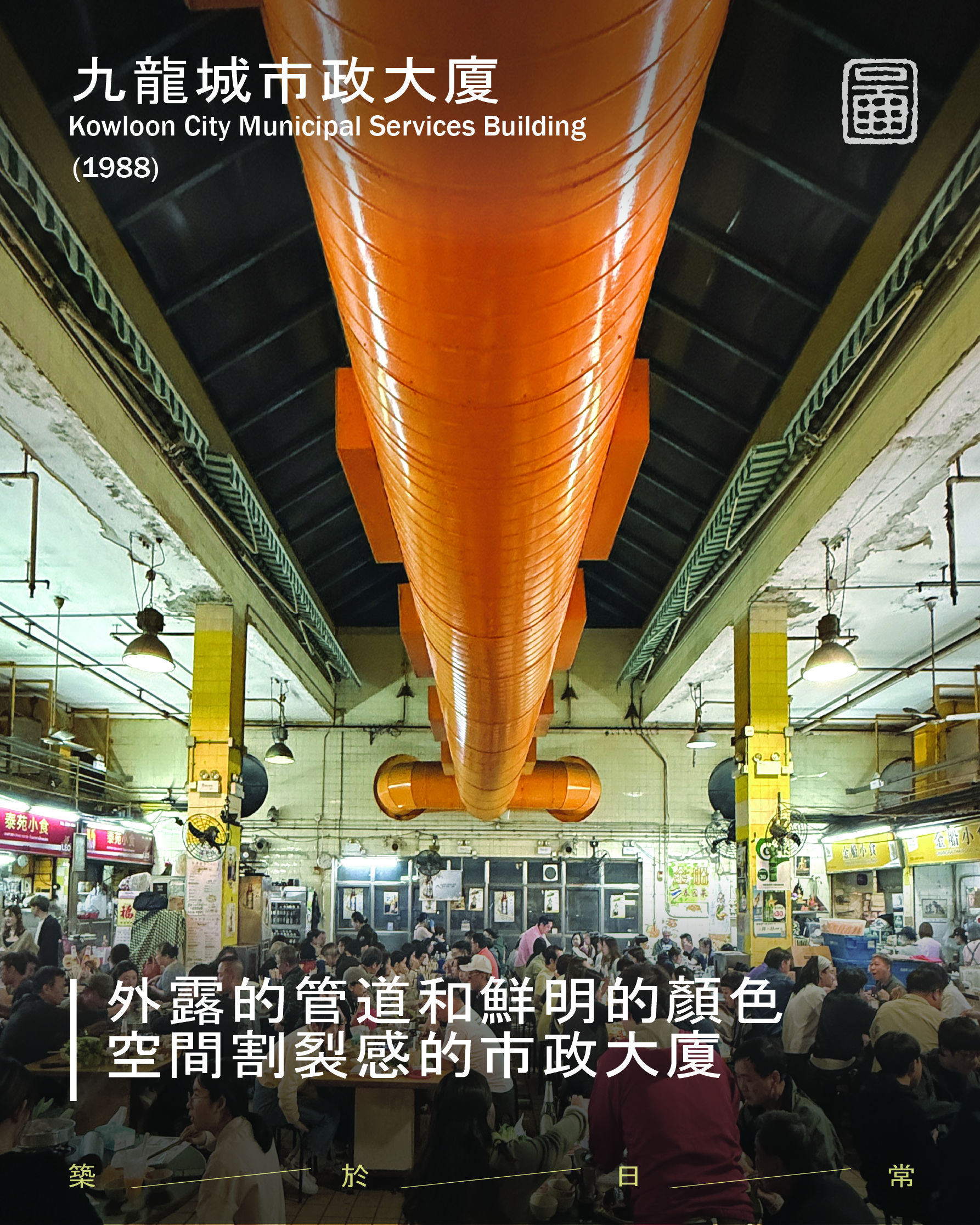 Designed by Palmer & Turner, the building placed the wet market on the ground floor, dry goods on the first floor, and let yellow service pipes cut through the upper levels housing the cooked food centre and sports hall. Each floor was conceived as a distinct spatial environment with its own functions. Moving between levels means stepping into a different world — the quiet of the library separated from the bustle of the market by just a single storey. This intense spatial contrast reflects, perhaps, the Hong Kong pursuit of efficiency.