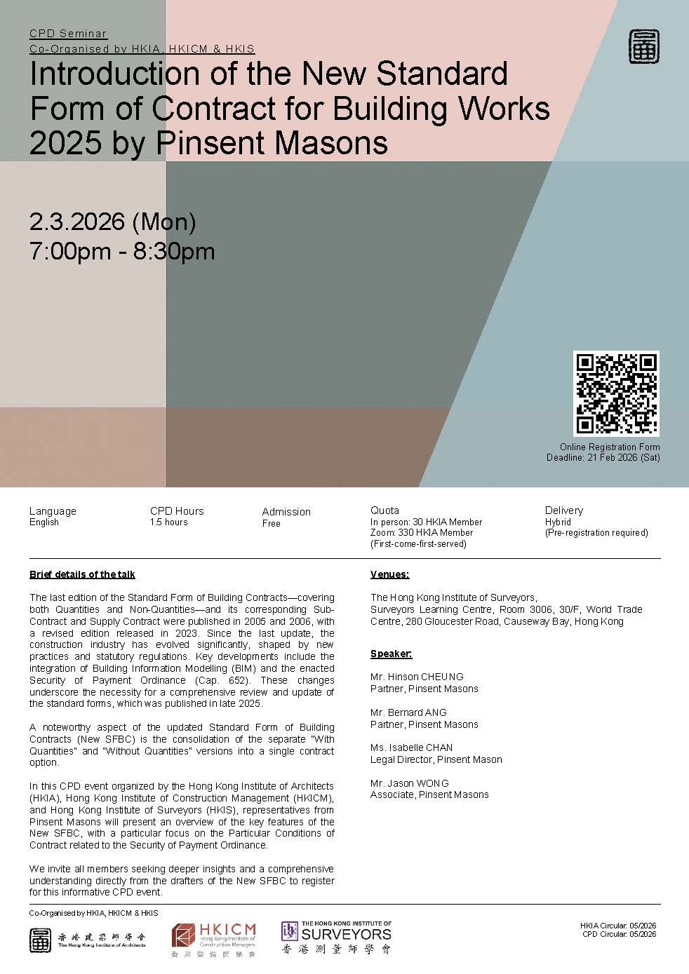 In this CPD event organized by the Hong Kong Institute of Architects (HKIA), Hong Kong Institute of Construction Management (HKICM), and Hong Kong Institute of Surveyors (HKIS), representatives from Pinsent Masons will present an overview of the key features of the New SFBC, with a particular focus on the Particular Conditions of Contract related to the Security of Payment Ordinance.