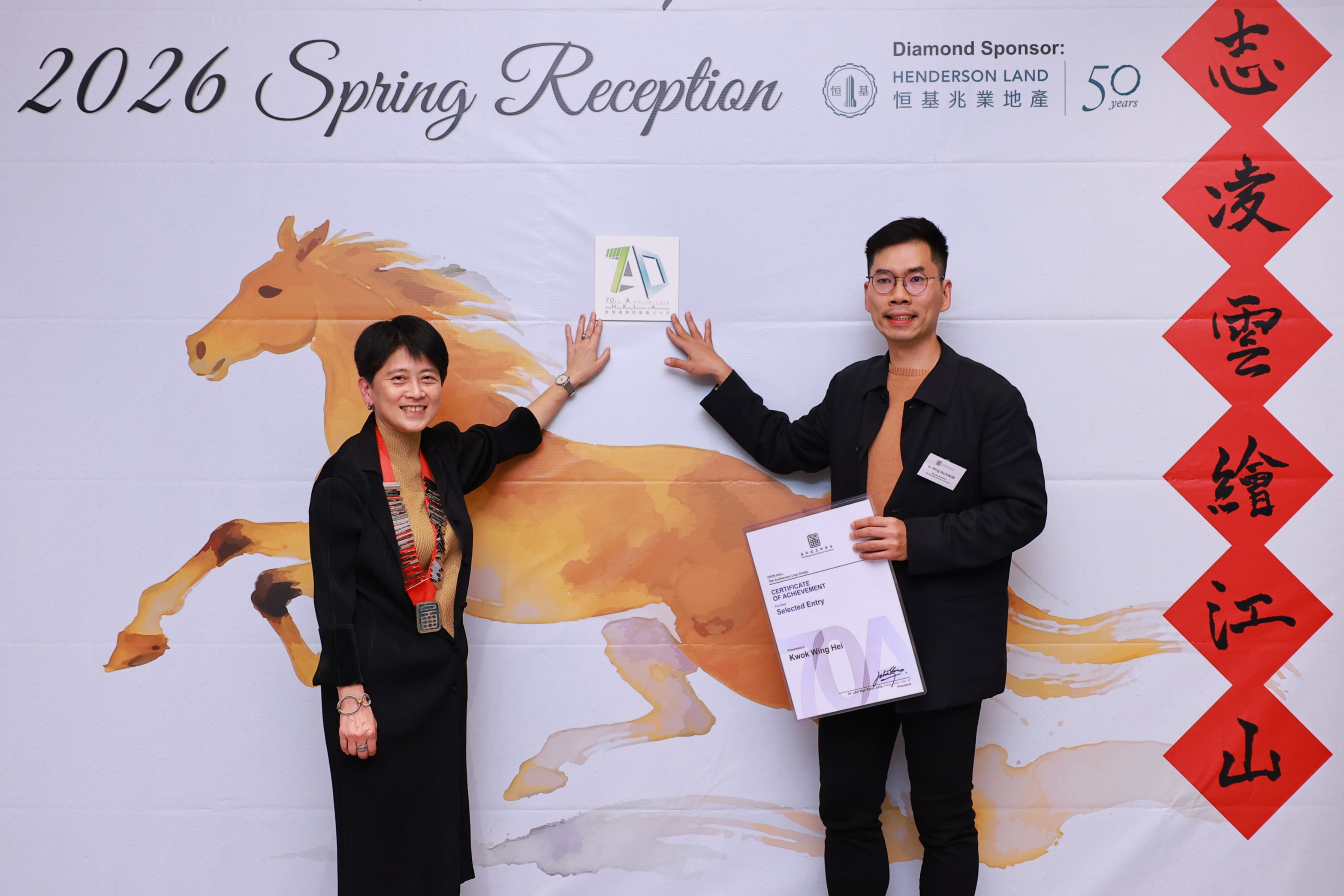 On the evening of 27 February, at the HKIA Spring Reception, HKIA proudly revealed the 70th Anniversary Logo Design. After a rigorous selection process, Mr. Kwok Wing Hei emerged as the selected entry, along with two other outstanding entries and 16 shortlisted. The selected design was chosen by a distinguished panel of five, composed of our experienced members and a renowned designer, led by HKIA President Julia Lau, who evaluated each submission for creativity, relevance, and alignment with the Institute’s legacy.