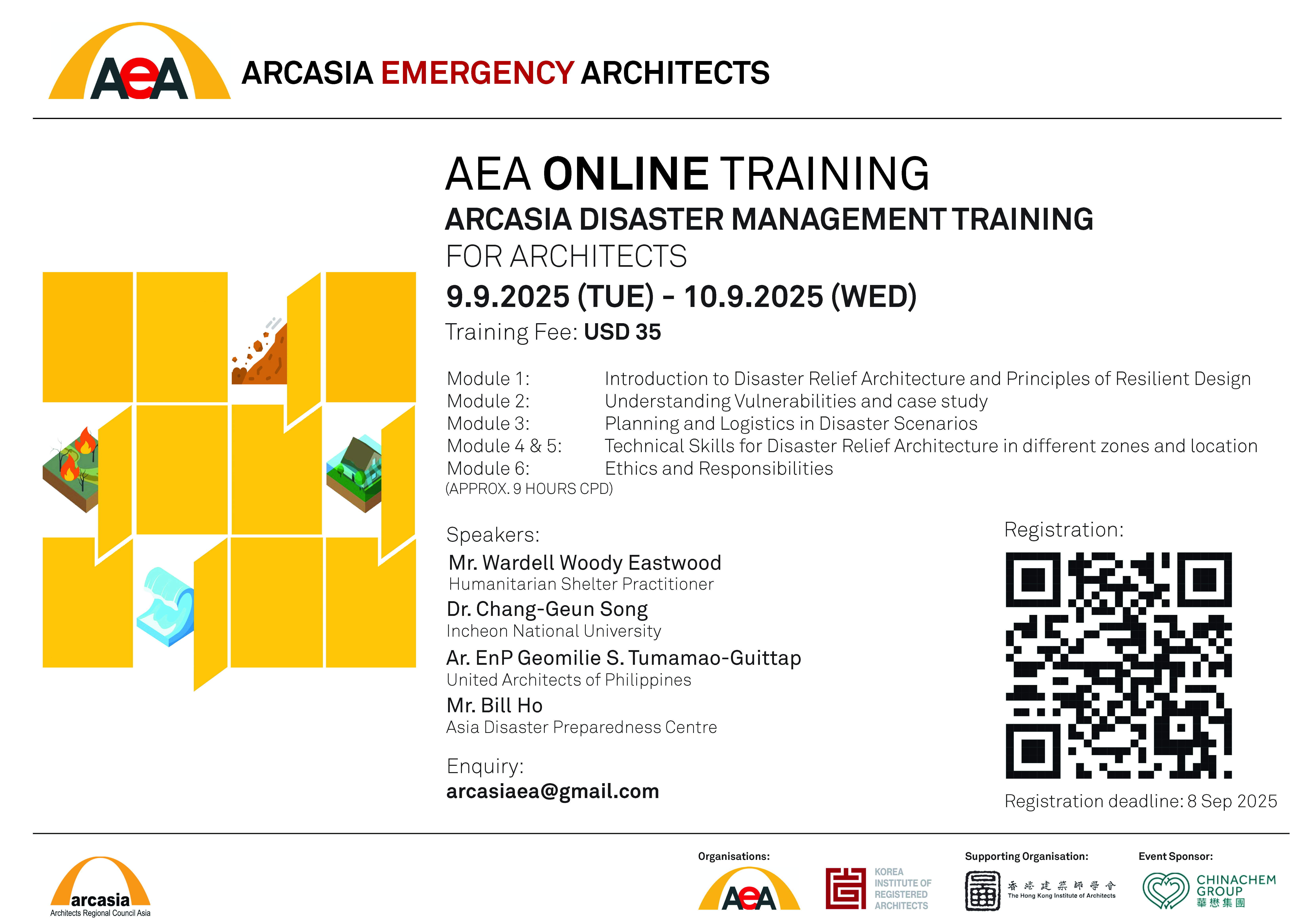Full Members and Fellows of ARCASIA Member Institutes are welcome to register for the ARCASIA Emergency Architects (AEA) Training 2025 by completing the Online Form below on or before 8 Sep 2025 at 9 AM.