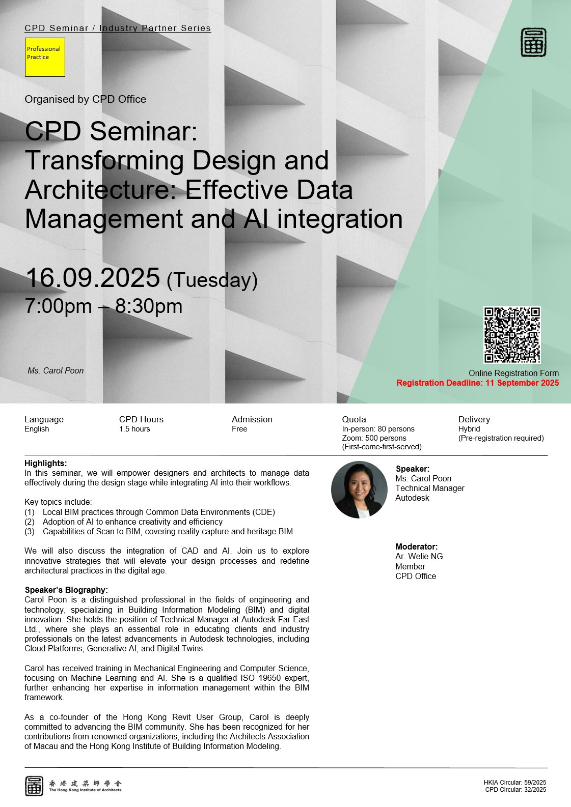 As a co-founder of the Hong Kong Revit User Group, Carol is deeply committed to advancing the BIM community. She has been recognized for her contributions from renowned organizations, including the Architects Association of Macau and the Hong Kong Institute of Building Information Modeling.