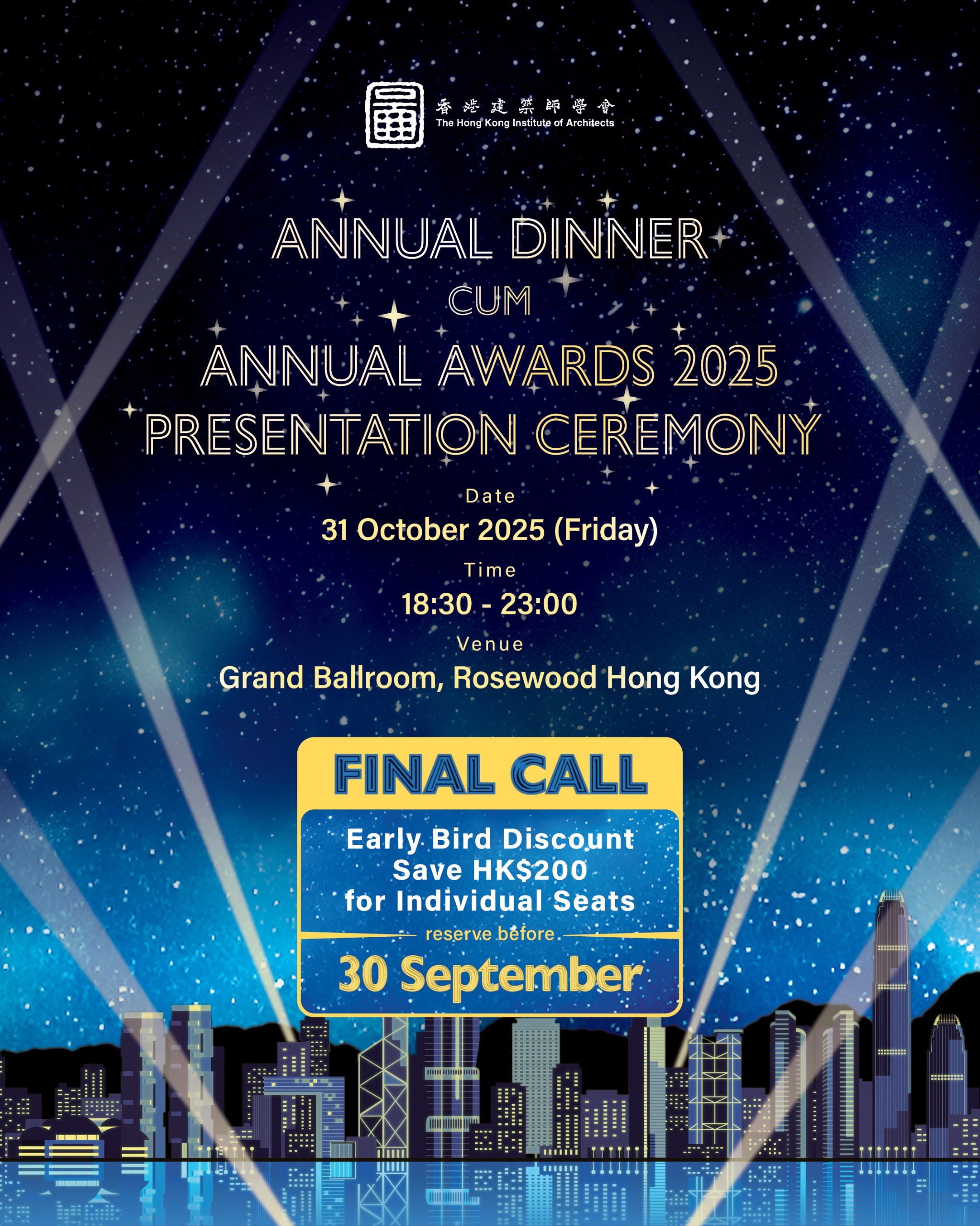 We are pleased to extend the early bird offer on table reservation to 30 September 2025 (Tuesday) 23:59 with up to 10% discount which saves HK$200 for individual seats.