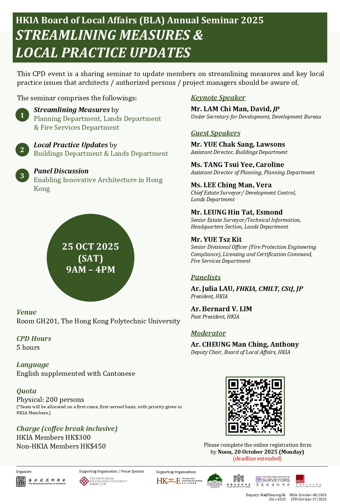 This CPD event is a sharing seminar to update members on streamlining measures and key local practice issues that architects / authorized persons / project managers should be aware of.