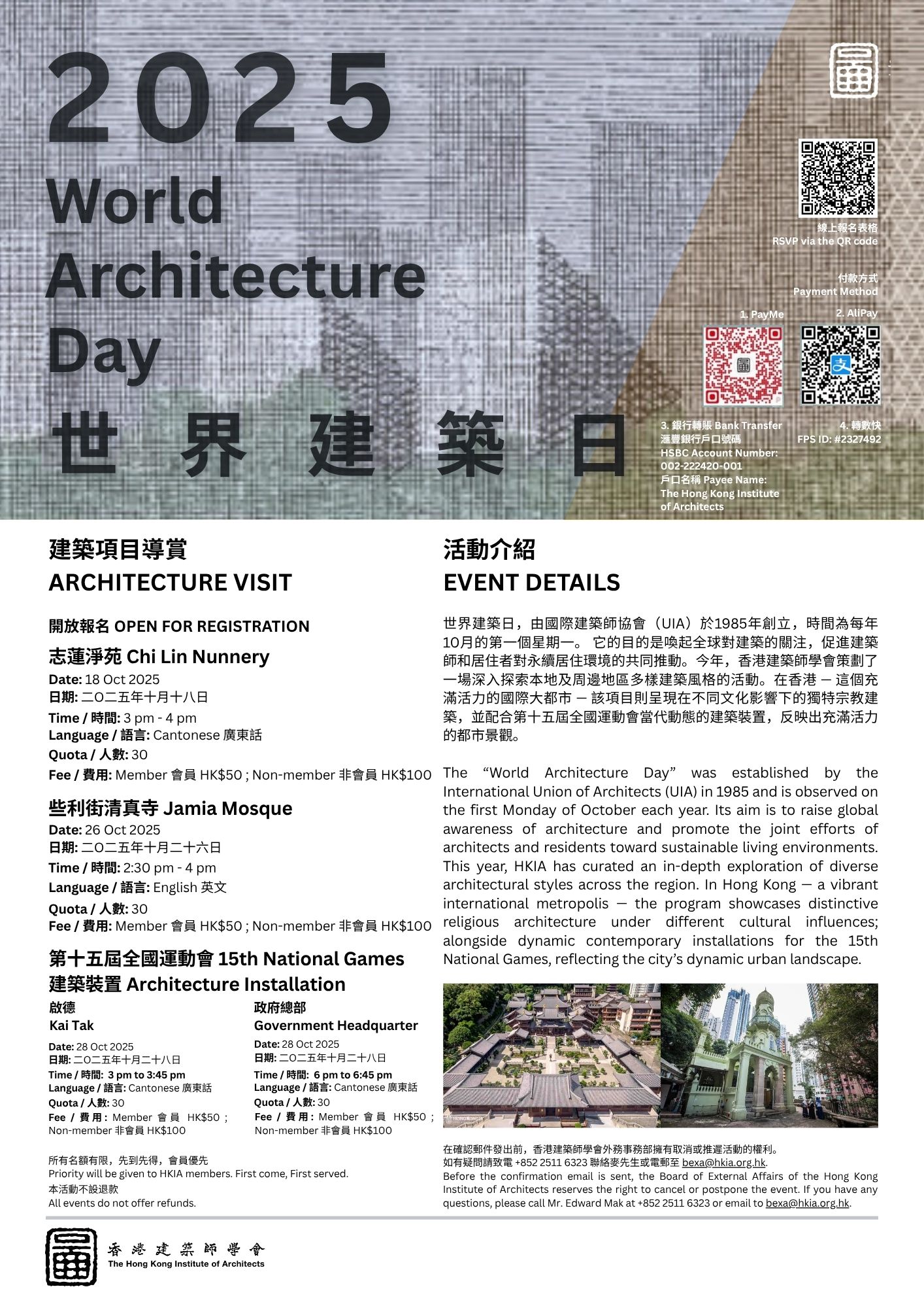 The “World Architecture Day” was established by the International Union of Architects (UIA) in 1985 and is observed on the first Monday of October each year. Its aim is to raise global awareness of architecture and promote the joint efforts of architects and residents toward sustainable living environments. This year, HKIA has curated an in-depth exploration of diverse local architectural styles. In Hong Kong — a vibrant international metropolis — the program showcases distinctive religious architecture under different cultural influences; alongside dynamic contemporary installations for the 15th National Games, reflecting the city’s dynamic urban landscape.