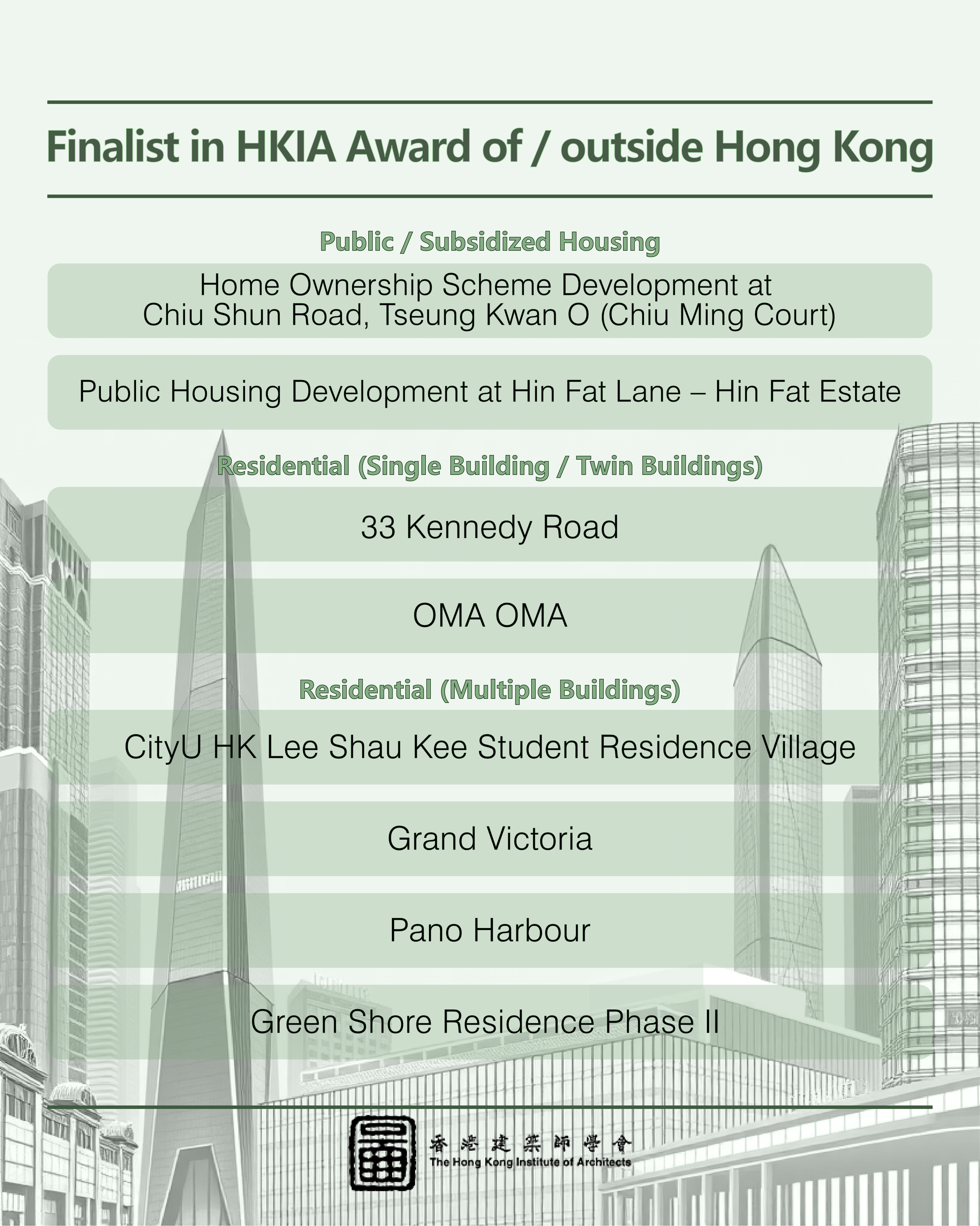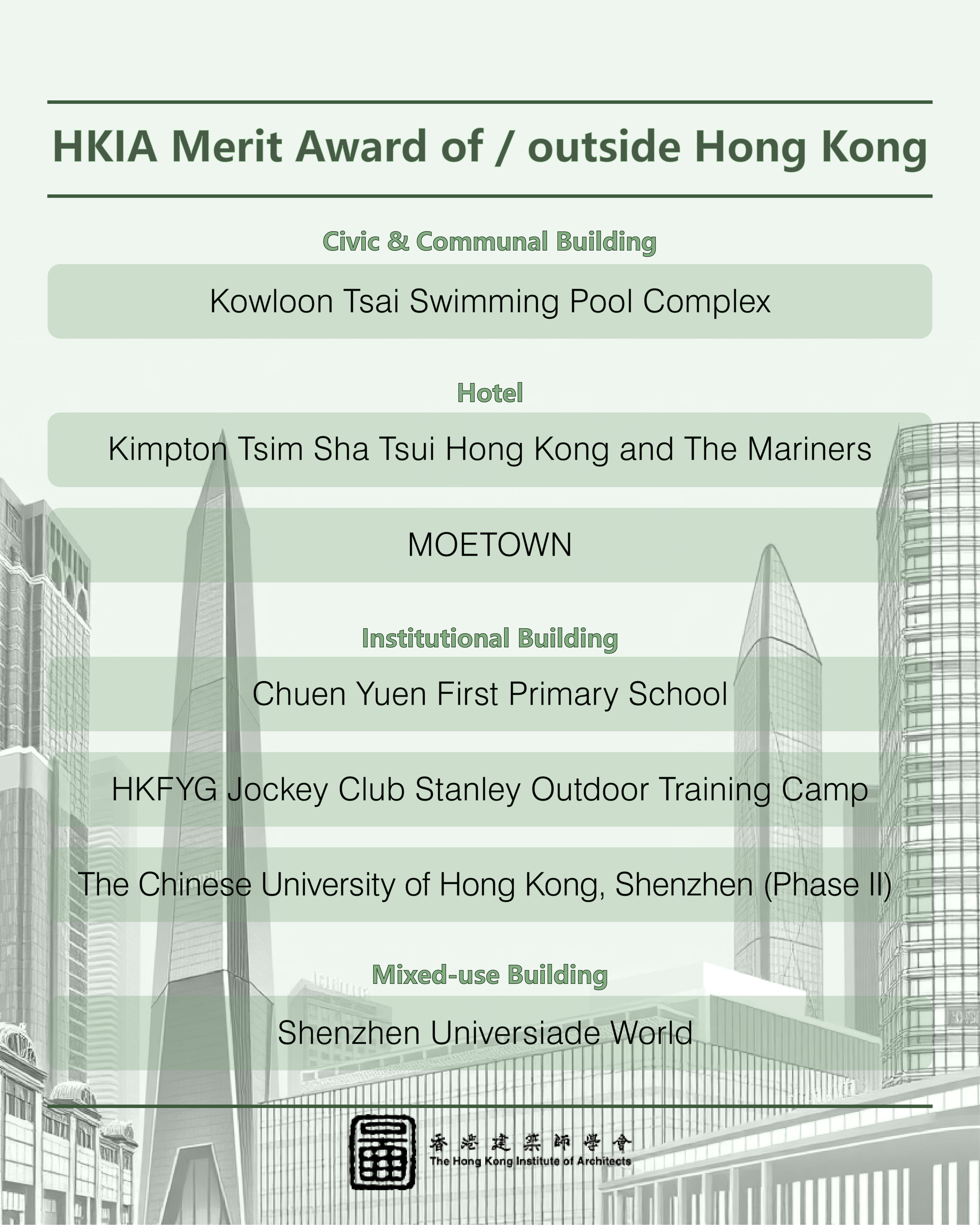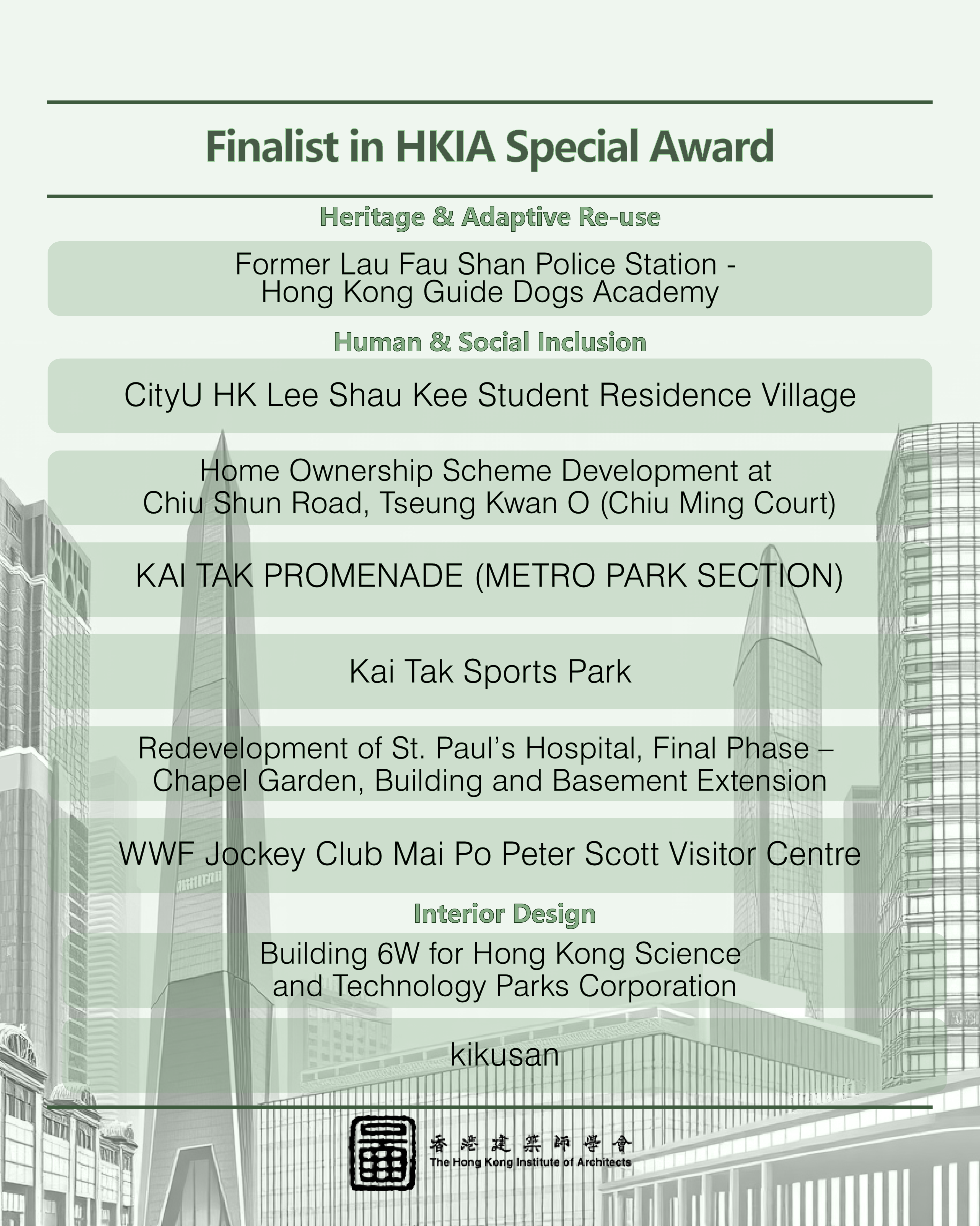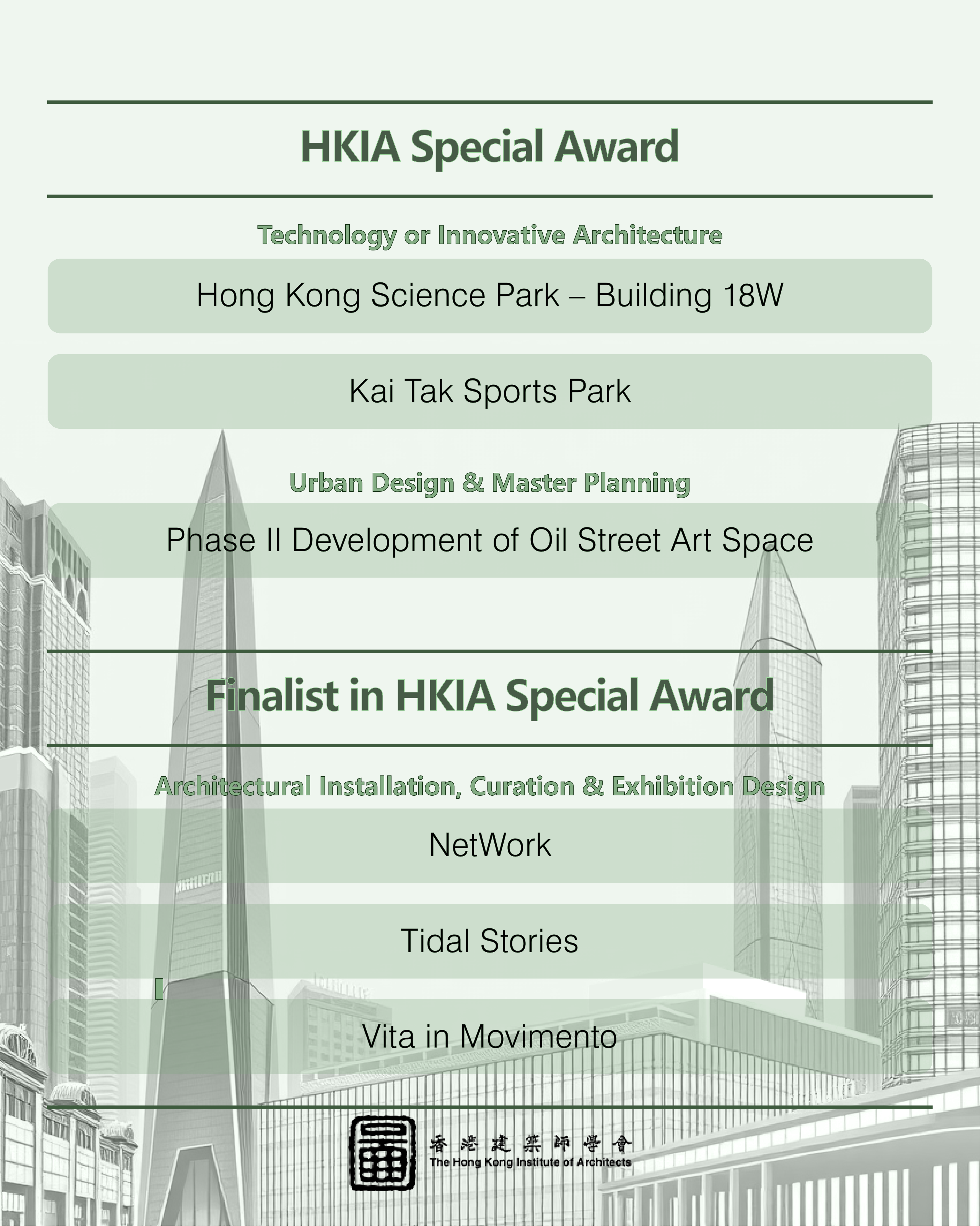 This year, we received an impressive record total of 112 nominations, setting a new benchmark in recent years. From these, 71 outstanding projects made it to the shortlist, competing in three main categories: "HKIA Medal of the Year of/outside Hong Kong," "HKIA Award for Small Projects – President’s Prize," and "HKIA Special Award."