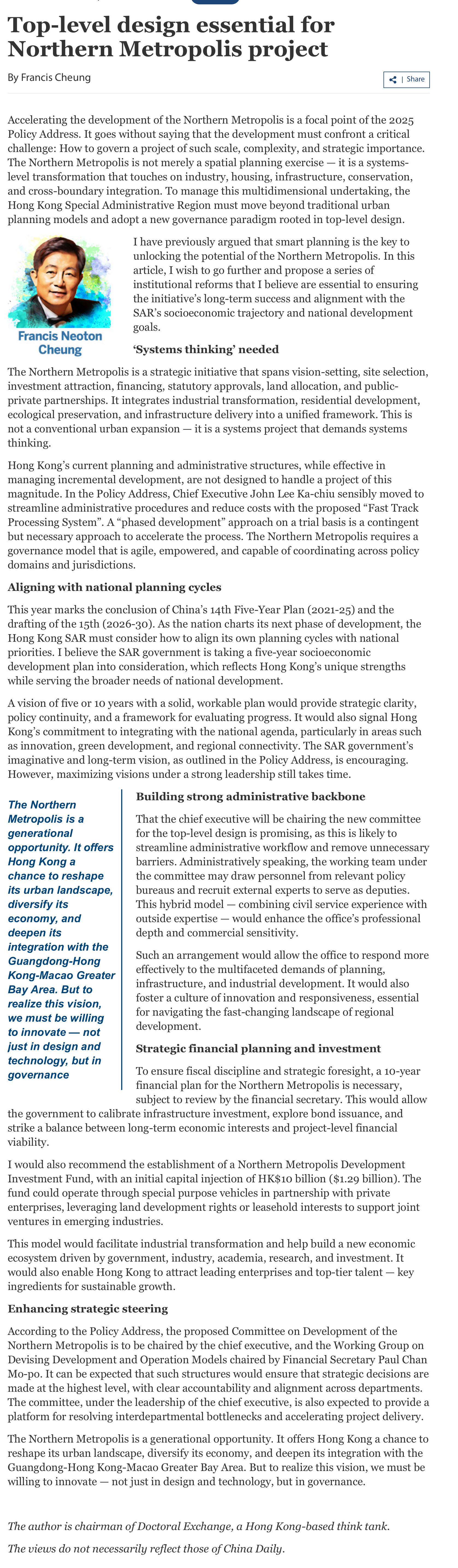 Top-level design essential for Northern Metropolis project Chinadaily Opinion