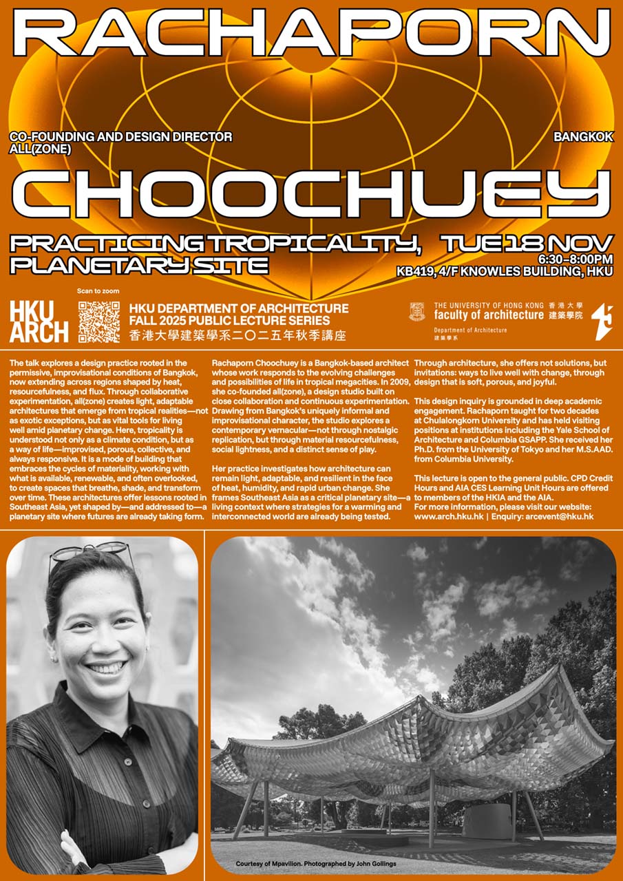The talk explores a design practice rooted in the permissive, improvisational conditions of Bangkok, now extending across regions shaped by heat, resourcefulness, and flux. Through collaborative experimentation, all(zone) creates light, adaptable architectures that emerge from tropical realities—not as exotic exceptions, but as vital tools for living well amid planetary change. Here, tropicality is understood not only as a climate condition, but as a way of life—improvised, porous, collective, and always responsive. It is a mode of building that embraces the cycles of materiality, working with what is available, renewable, and often overlooked, to create spaces that breathe, shade, and transform over time. These architectures offer lessons rooted in Southeast Asia, yet shaped by—and addressed to—a planetary site where futures are already taking form.
