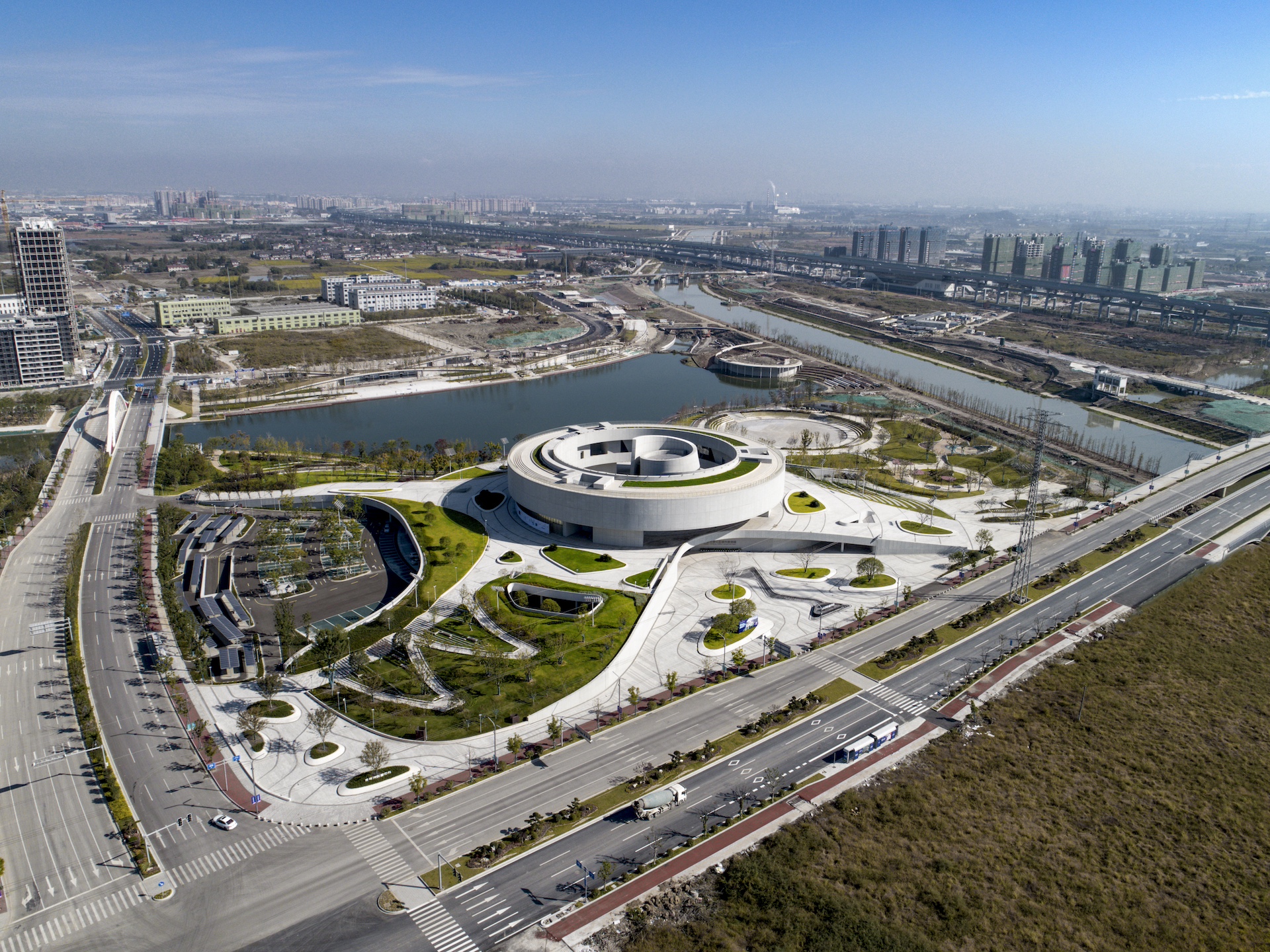 宁波市奉化区未来城科普中心坐落在风景优美的奉心湖旁,是融合了景观公园的城市规划展览馆。设计构思通过“交织空间”,将公共景观丶建筑丶人的活动在场地上组织成一个整体,使其成为一处充满活力的丶公共开放的城市空间。