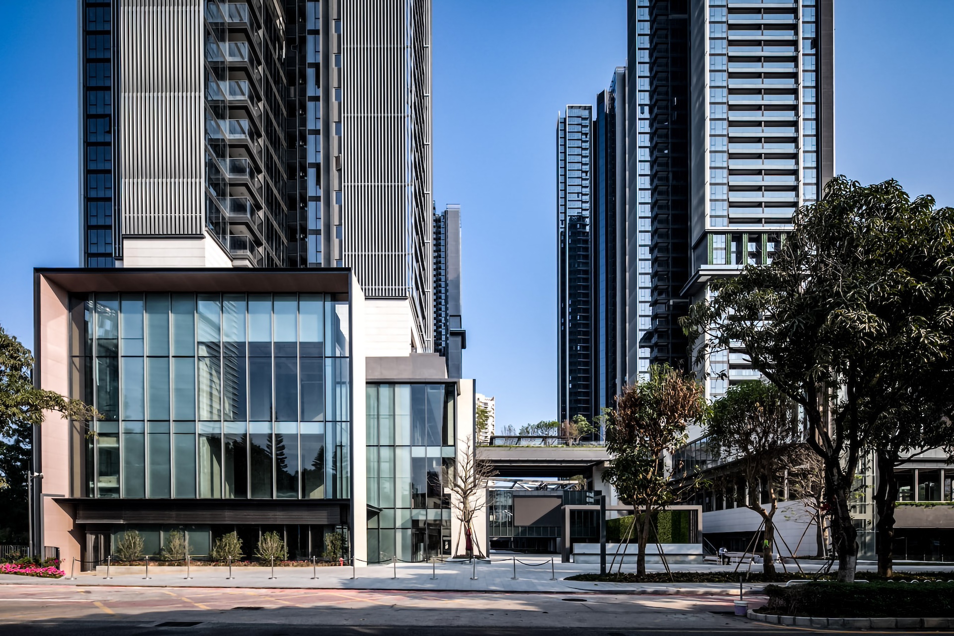 本项目用地面积4.03万㎡,总建筑面积29.9万㎡,容积率4.76,用地东西长,南北稍短,地势南高北低,高差1至4米不等。总体布局采用因地制宜的设计策略,裙房通过营造层次丰富的围合式商业丶半地下室,消解不规则地形及场地高差;塔楼采用点式错落的方式占据商业四角,通过获得最大视距的方式,有效回应周边优质景观资源。