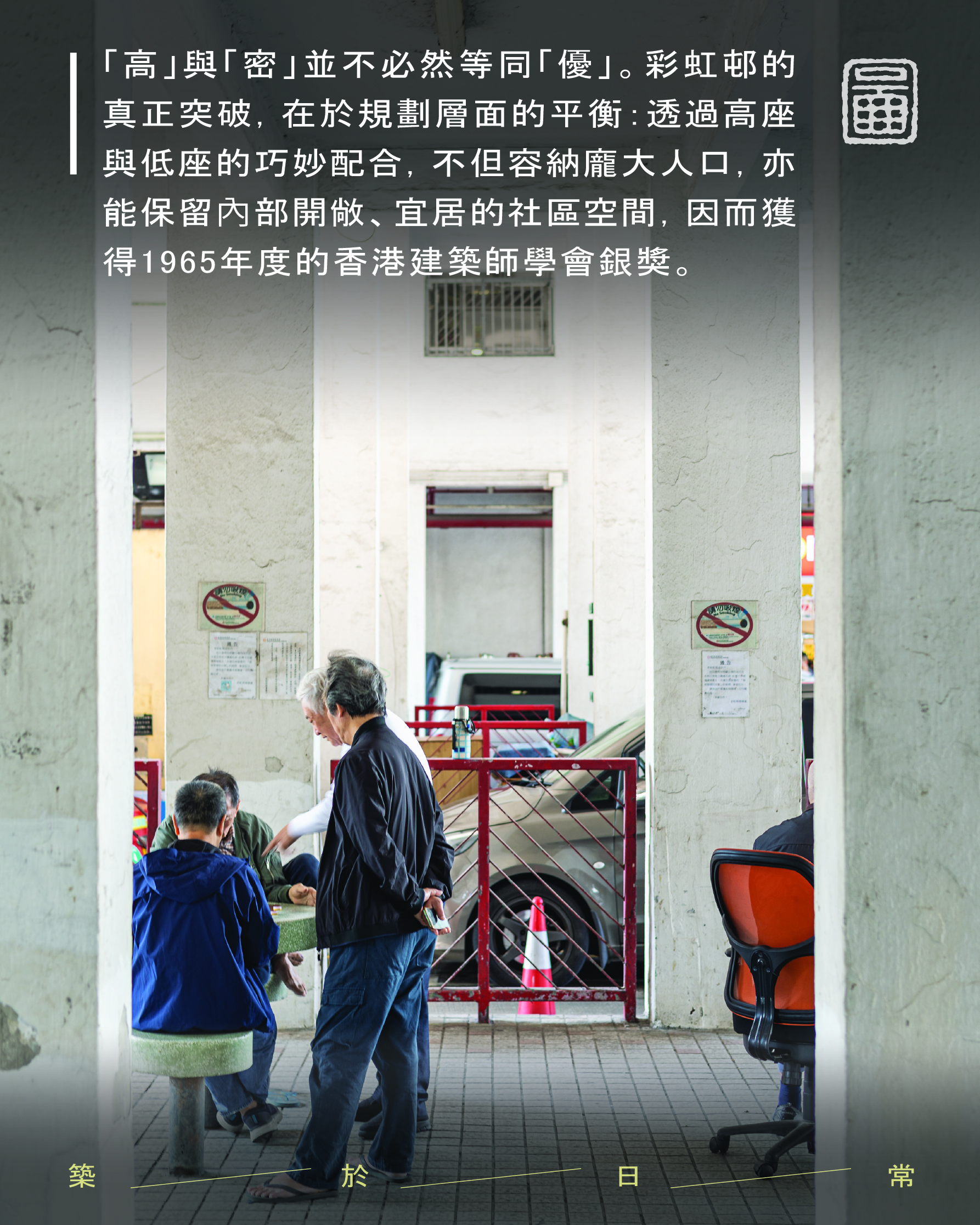 彩虹村的设计因此获得1965年度的香港建筑师学会银奖(当年的年度最佳建筑奖项),评语强调其在效率与宜居性之间取得良好平衡。这个里程碑式的项目,象征着香港公共房屋自此展开以「社区为本」的规划模式:既满足单位数量的迫切需求,同时亦肯定公共空间在居民生活中的重要价值。