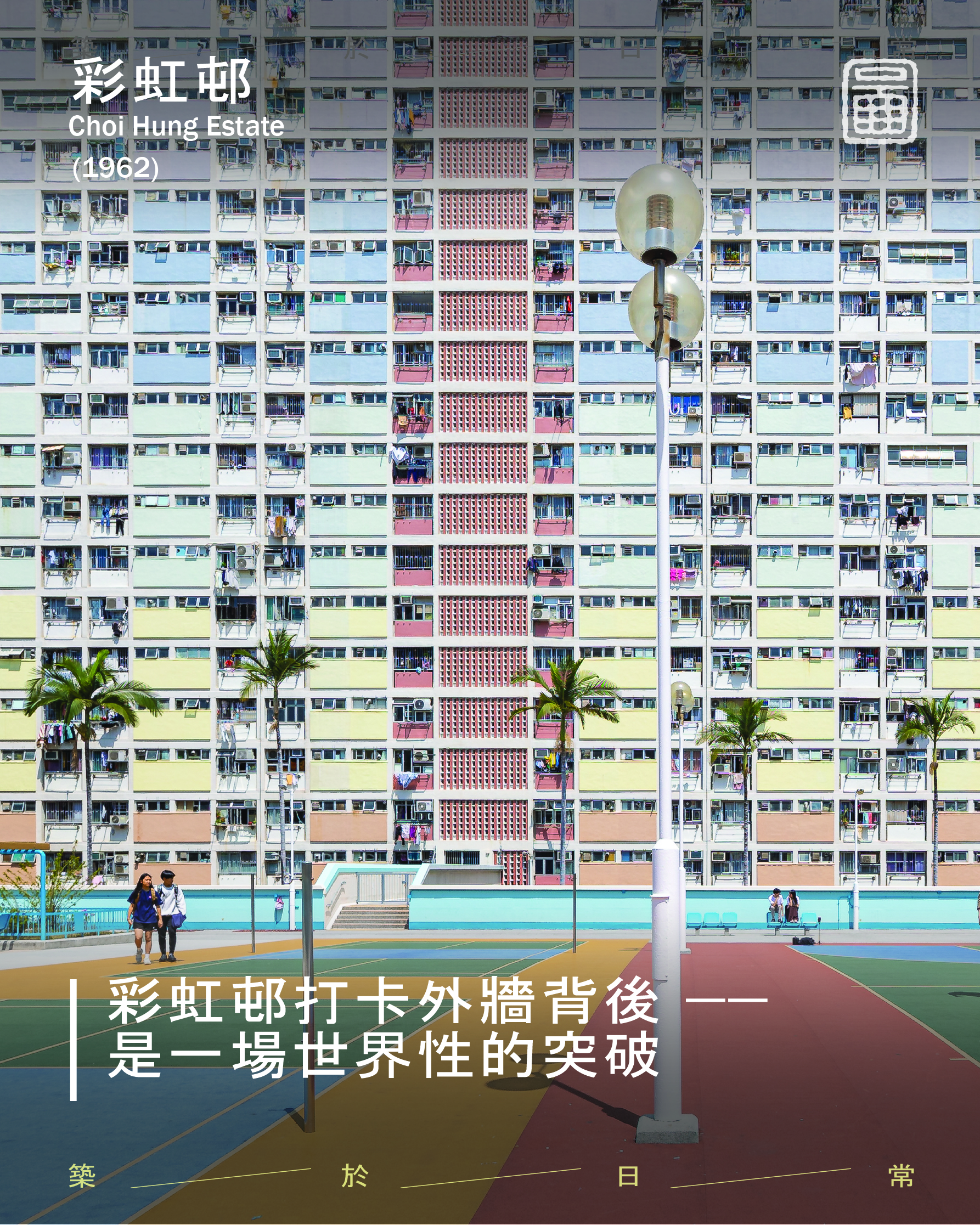 位于九龙的彩虹村在1962至1964年间兴建,由香港历史最悠久的建筑设计公司之一巴马丹拿(Palmer & Turner)设计,项目建筑师为 Ar. Ian Campbell 与 Ar. Dick N Pang。其规划手法呼应了当时流行于国际现代主义里「光辉城市」的理念,与伦敦的 Hallfield Estate 有异曲同工之处,但同时因应香港的高密度环境、亚热带气候及社会需求,体现出本地化的设计之别。彩虹村亦是香港首个体现「自给自足」理念的公共屋村,原规划中包含38间商铺、4所学校、银行、邮局等,以及大面积绿化与社区空间,为居民提供完善的日常所需。