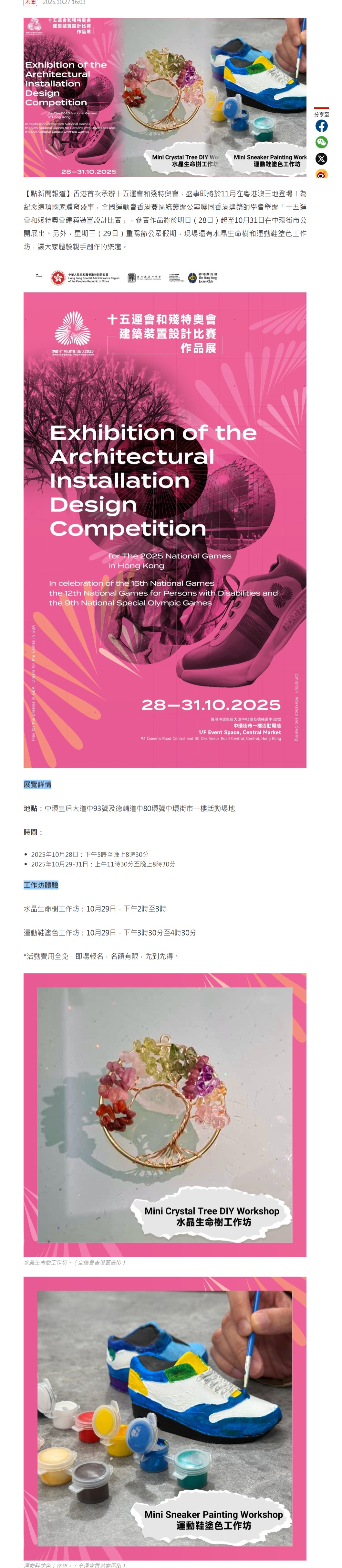 全运会|中环街市明起呈现建筑装置设计展 免费工作坊等你来! 点新闻 港闻 https://www.dotdotnews.com/a/202510/27/AP68ff273ce4b0b4fa5c130d0a.html